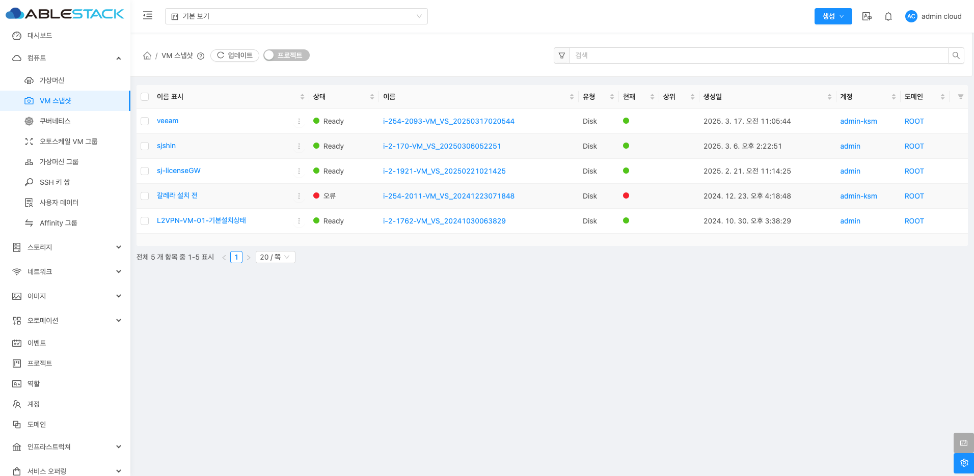 생성된 스냅샷의 이름, 상태, 이름 표시, 유형, 현재(상태), 생성 날짜, 계정, 도메인 등을 조회할 수 있으며, 특정 스냅샷을 선택하면 해당 VM의 정보와 생성 시점 등의 세부 정보를 확인할 수 있습니다.