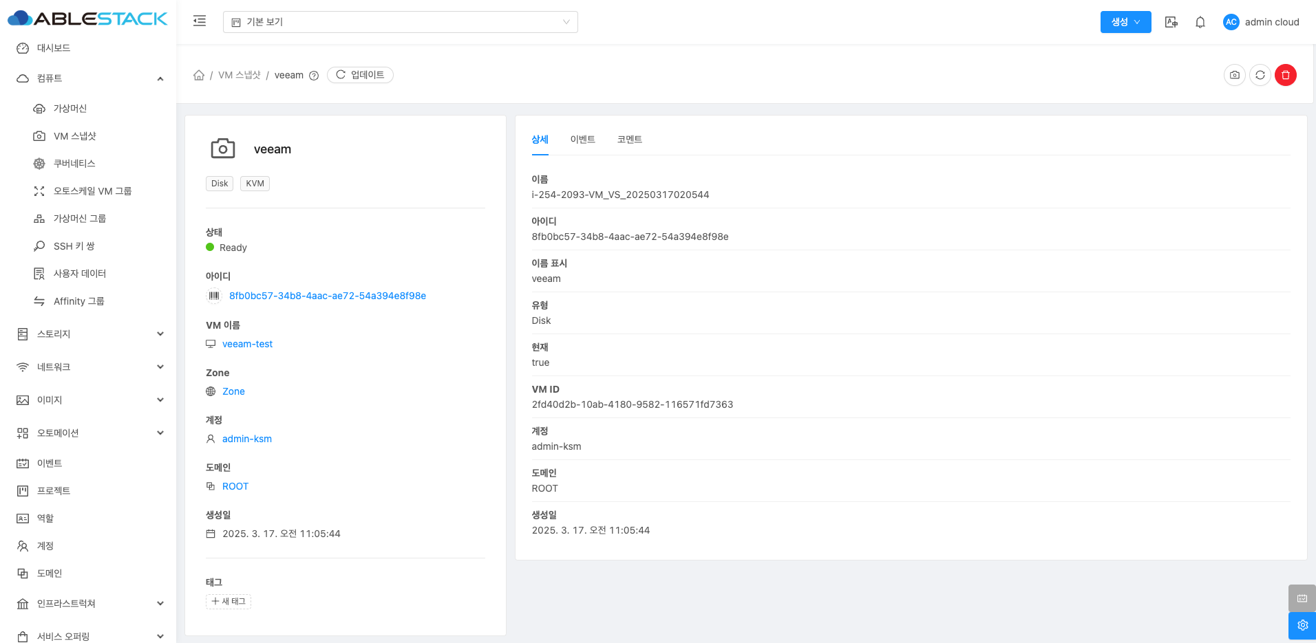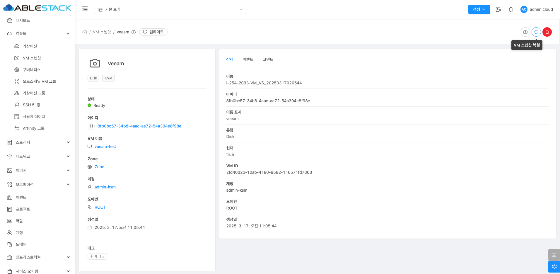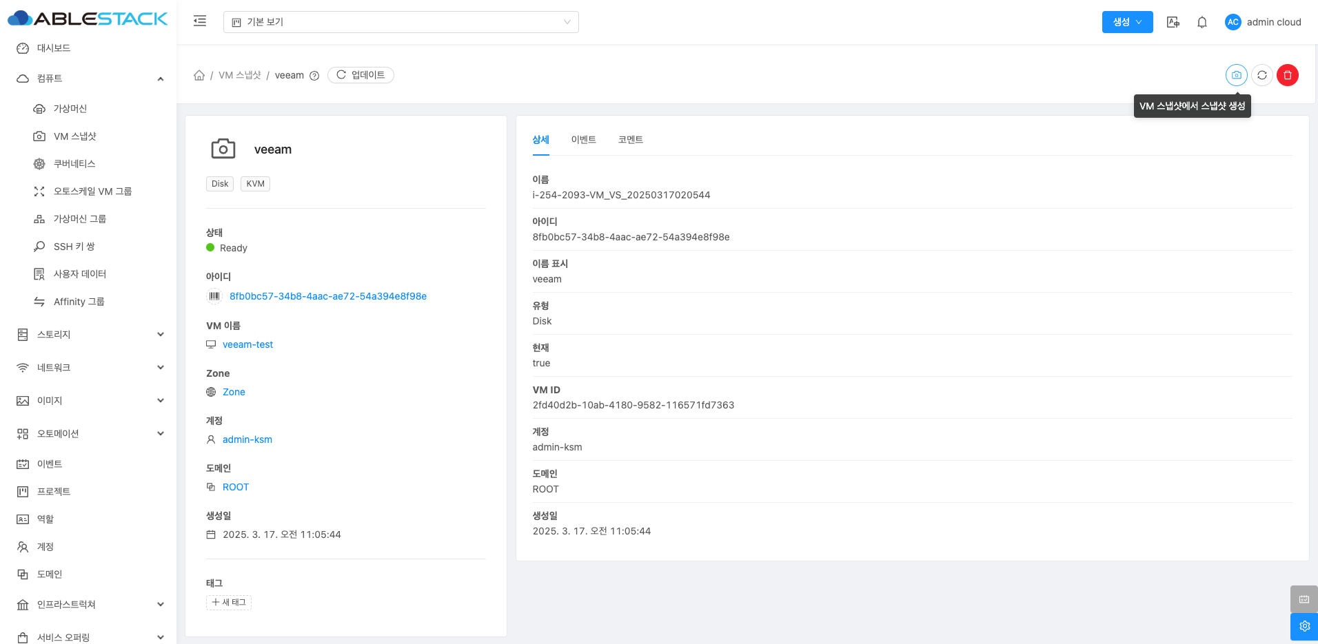 VM 스냅샷 클러스터에 대한 상세 정보를 확인하는 화면입니다. 우측 화면에서 이름, 아이디, 이름표시, 유형, 현재(상태), VM ID, 계정, 도메인, 생성일 등 상세 정보를 확인할 수 있습니다.