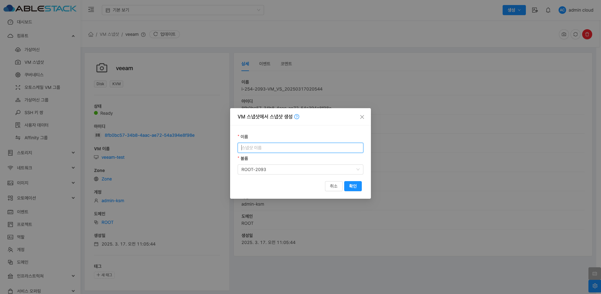 VM 스냅샷 상세 화면 오른쪽 상단의 VM 스냅샷에서 스냅샷 생성 버튼을 클릭하여 스냅샷을 생성합니다. 기존 VM 스냅샷 기능과 비교하여 특정 인스턴스의 스냅샷에서 새로운 볼륨 스냅샷을 생성하는 기능입니다. 이를 통해 기존 VM의 특정 시점 상태를 저장하고, 이후 해당 상태를 기반으로 개별 볼륨을 복구하거나 새로운 인스턴스를 배포하는 데 활용할 수 있습니다.