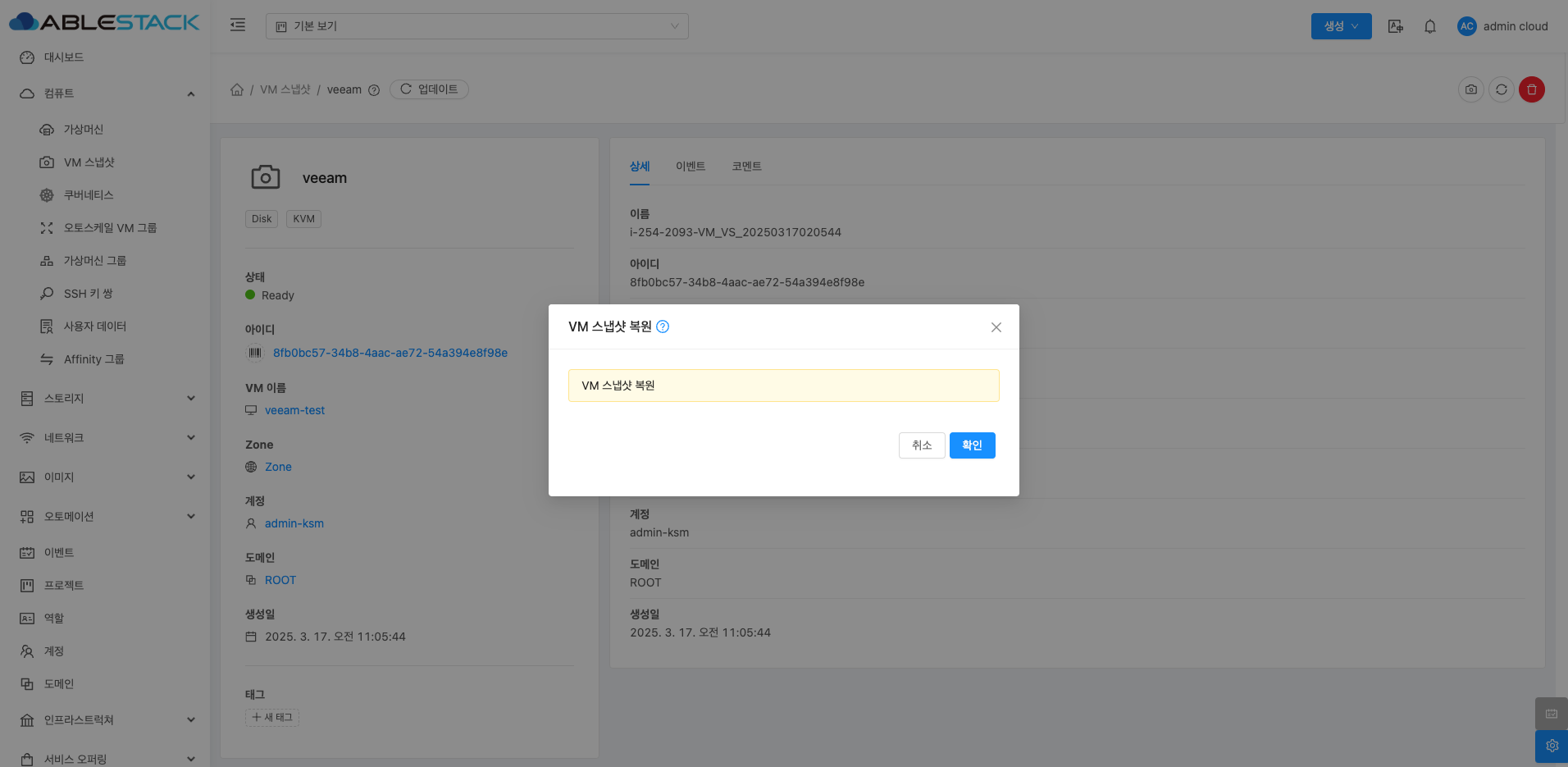 VM 스냅샷 상세 화면 오른쪽 상단의 VM 스냅샷 복원 버튼을 클릭하여 VM 스냅샷 복원 기능은 기존에 생성된 VM 스냅샷을 사용하여 해당 VM의 상태를 특정 시점으로 되돌리는 기능입니다. 복원을 수행하면 선택한 스냅샷이 포함하는 운영 체제, 애플리케이션, 데이터 등이 스냅샷 생성 시점의 상태로 복구됩니다. 이를 통해 시스템 장애나 설정 오류 발생 시 빠르게 복구할 수 있으며, VM을 동일한 상태로 여러 번 재구성할 때도 활용할 수 있습니다.