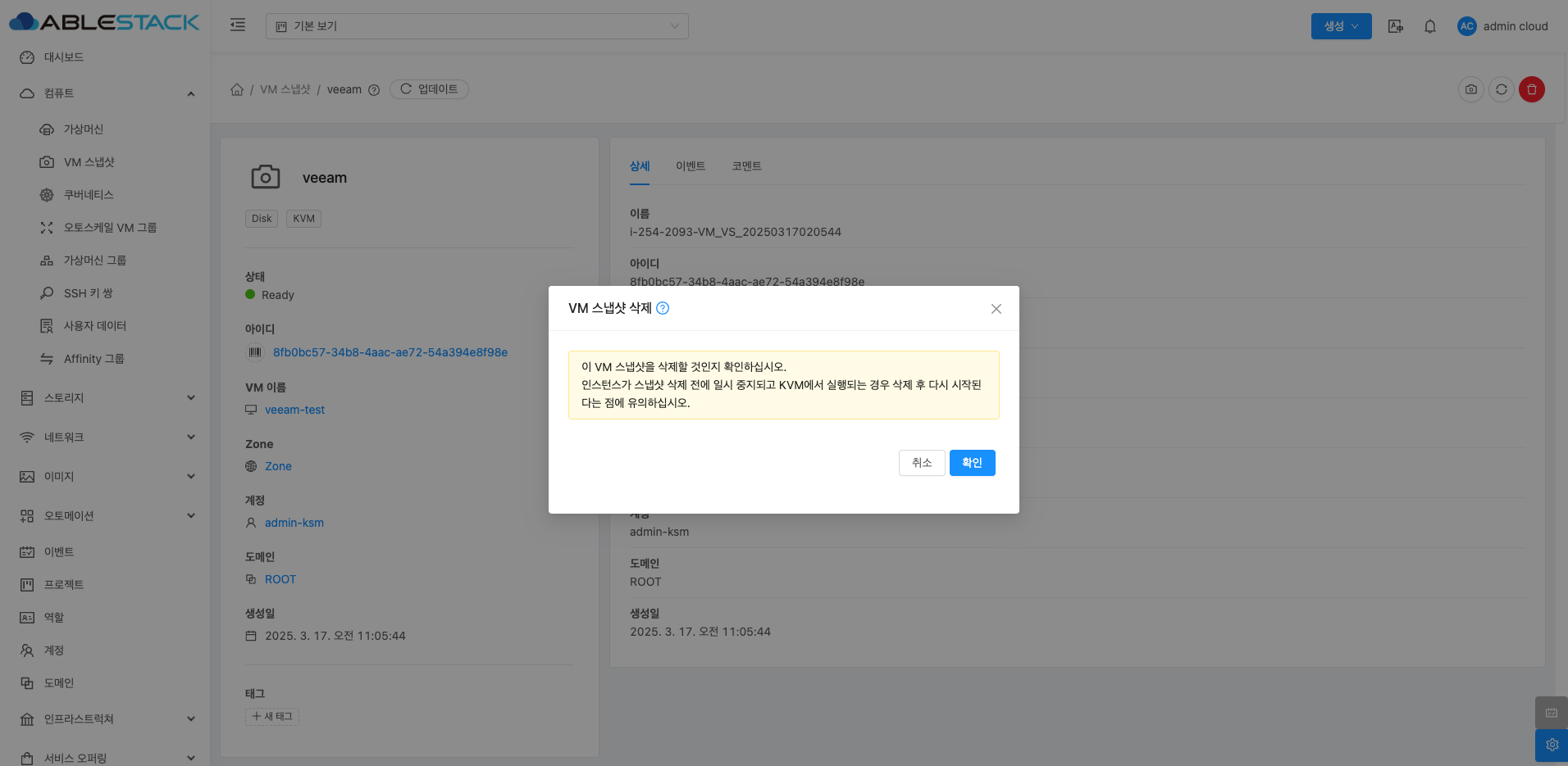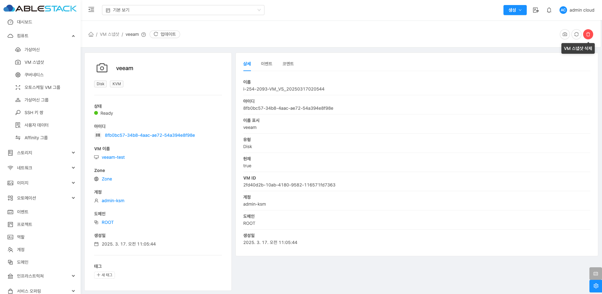 VM 스냅샷 상세 화면 오른쪽 상단의 VM 스냅샷 삭제 버튼을 클릭하여 VM 스냅샷을 삭제할 수 있습니다.