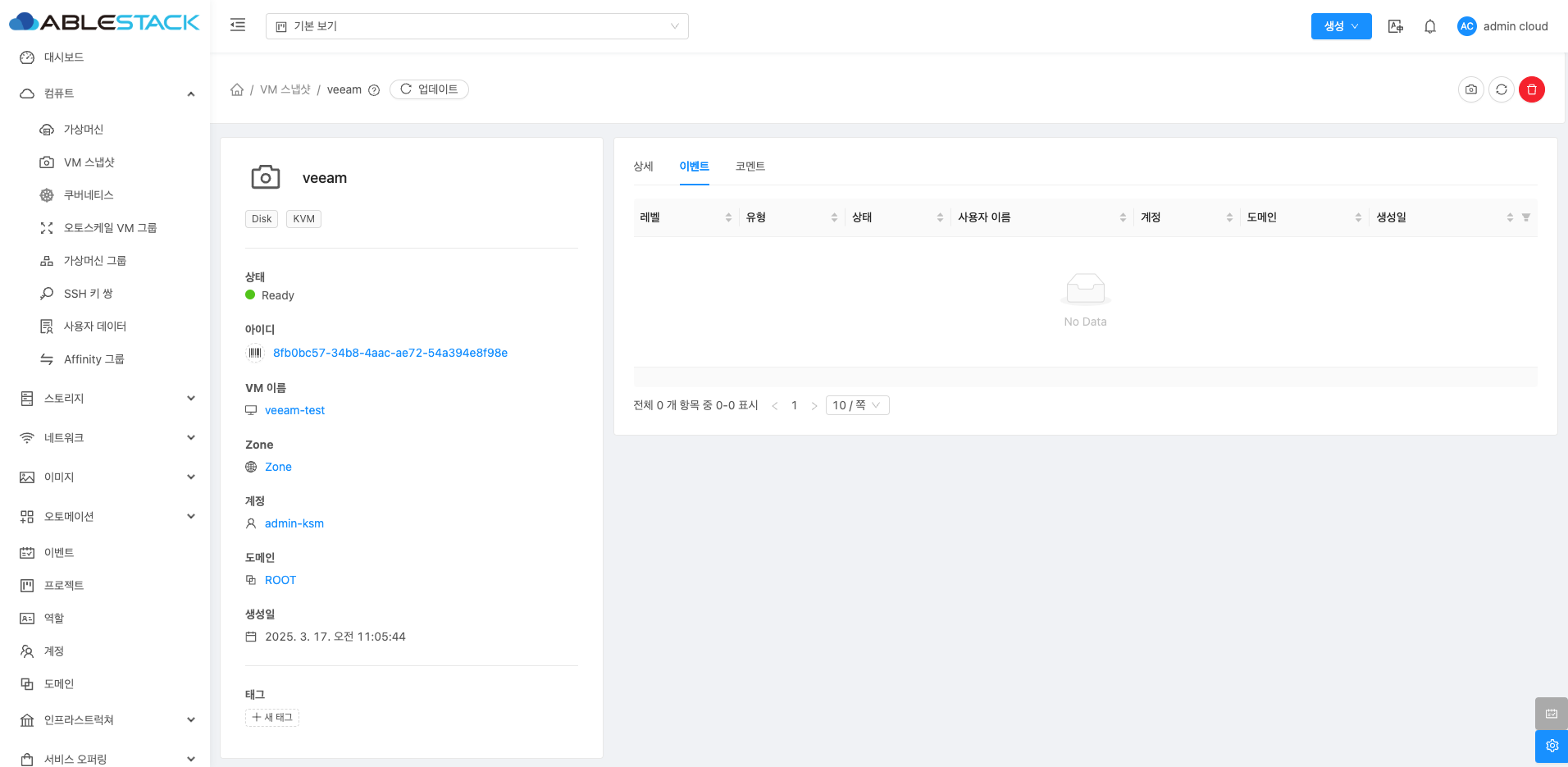 VM 스냅샷 클러스터에 대한 이벤트를 확인하는 화면입니다.
