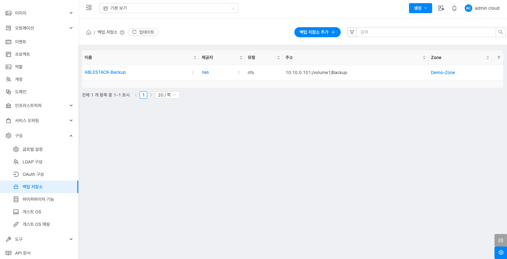 백업 저장소 화면에서는 백업 저장소 목록을 확인하고 관리할 수 있습니다.