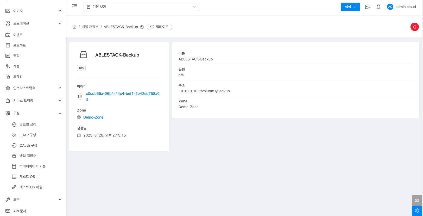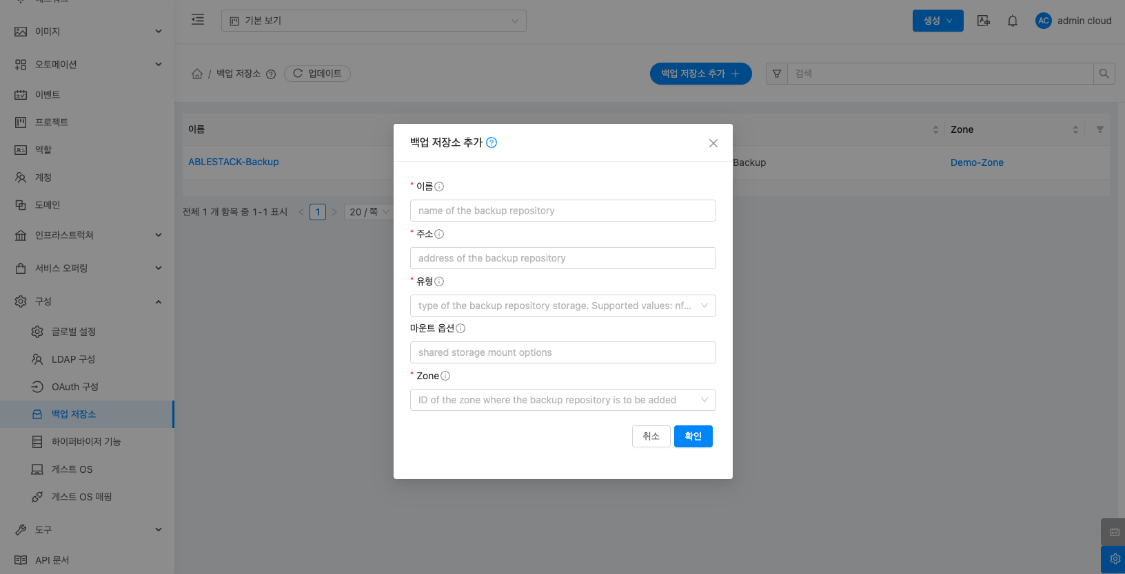 - 백업 활성화 필수: 백업 프레임워크를 활성화해야 백업 저장소 메뉴가 활성화됩니다. (글로벌 설정에서 backup.framework.enabled 옵션 활성화)