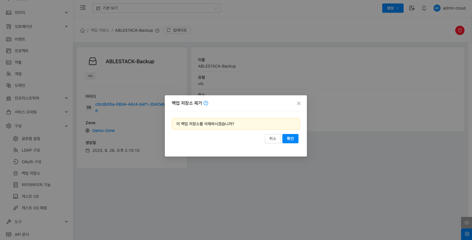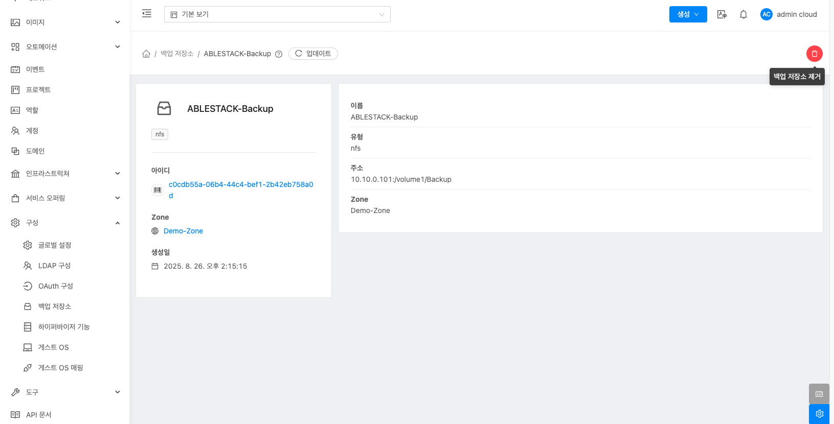 백업 저장소 제거 버튼을 클릭하여 추가된 백업 저장소를 제거할 수 있습니다.