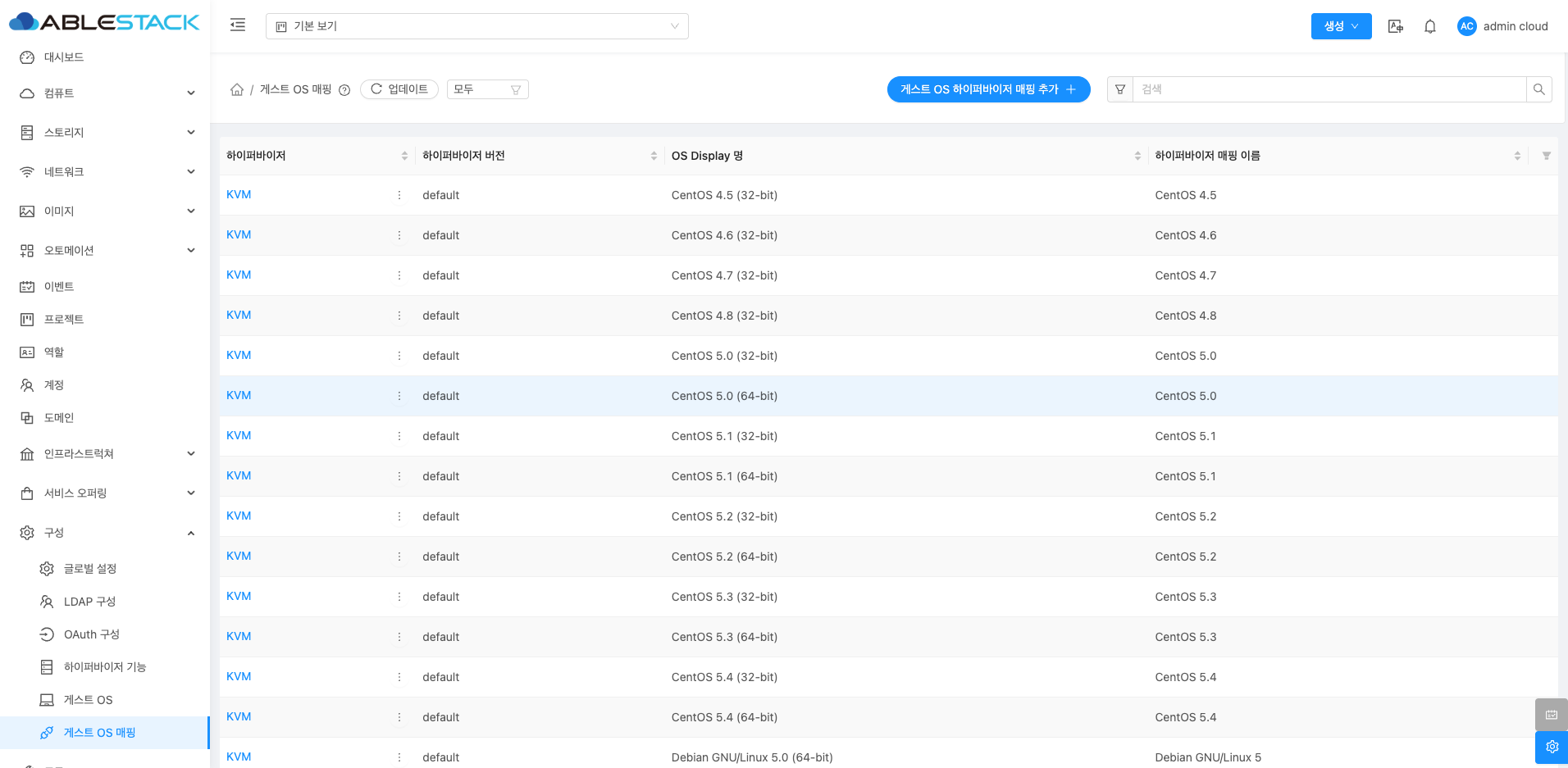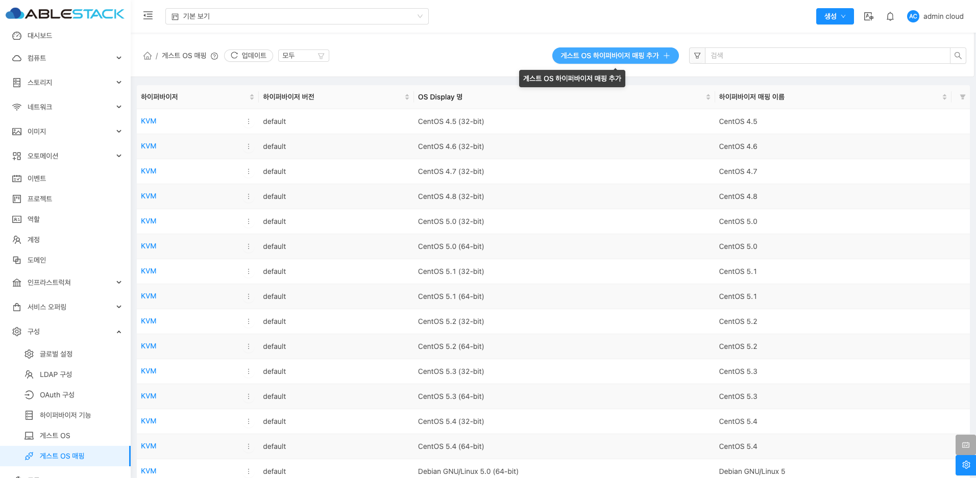 현재 등록된 모든 게스트 OS 매핑이 표시됩니다. 목록에는 하이퍼바이저, 하이퍼바이저 버전, OS Display 명, 하이퍼바이저 매핑 이름 정보가 포함됩니다.