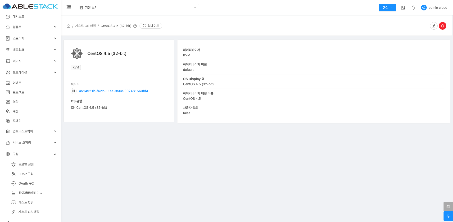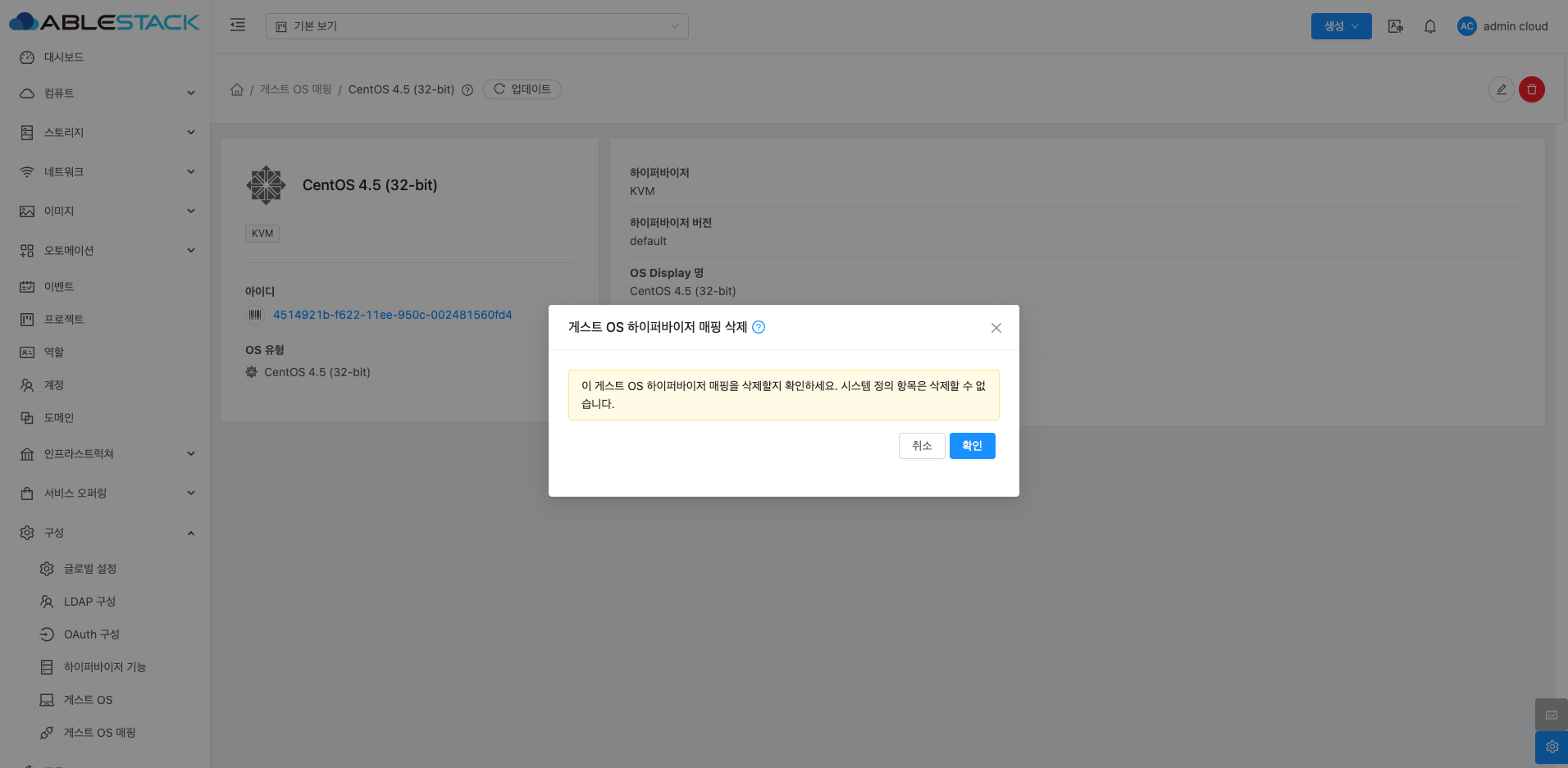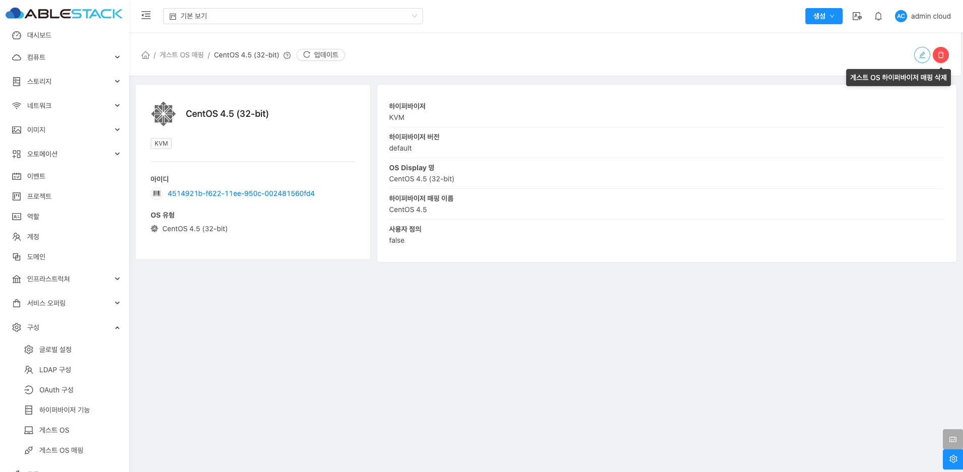 게스트 OS 하이퍼바이저 매핑 상세 화면 오른쪽 상단의 삭제 버튼을 클릭하여 추가된 게스트 OS 하이퍼바이저 매핑을 삭제할 수 있습니다. 하지만 시스템에서 기본적으로 제공하는 시스템 정의 항목은 삭제할 수 없습니다.