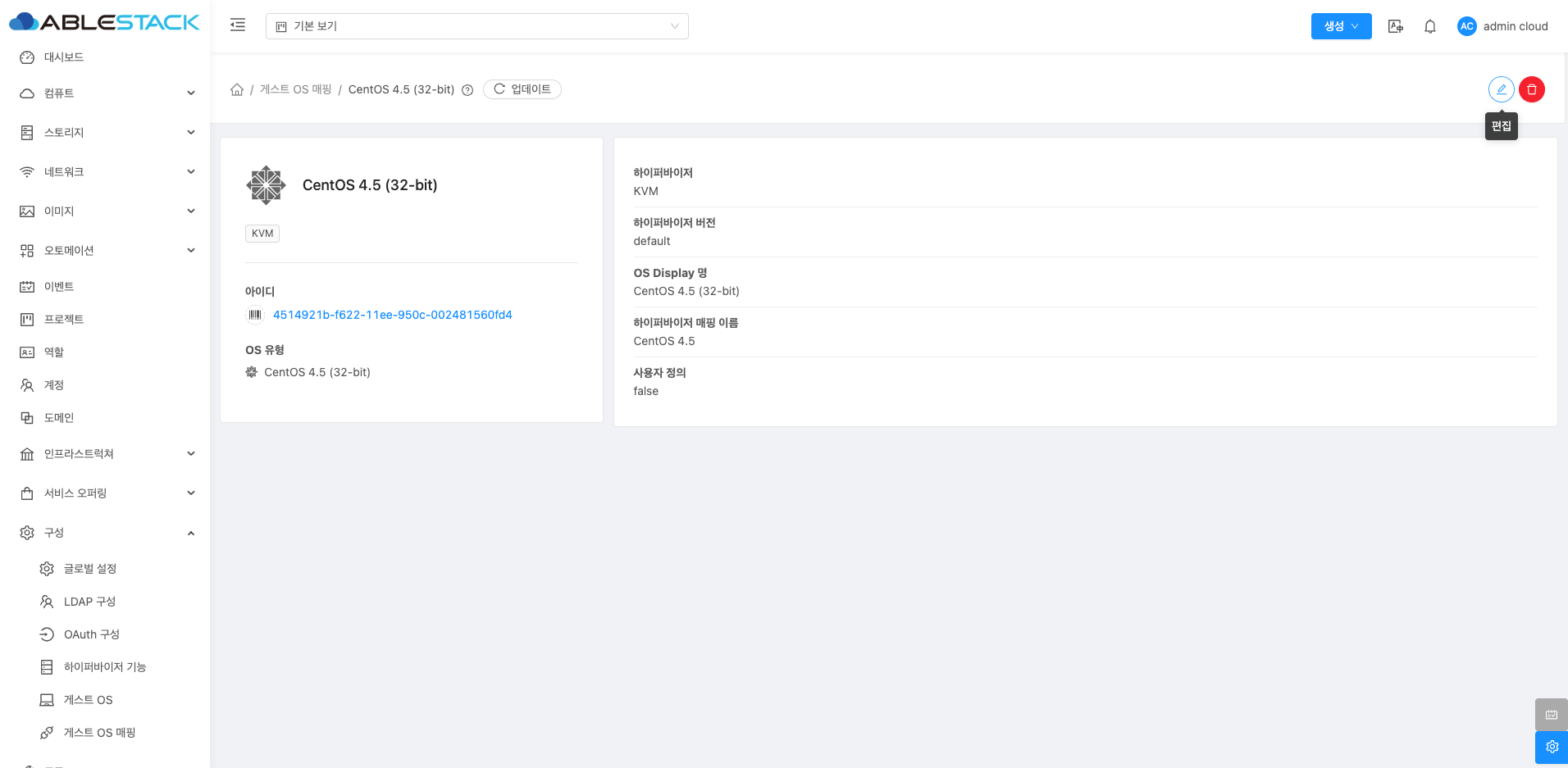 게스트 OS 하이퍼바이저 매핑 상세 화면 오른쪽 상단의 편집 버튼을 클릭하여 해당 게스트 OS 하이퍼바이저 매핑 정보를 편집할 수 있습니다.