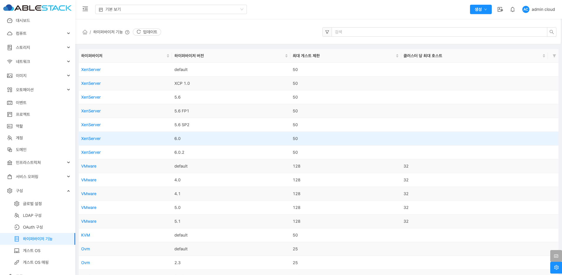 하이퍼바이저 버전 각 하이퍼바이저 유형별로 지원되는 버전이 나열됩니다.