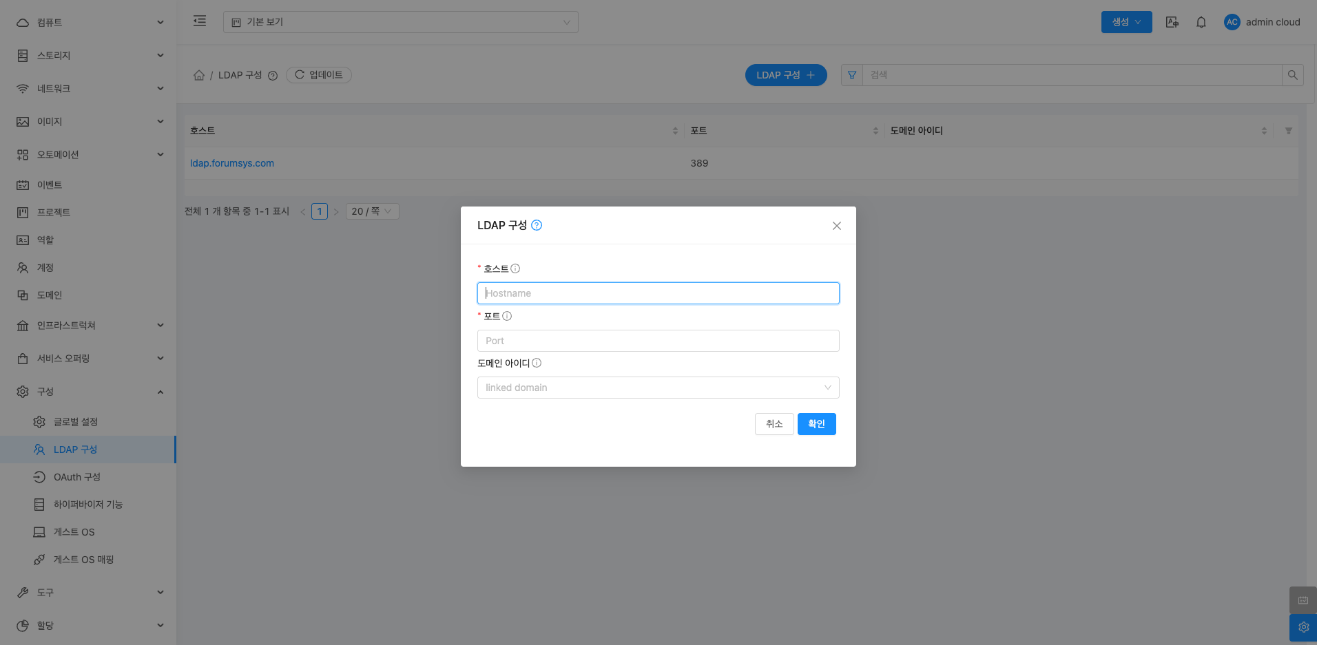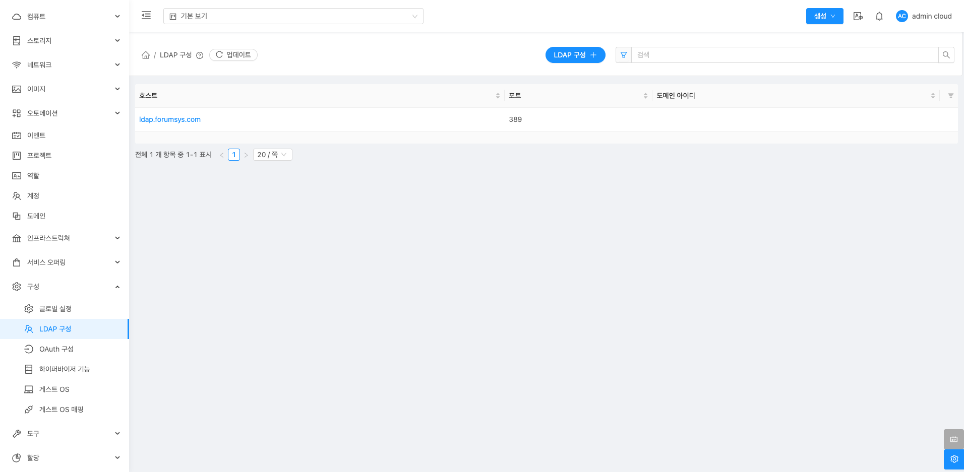 LDAP 구성 화면에서는 LDAP 서버 설정 목록을 확인하고 관리할 수 있습니다.