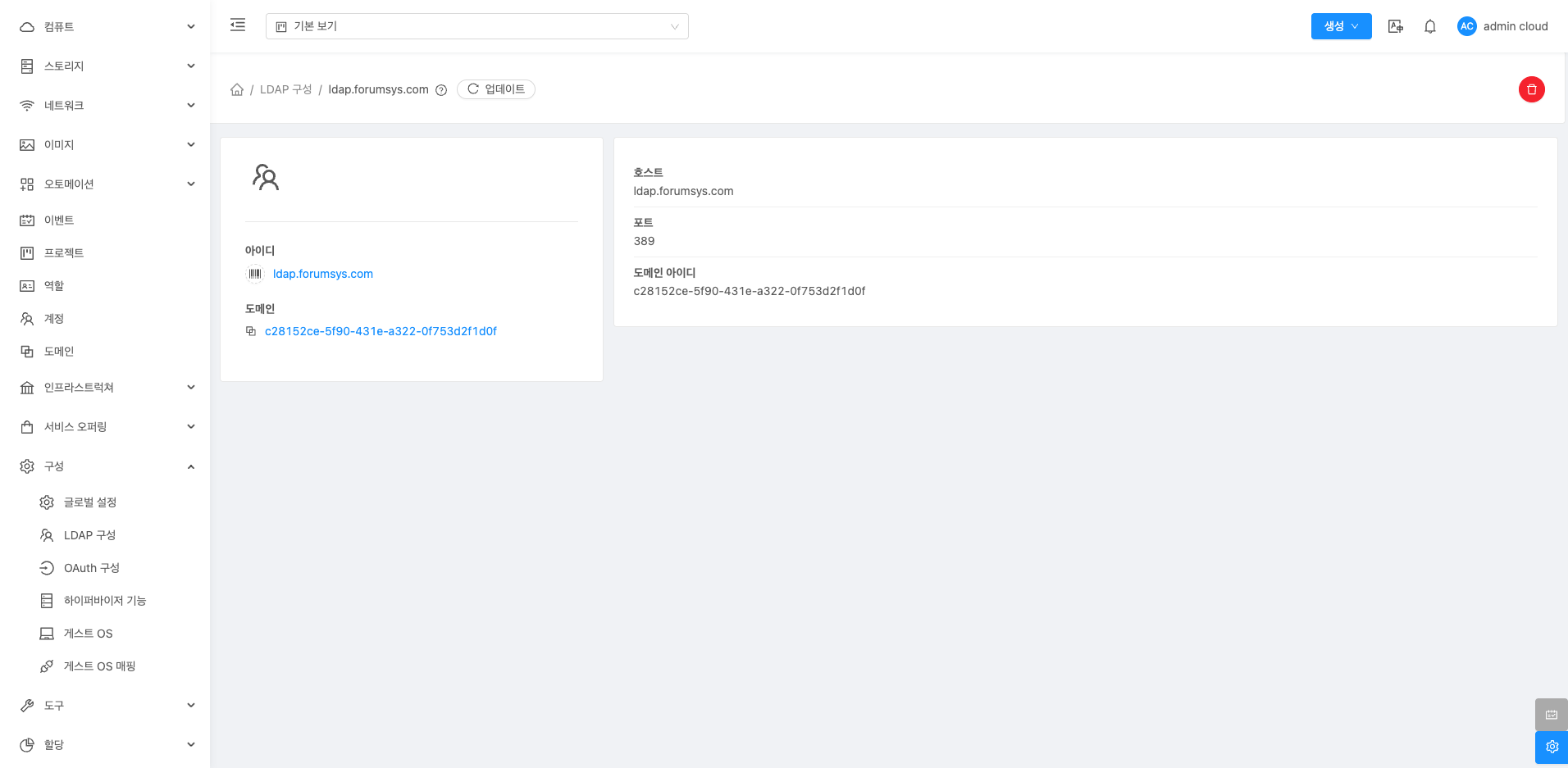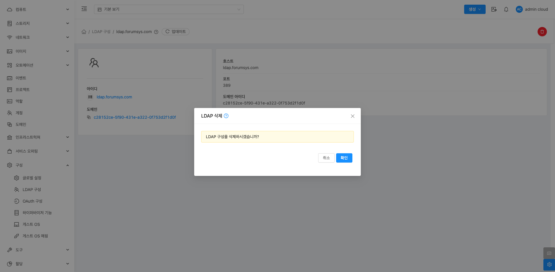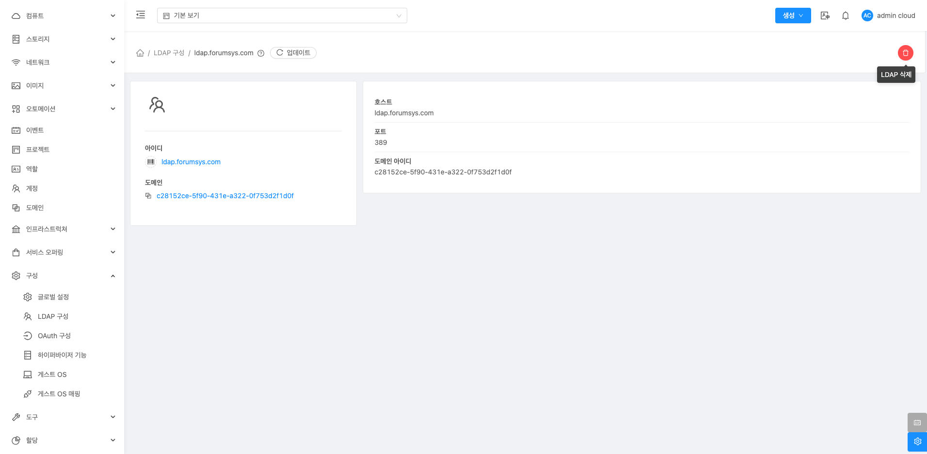 LDAP 삭제 버튼을 클릭하여 추가된 LDAP 서버를 삭제할 수 있습니다.