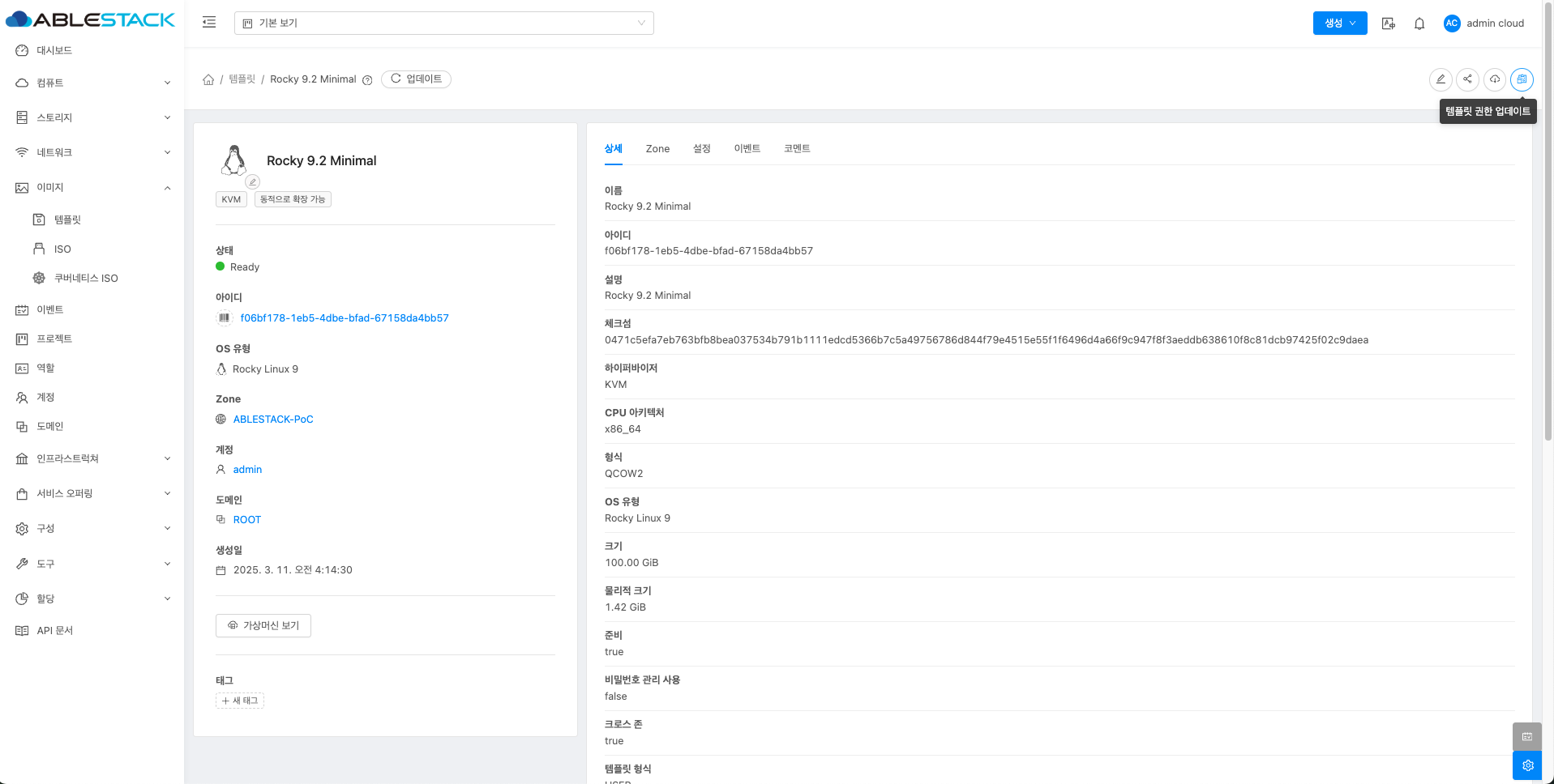 템플릿을 업데이트하면 새로운 가상 머신 배포에만 적용되며 기존 VM에는 영향을 주지 않습니다. 또한 기본 디스크 크기, 네트워크 설정, 부팅 옵션 등을 미리 지정할 수 있어 운영 환경을 표준화하고 배포 속도를 높이는 데 유용합니다.