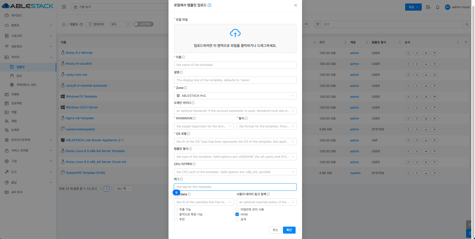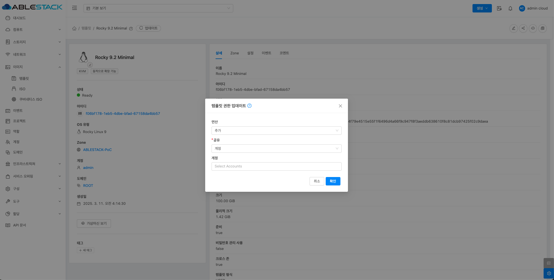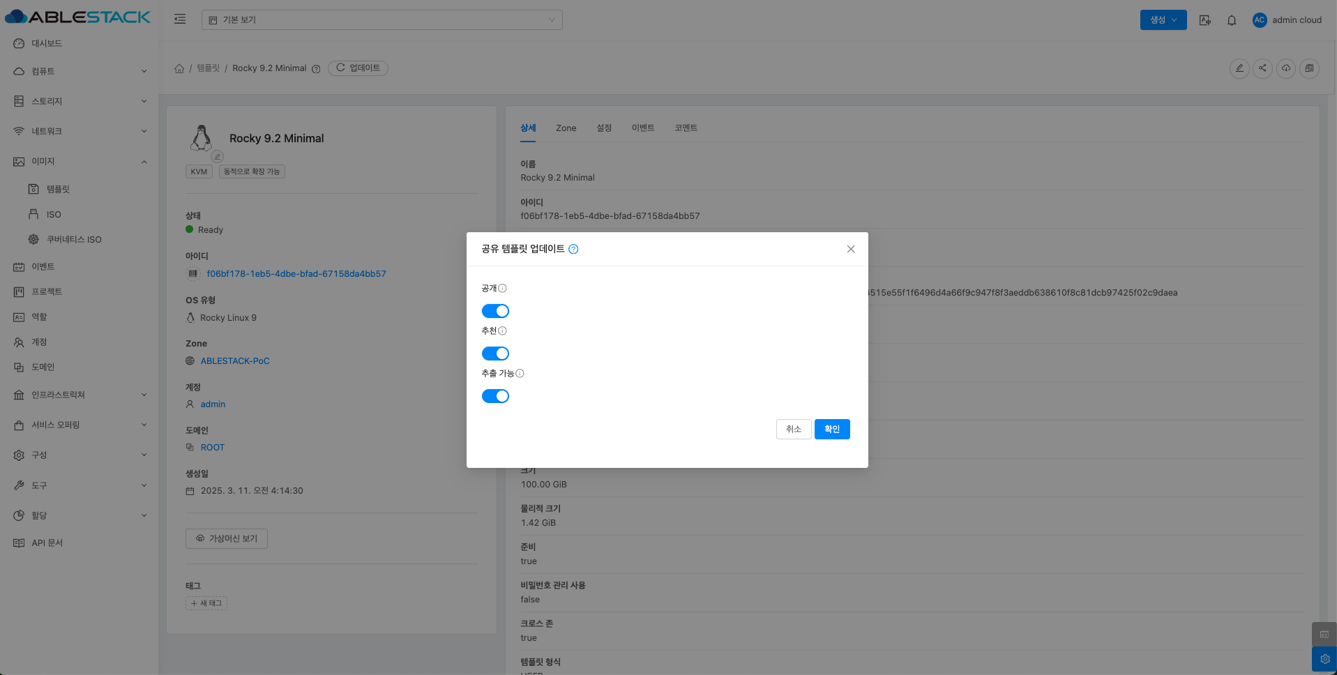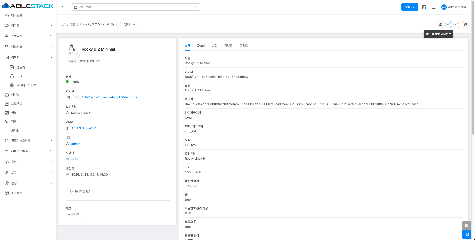 공용 템플릿은 모든 사용자와 공유되며, 개인 템플릿은 생성한 사용자만 사용할 수 있고, 공유 템플릿은 특정 계정이나 도메인과 공유할 수 있습니다. 템플릿은 템플릿에서 생성하거나 ISO 이미지를 이용해 직접 만들 수 있으며, KVM, VMware 등 다양한 하이퍼바이저에서 지원됩니다.