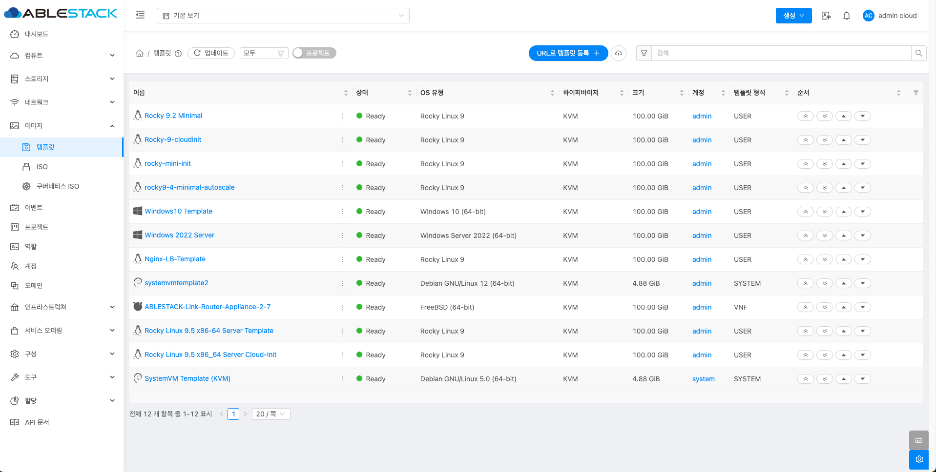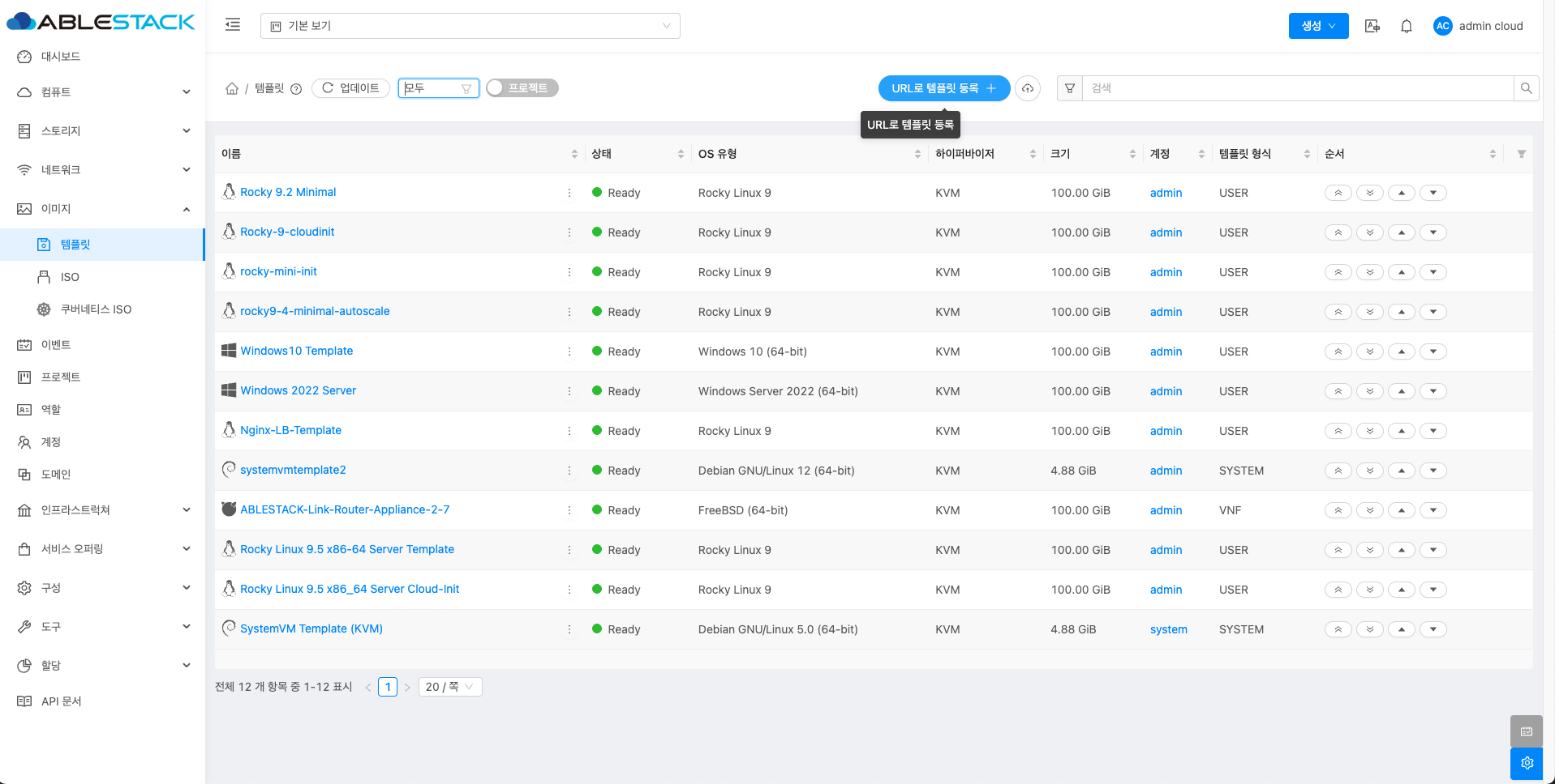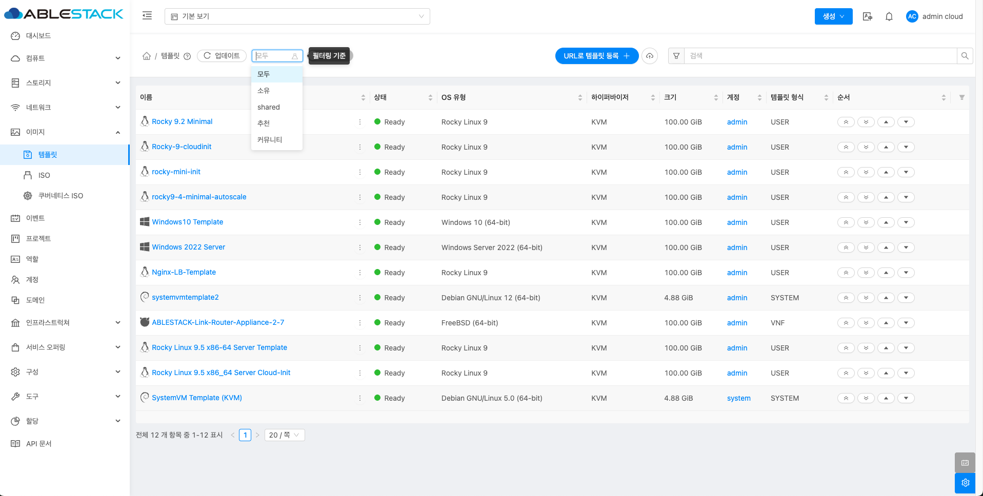 - system : 내부 기능을 위한 시스템 VM(console proxy vm, secondary storage vm)을 위한 템플릿