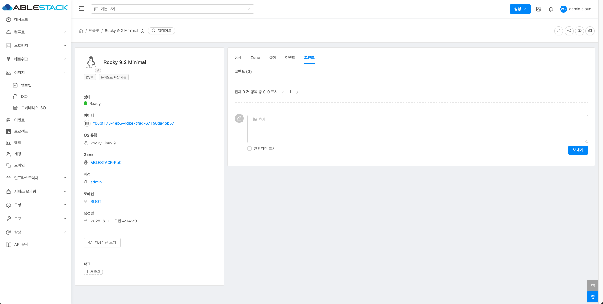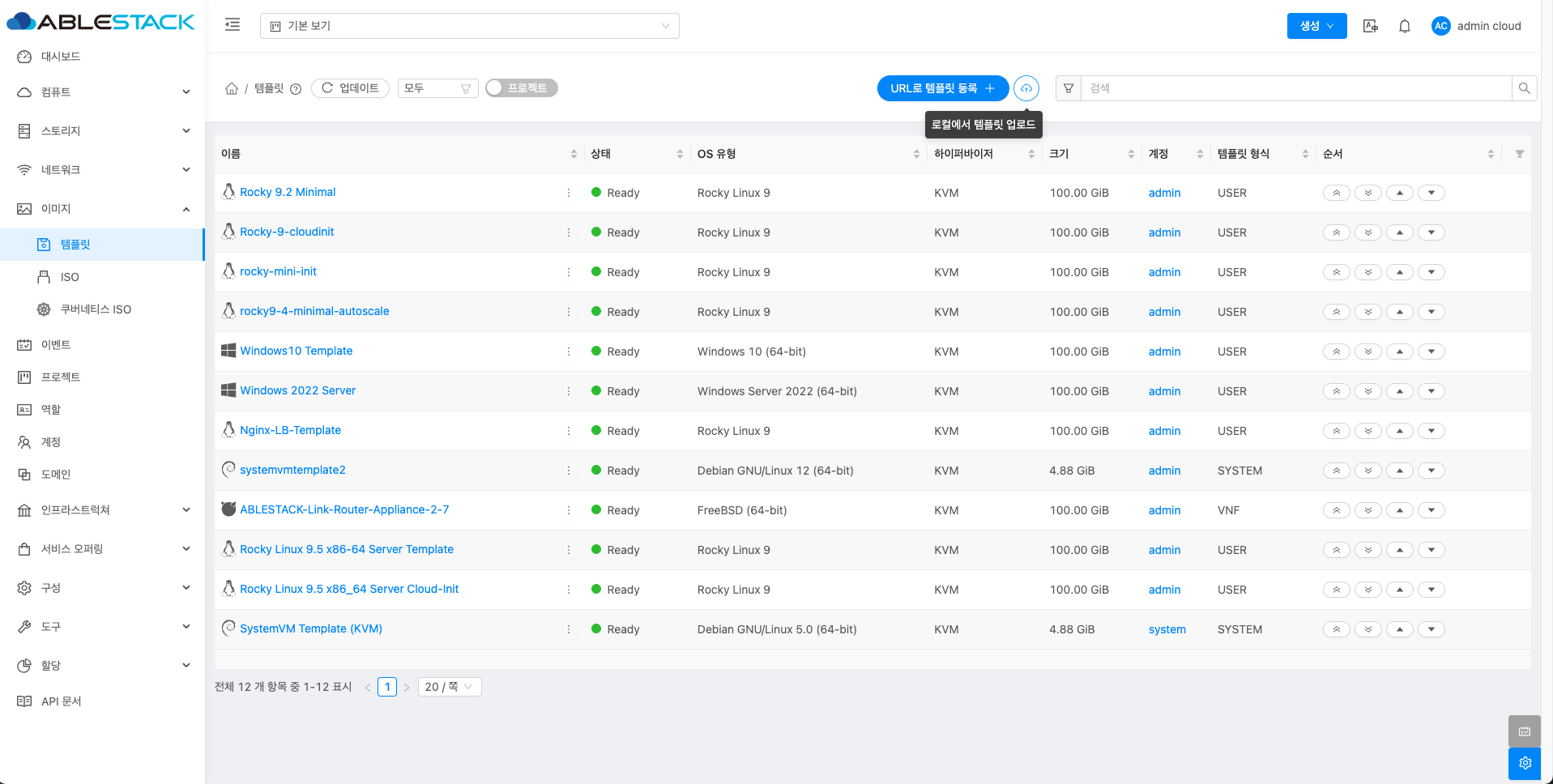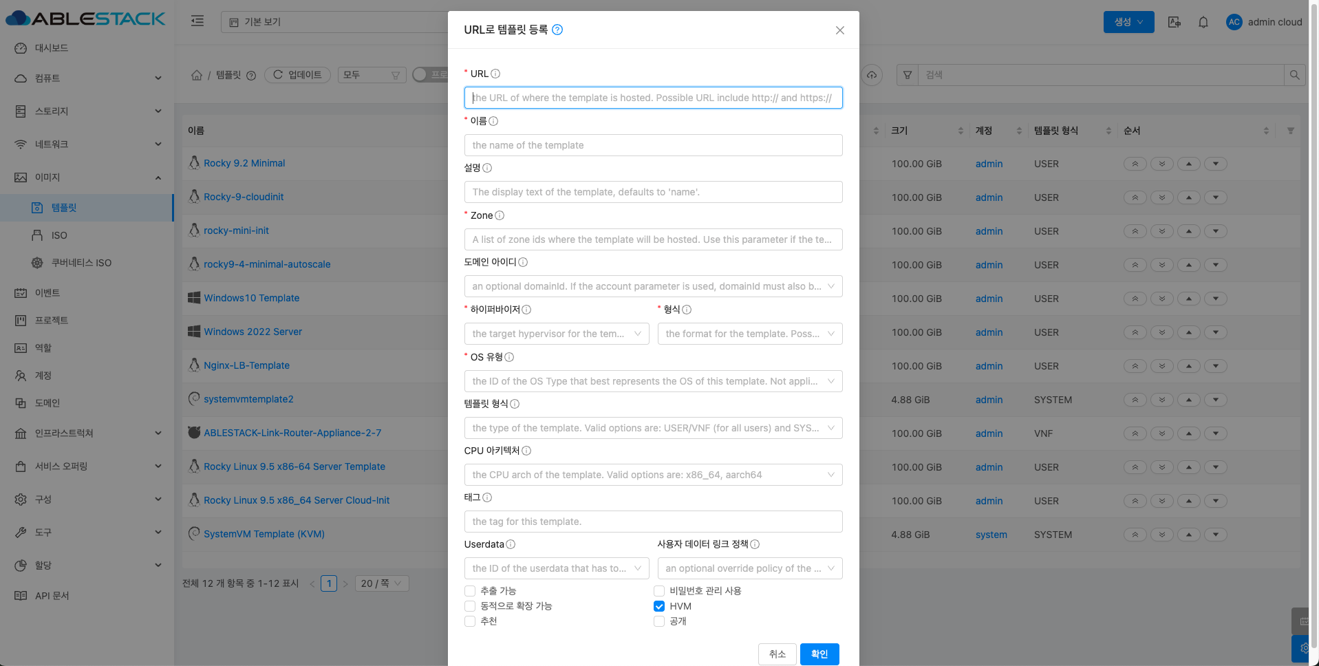 - system : 내부 기능을 위한 시스템 VM(console proxy vm, secondary storage vm)을 위한 템플릿