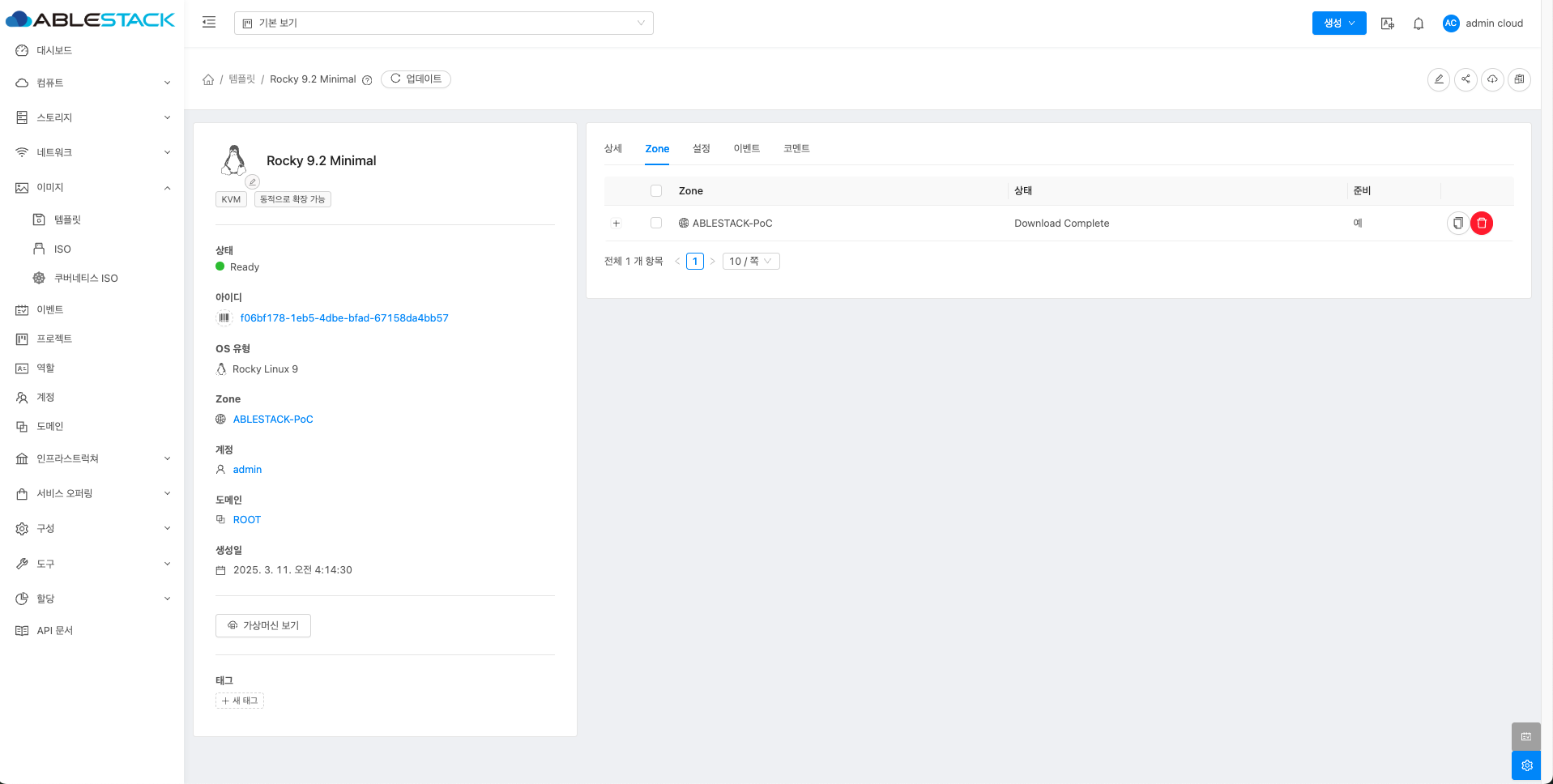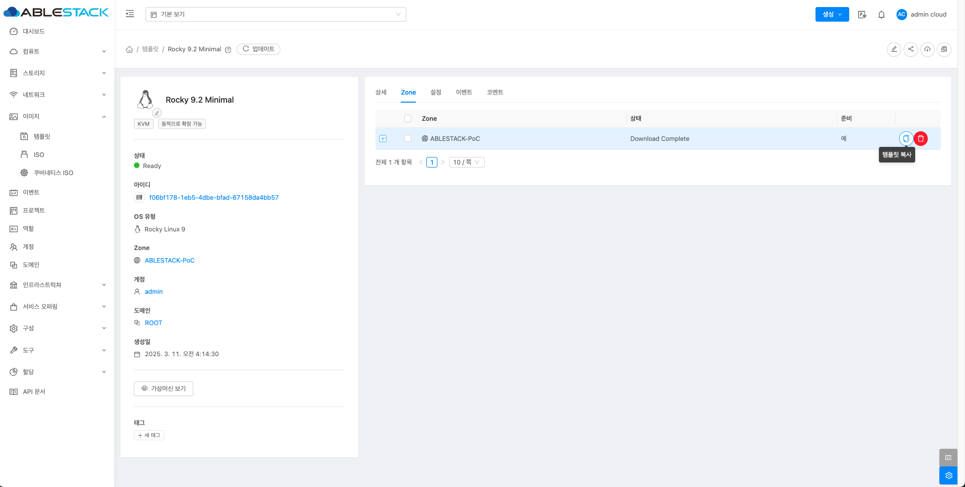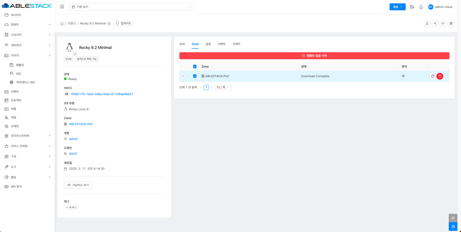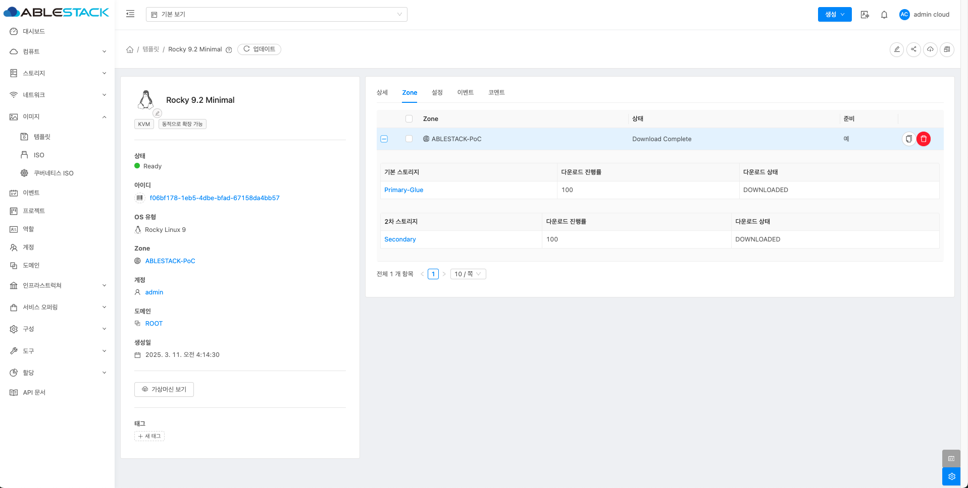 - 템플릿 Zone 정보에서 + 버튼을 클릭하시면 해당 다운로드가 진행된 스토리지와 진행률 그리고 상태를 확인할 수 있습니다.