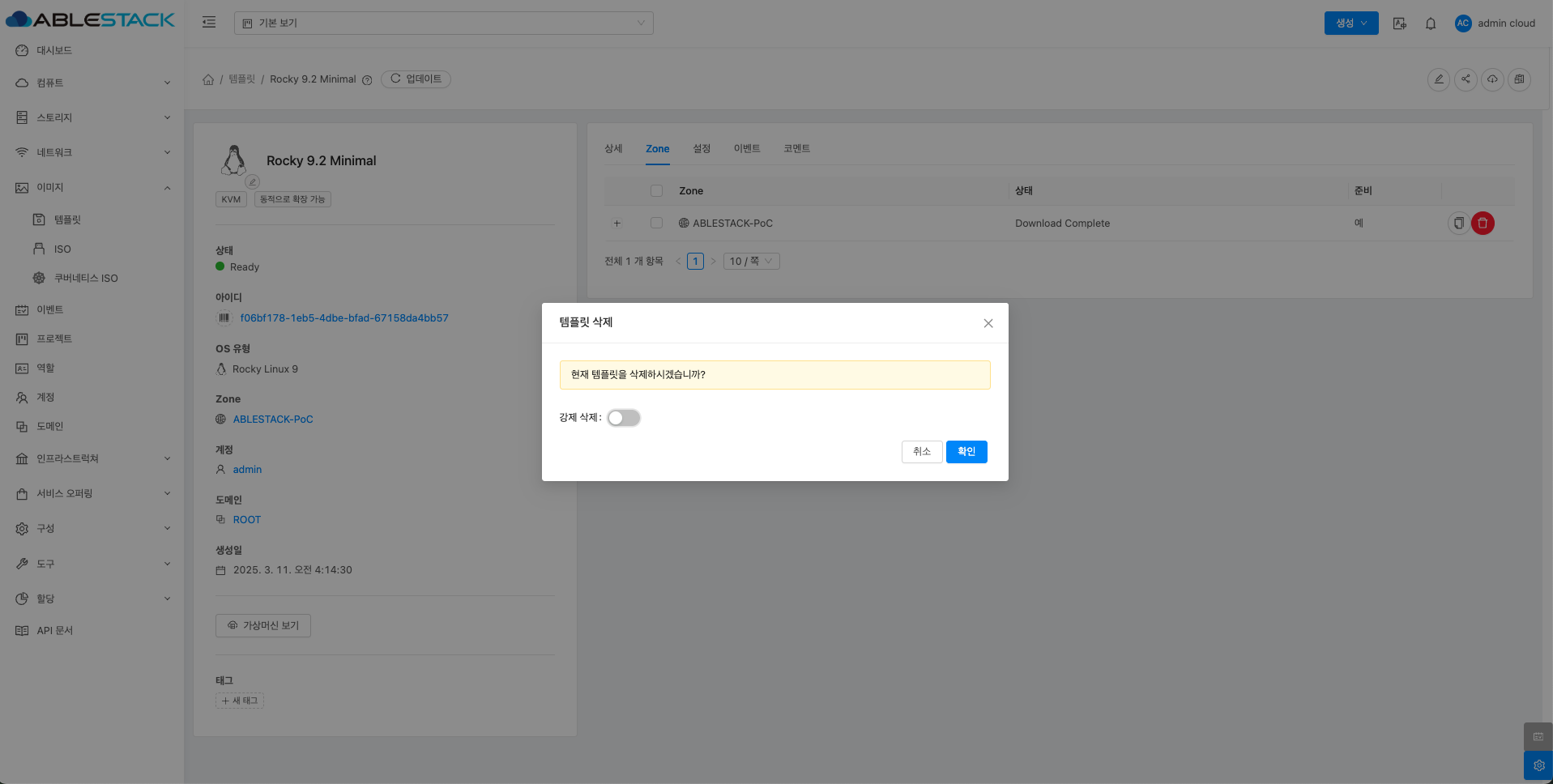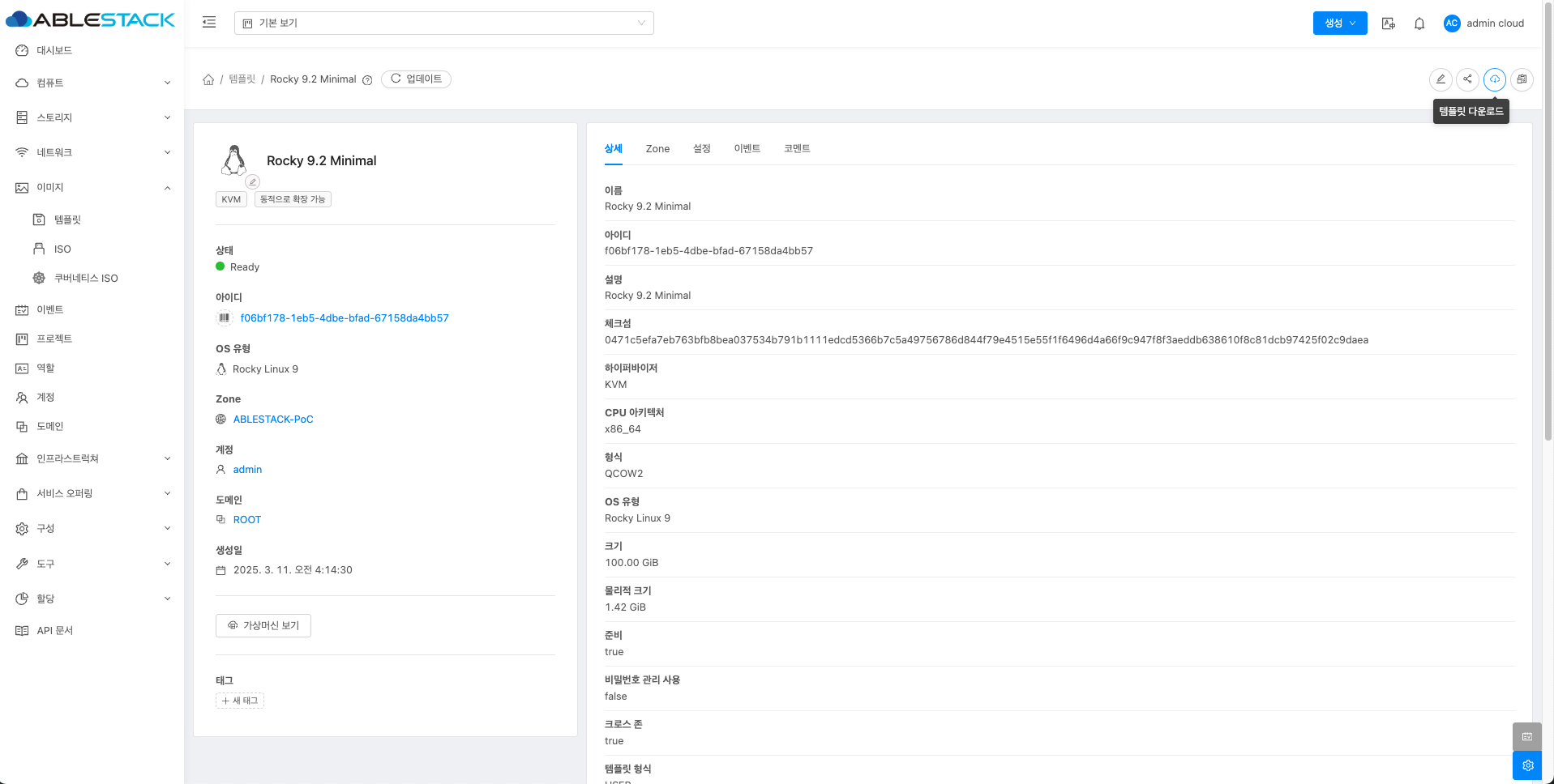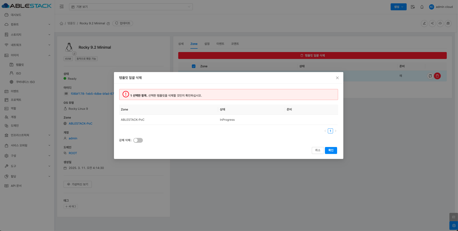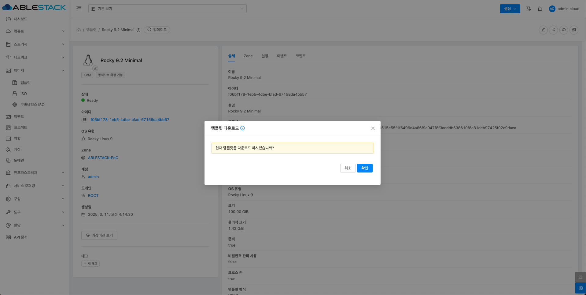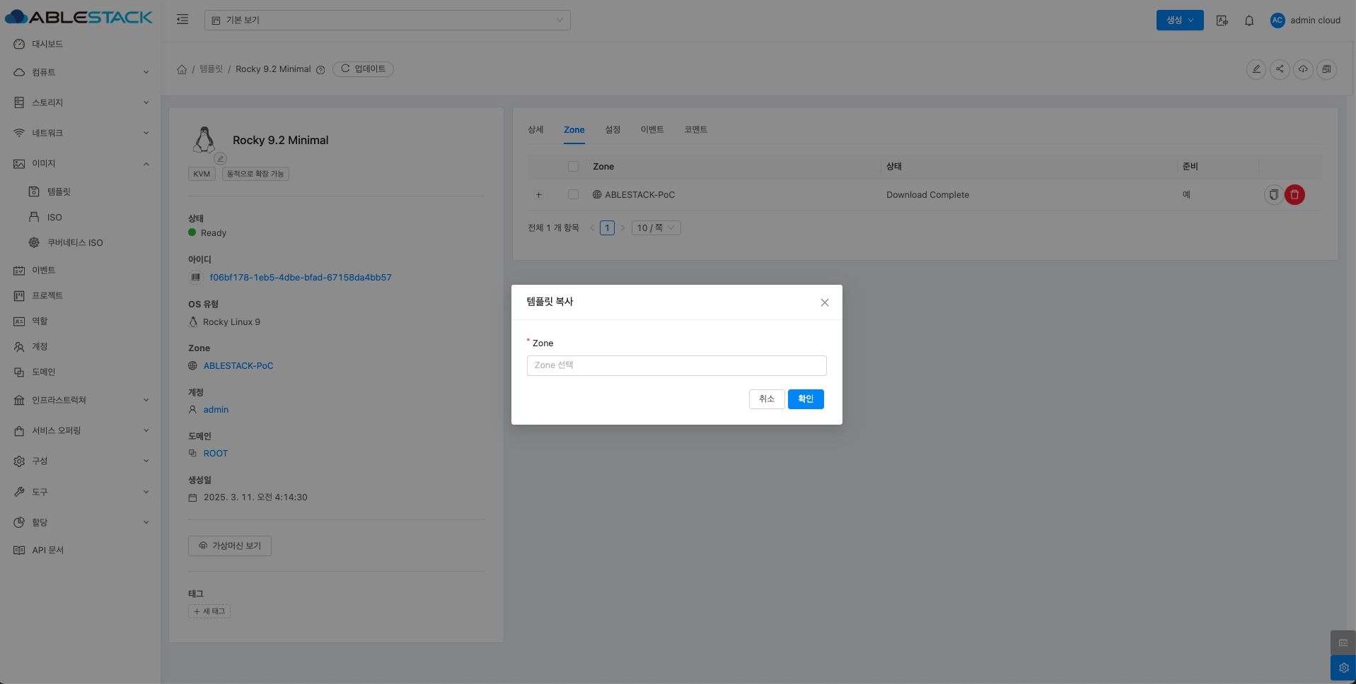 - 템플릿 Zone 정보에서 + 버튼을 클릭하시면 해당 다운로드가 진행된 스토리지와 진행률 그리고 상태를 확인할 수 있습니다.