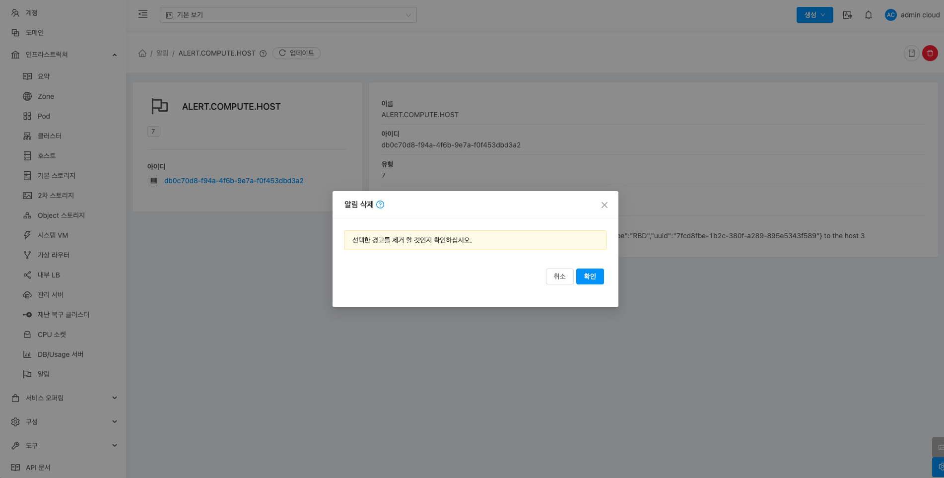 - 알림 삭제 버튼을 클릭하여 알림 삭제 화면을 호출합니다.