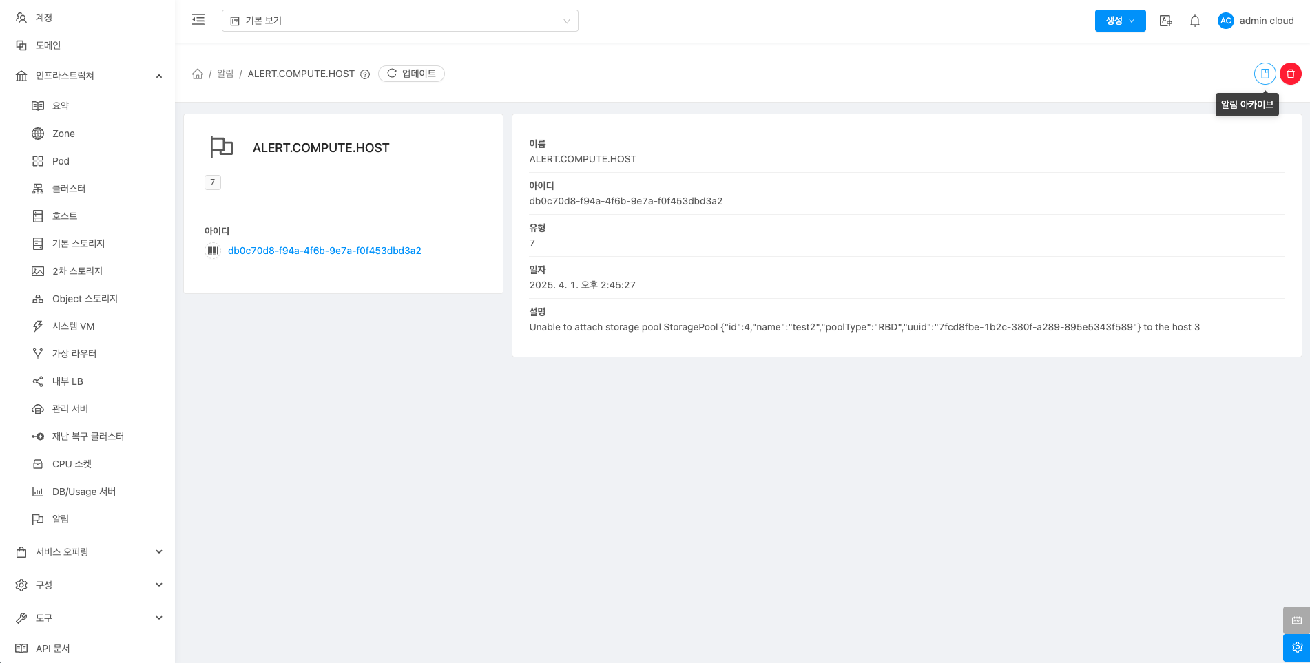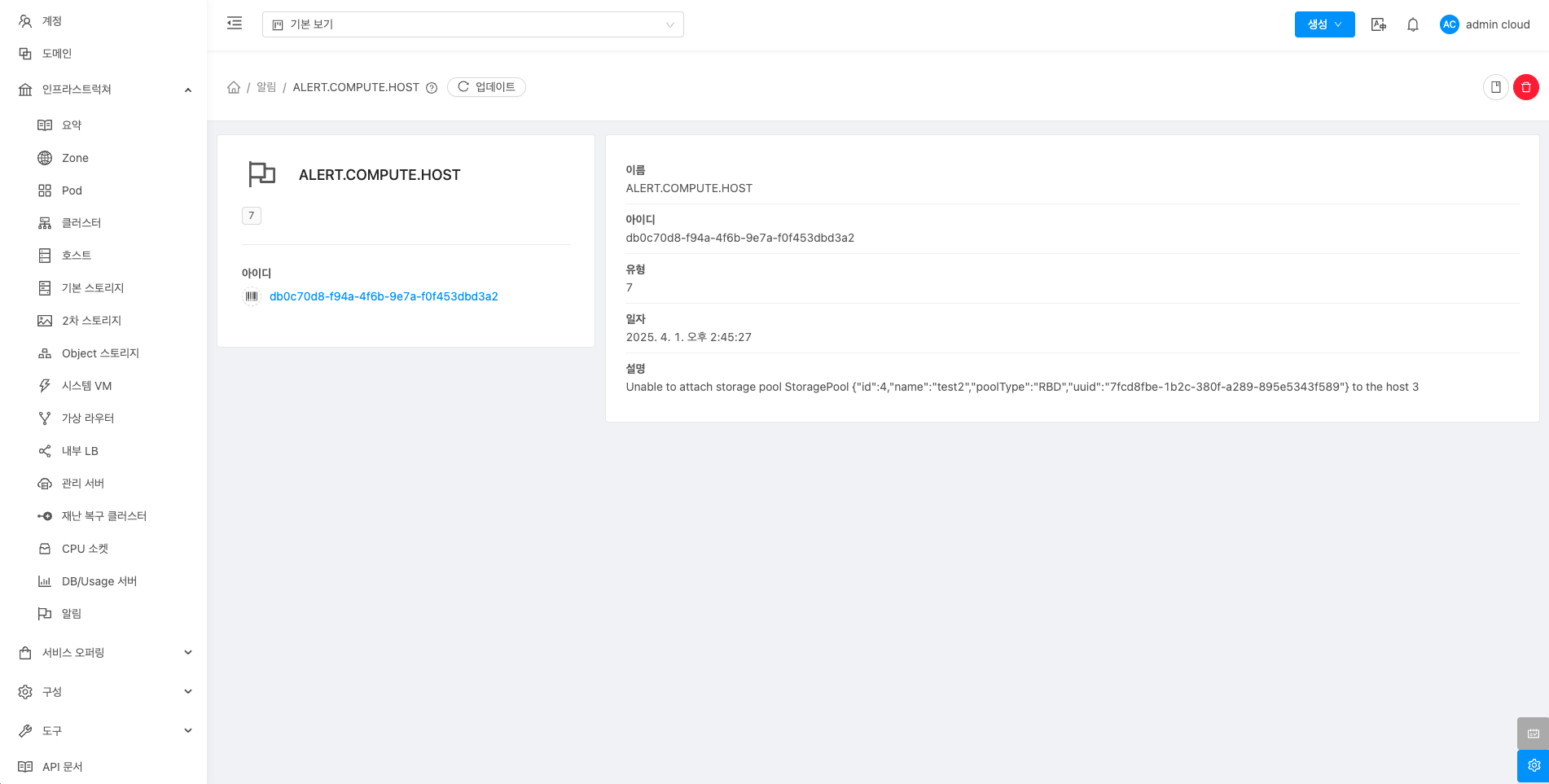 알림에 대한 상세정보를 조회하는 화면입니다. 해당 알림의 이름, 아이디, 유형, 일자, 설명 등의 정보를 확인할 수 있습니다.