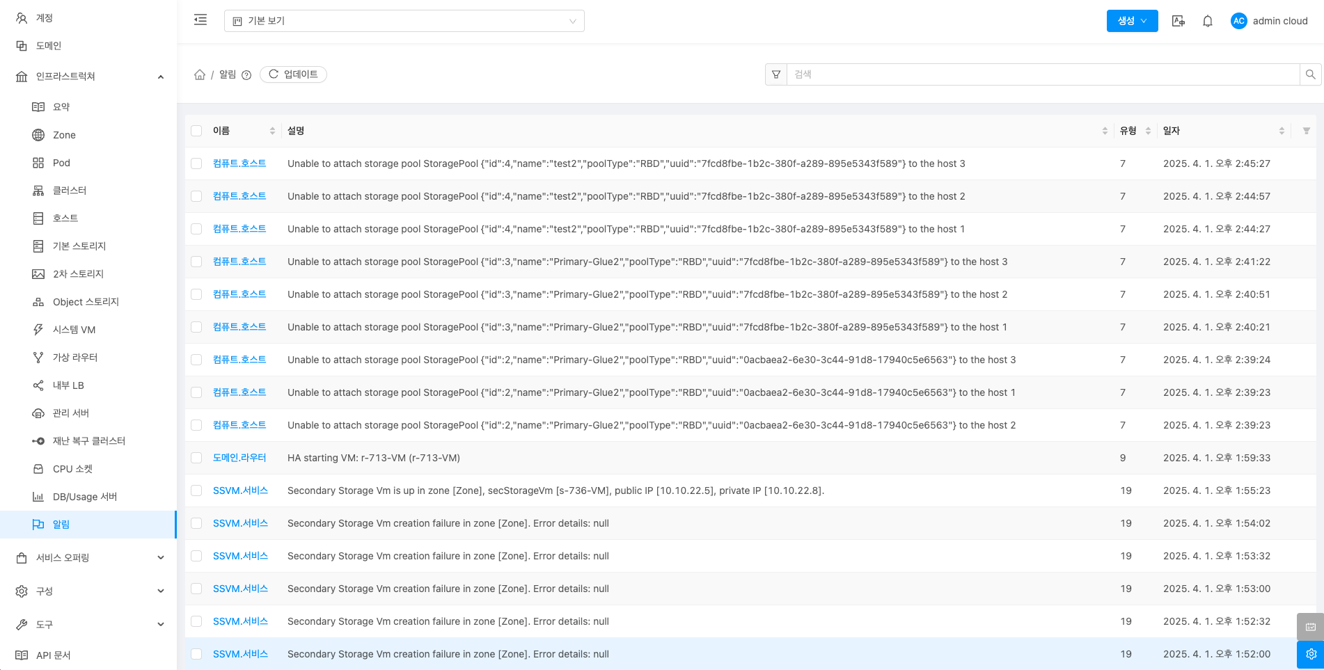 ABLESTACK 클라우드 인프라에서 발생하는 시스템 및 사용자 작업 관련하여 문제 발생하는 문제를 확인할 수 있습니다. 또한 관리자는 발생하는 알람을 이메일 형식으로 제공 받을수 있어 운영 및 관리의 편의성을 제공합니다.