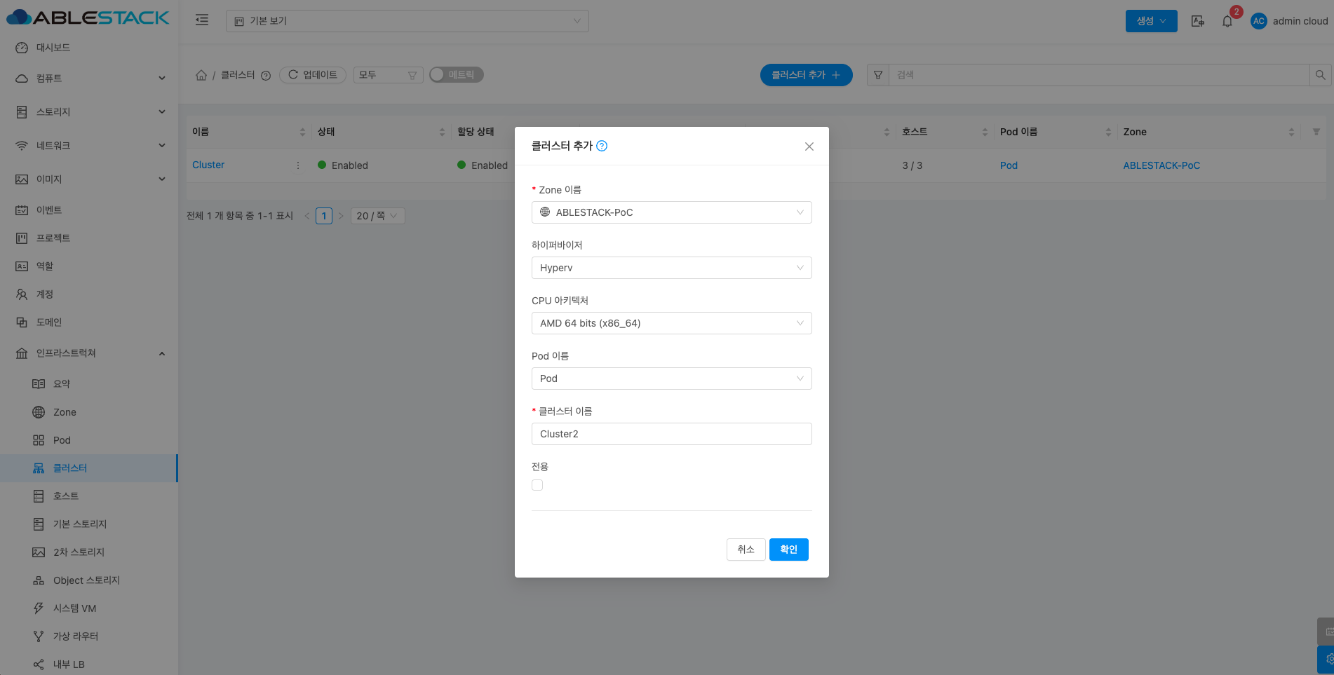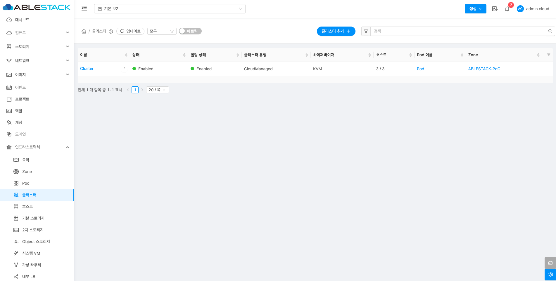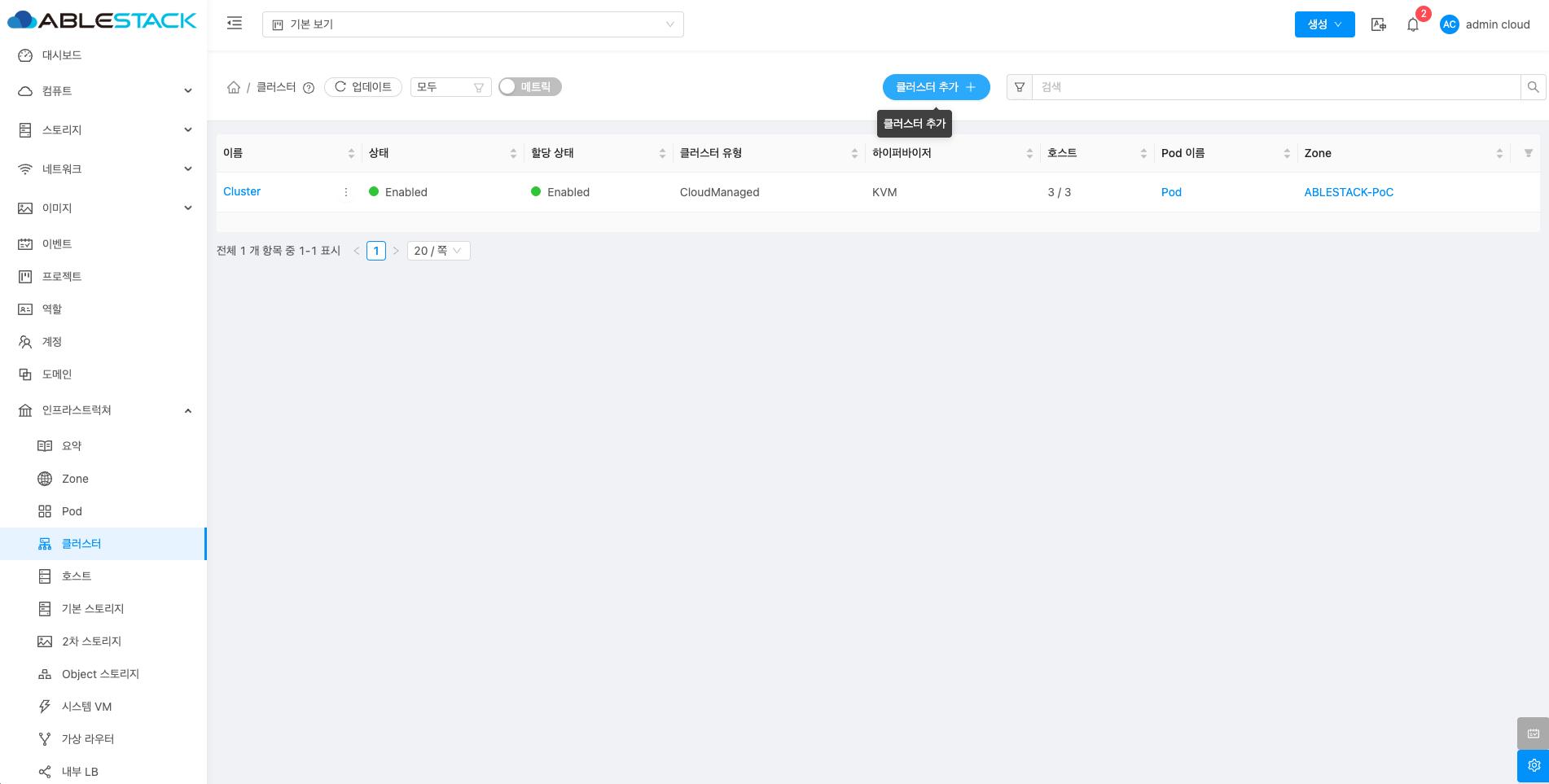 클러스터 추가 버튼을 클릭 하여 클러스터 추가 팝업을 호출합니다.