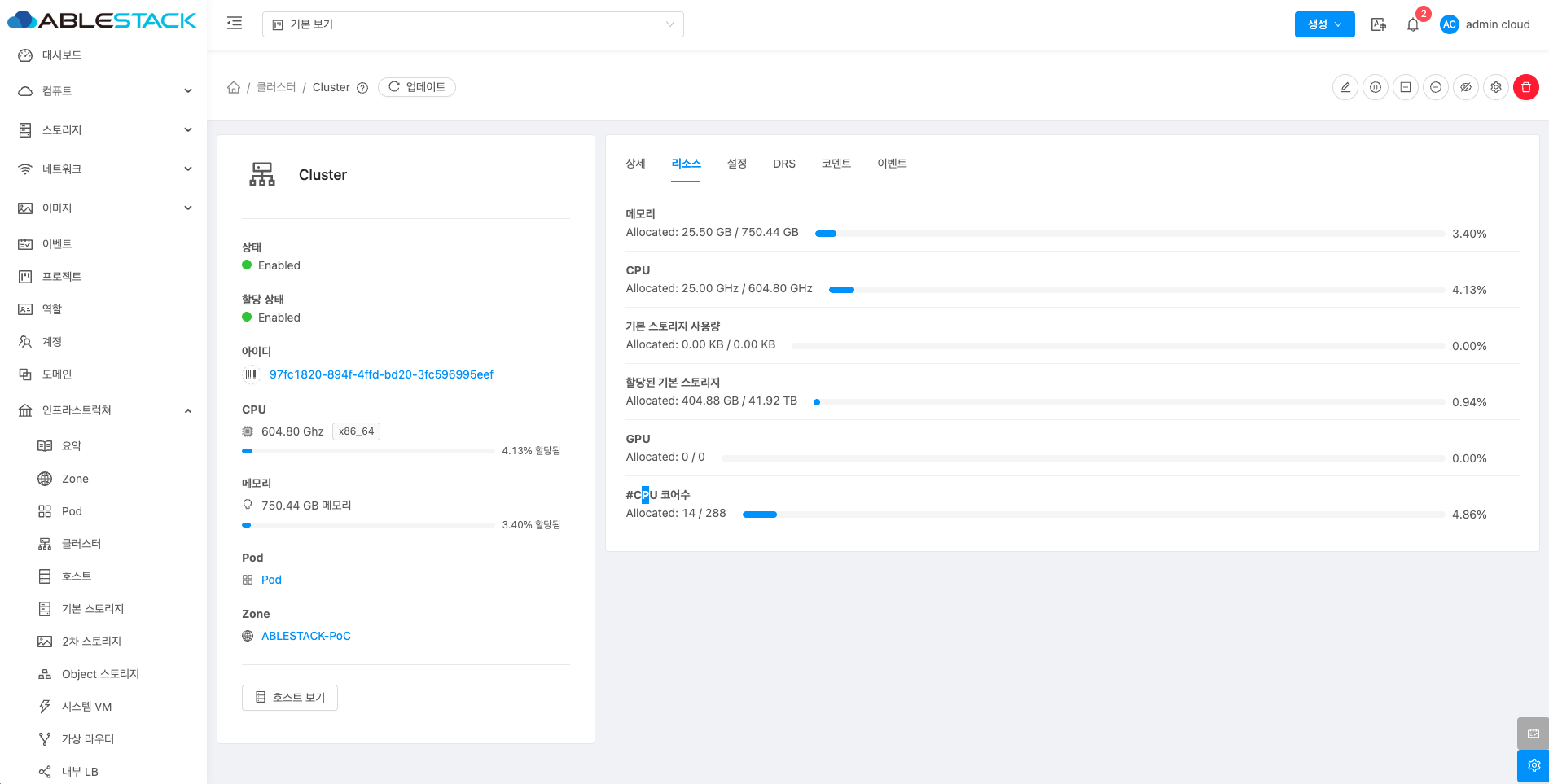 클러스터에 할당된 자원의 상태를 조회하는 화면입니다. 해당 클러스터에서 현재 할당량과 할당 가능량을 확인 가능하며 메모리, CPU, 기본 스토리지 사용량, 할당된 기본 스토리지, GPU, CPU 코어수 등의 정보를 확인할 수 있습니다.