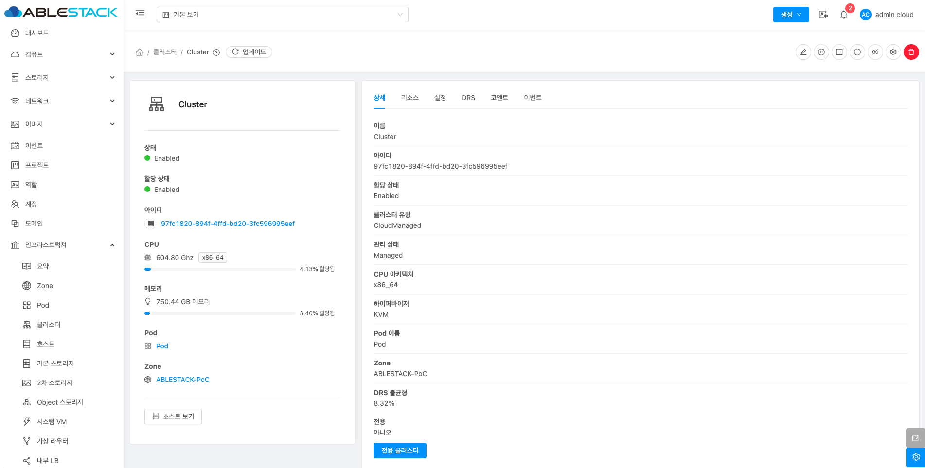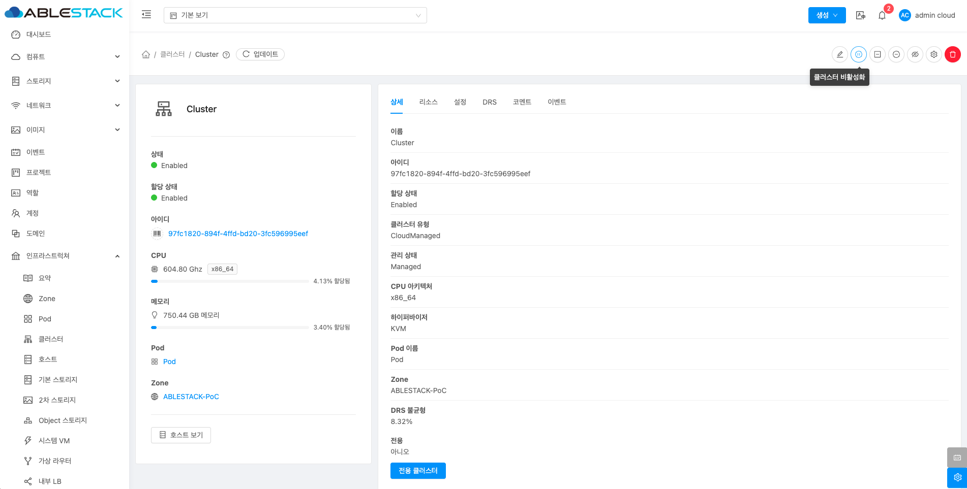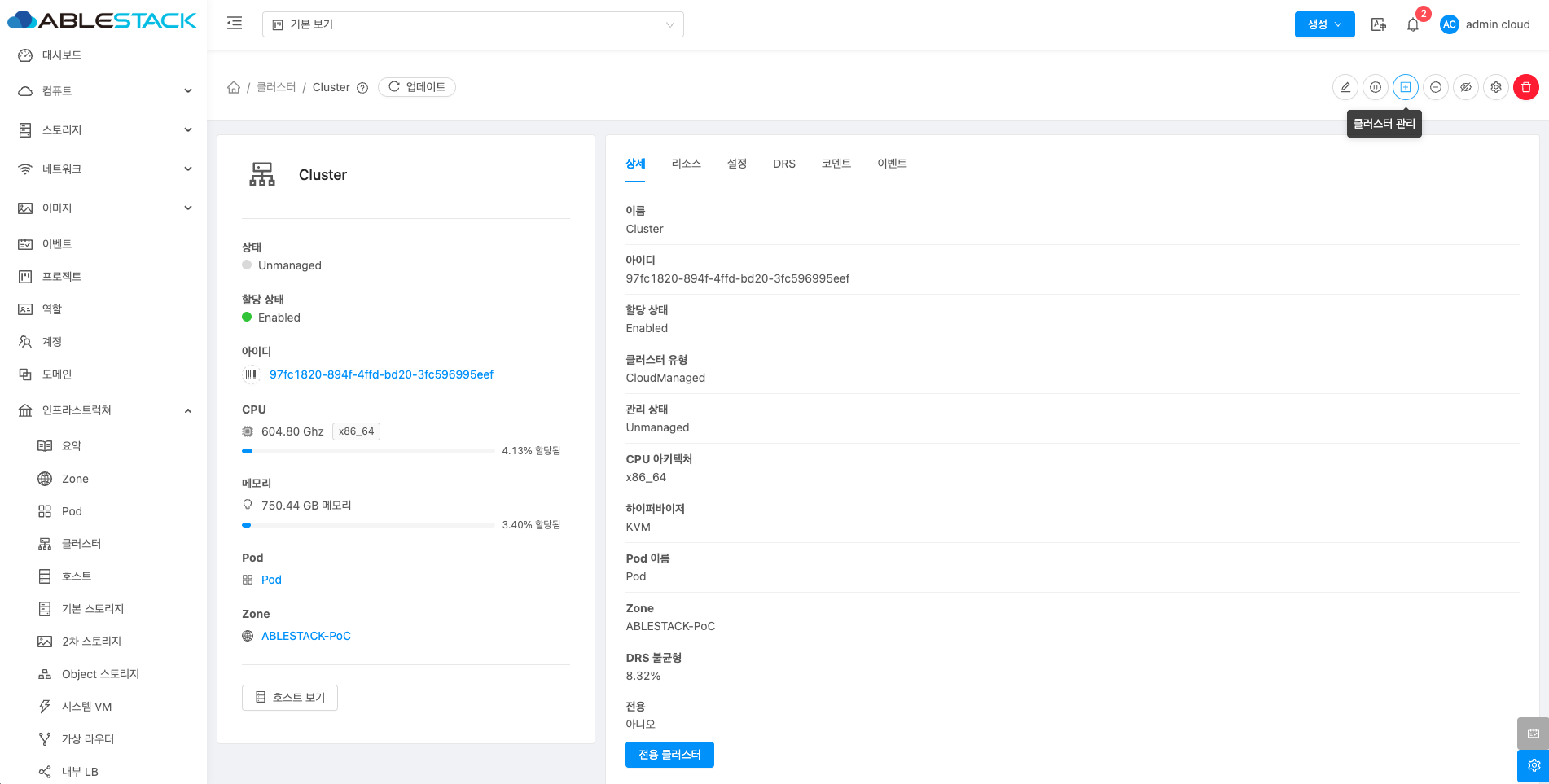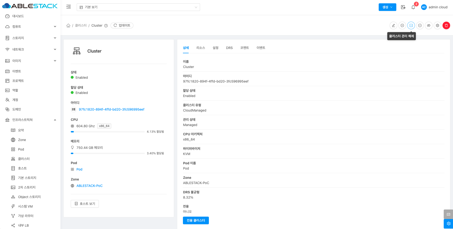 클러스터에 대한 상세정보를 조회하는 화면입니다. 해당 클러스터의 이름, 아이디, 할당 상태, 클러스터 유형, 관리 상태, CPU 아키텍처, 하이퍼바이저, Pod 이름, Zone, DRS 불균형, 전용 등의 정보를 확인할 수 있습니다.
