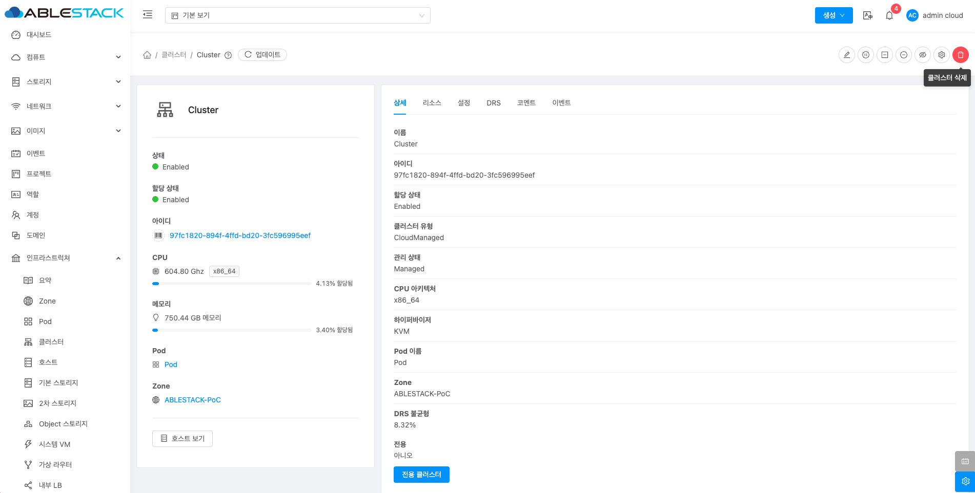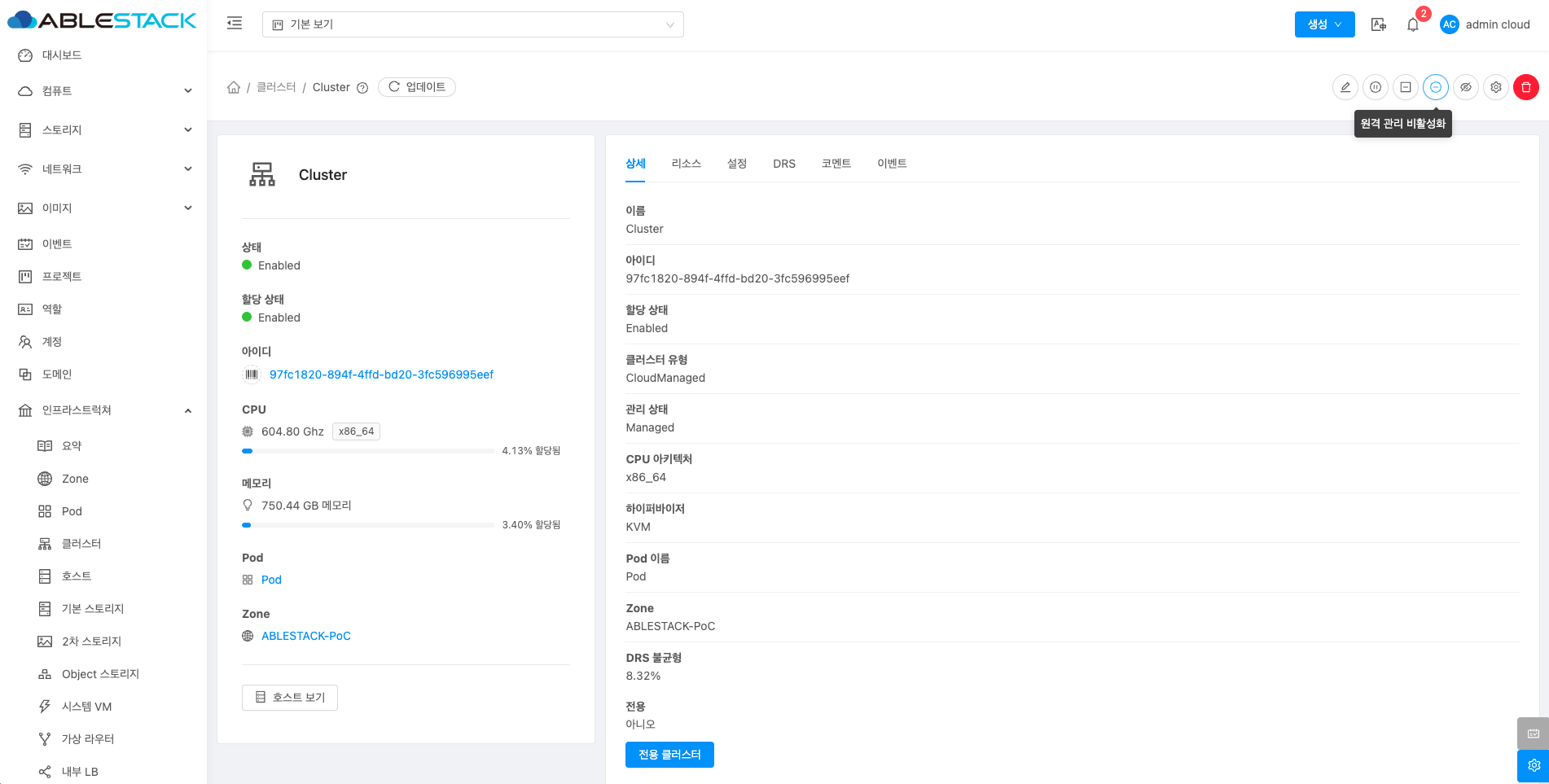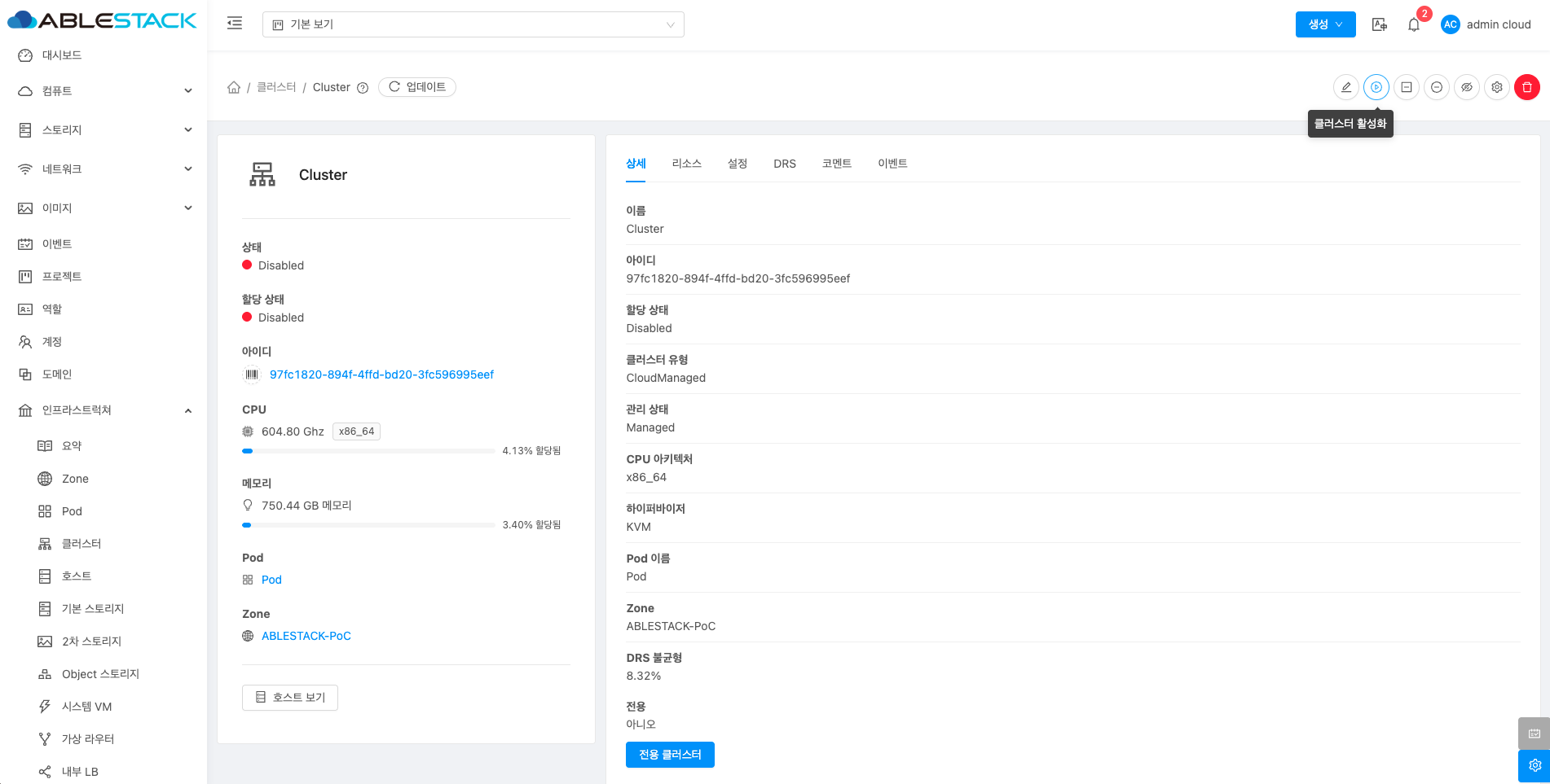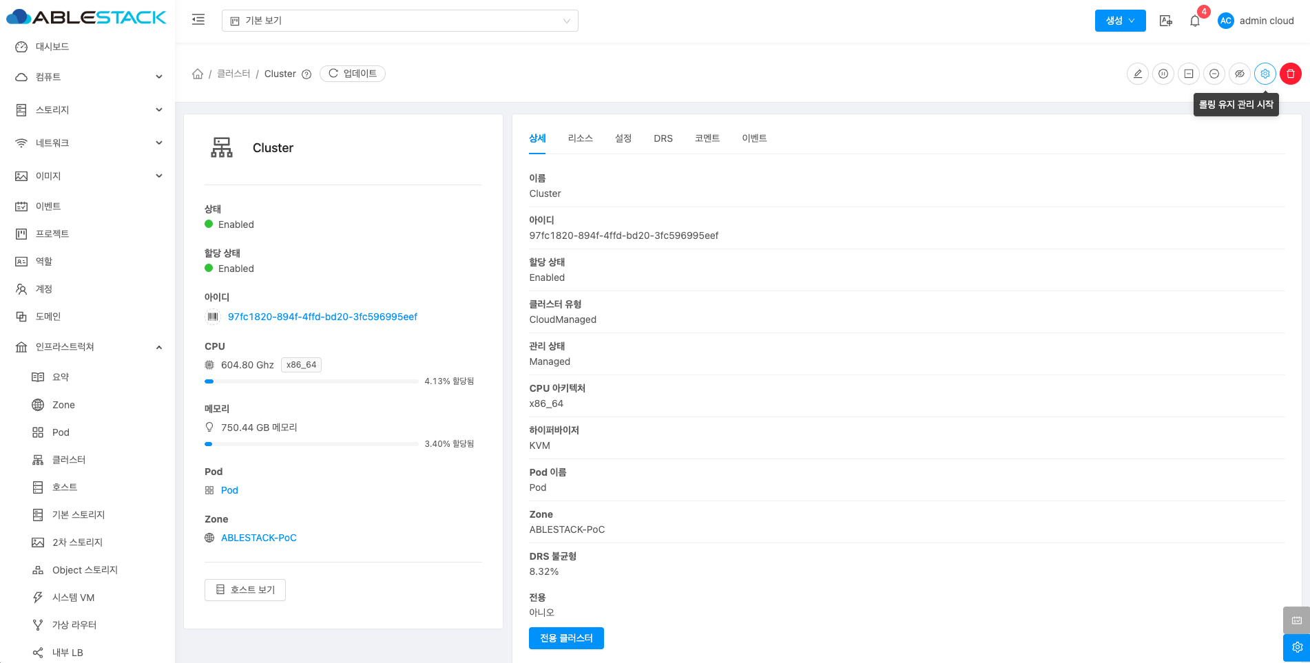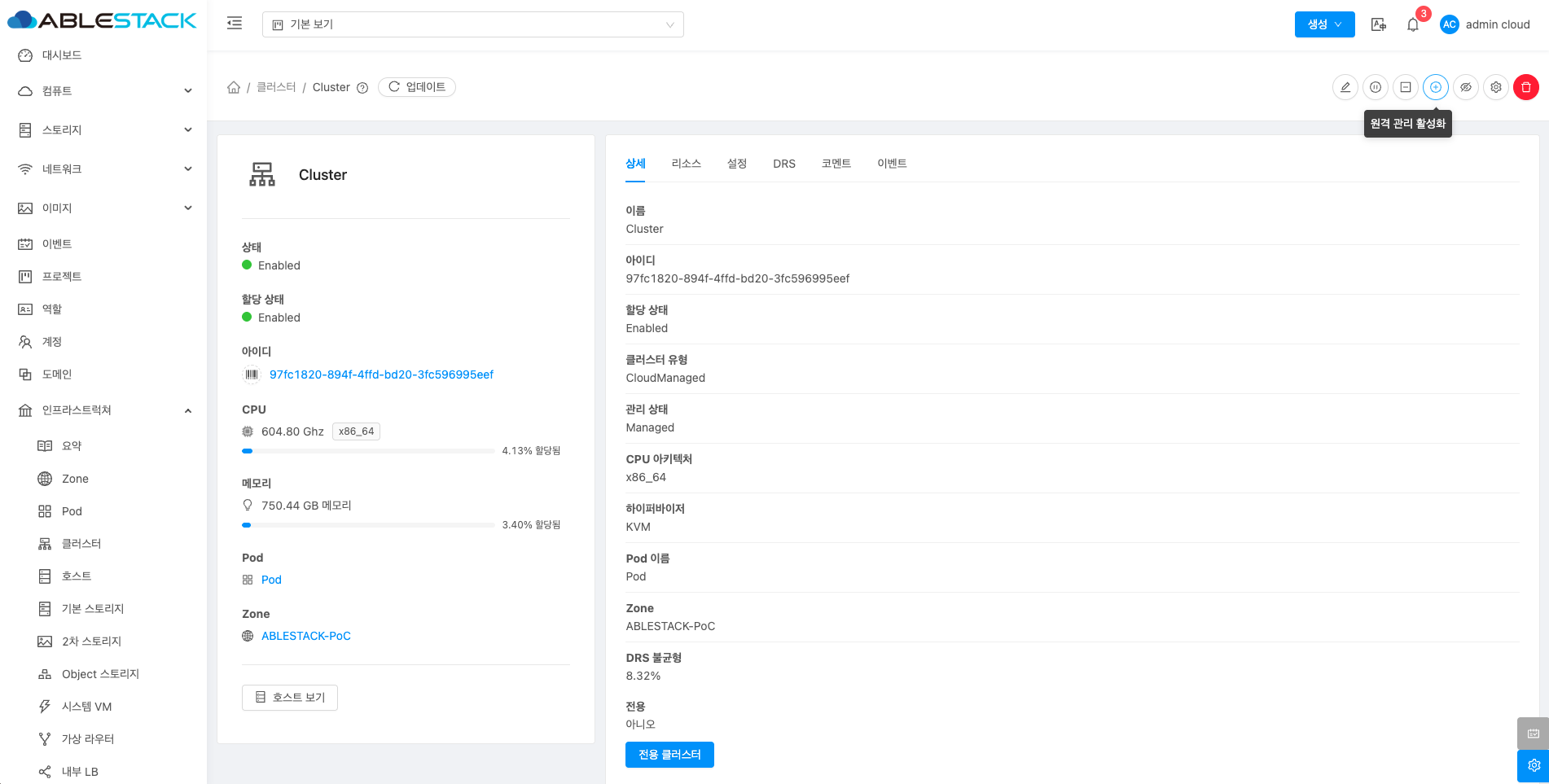 클러스터에 대한 상세정보를 조회하는 화면입니다. 해당 클러스터의 이름, 아이디, 할당 상태, 클러스터 유형, 관리 상태, CPU 아키텍처, 하이퍼바이저, Pod 이름, Zone, DRS 불균형, 전용 등의 정보를 확인할 수 있습니다.