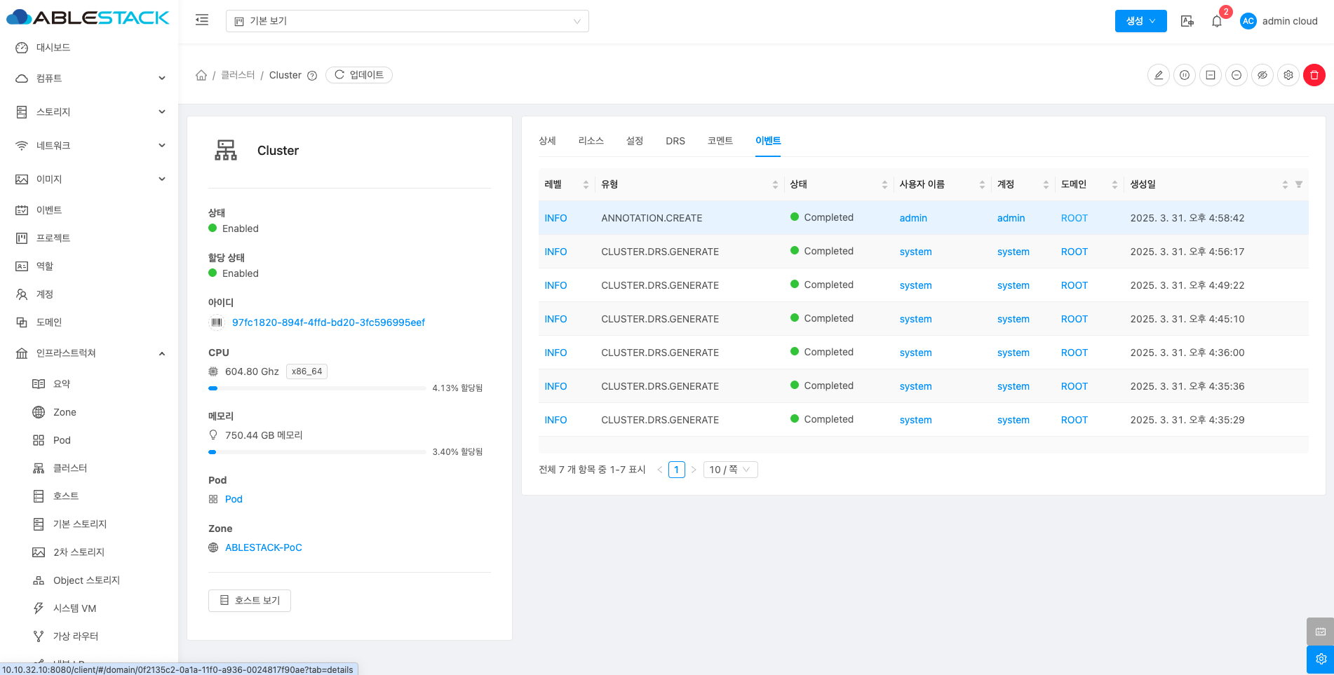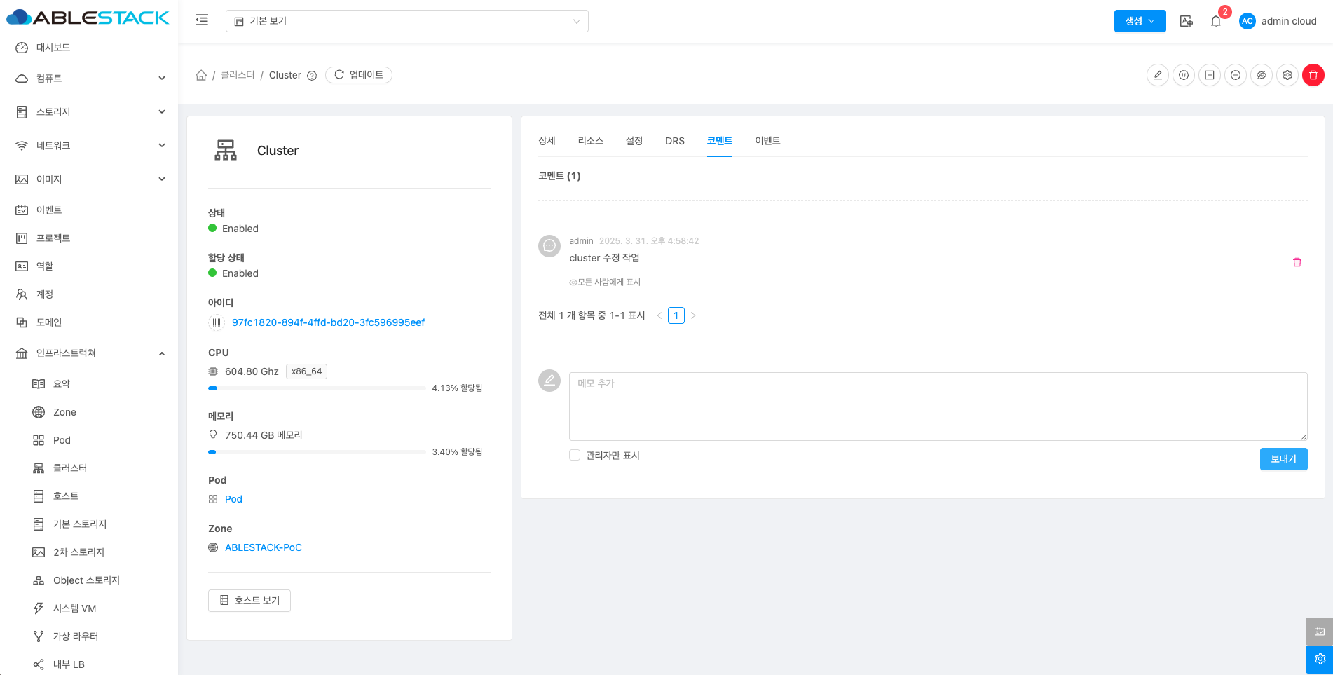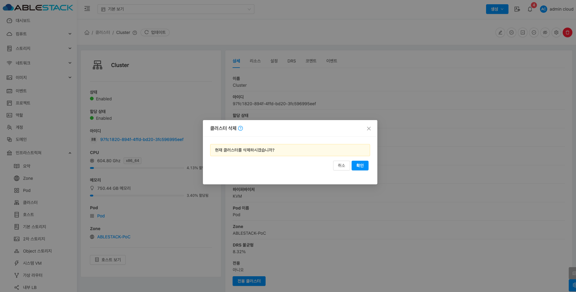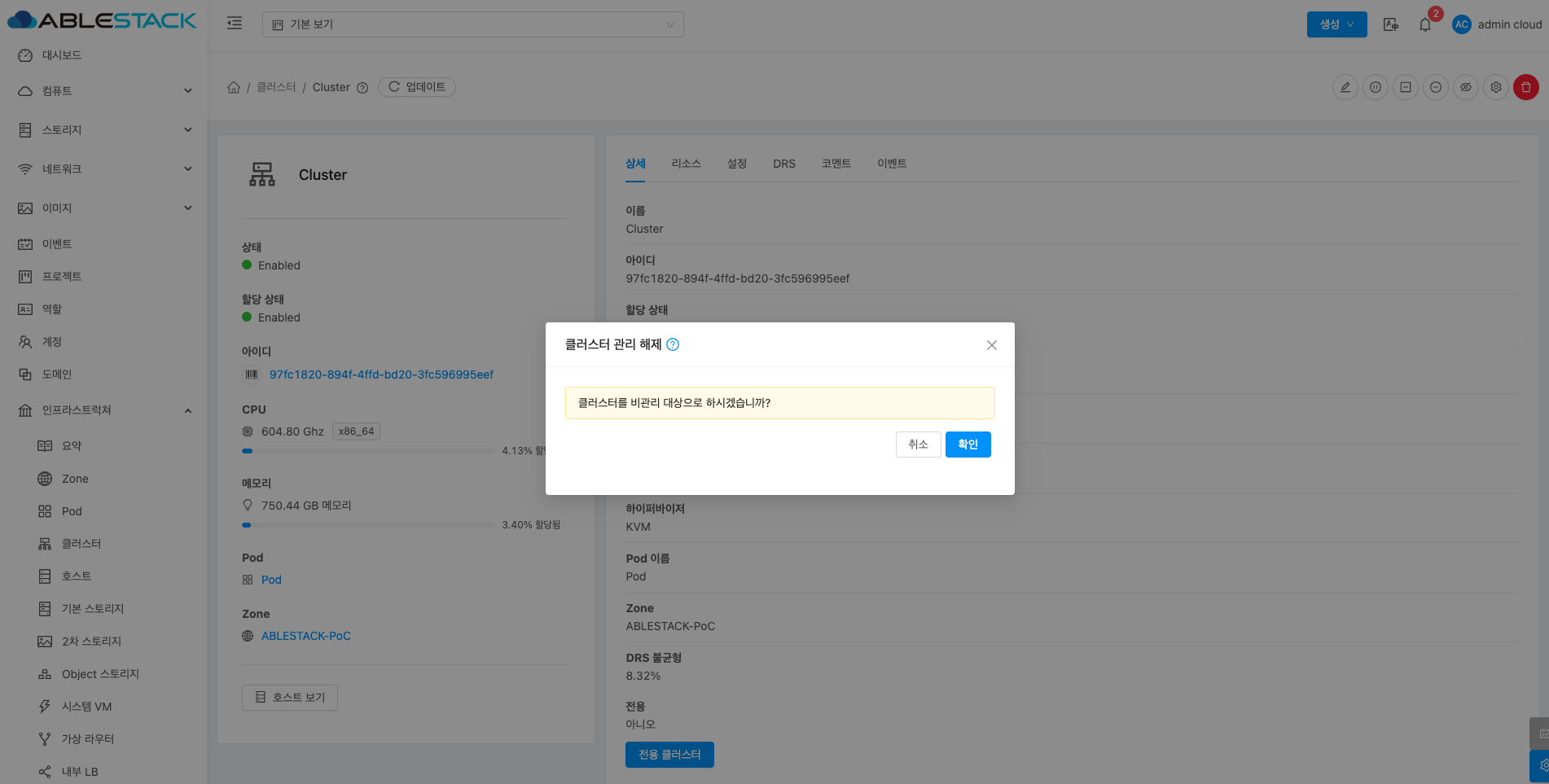 클러스터에 대한 상세정보를 조회하는 화면입니다. 해당 클러스터의 이름, 아이디, 할당 상태, 클러스터 유형, 관리 상태, CPU 아키텍처, 하이퍼바이저, Pod 이름, Zone, DRS 불균형, 전용 등의 정보를 확인할 수 있습니다.