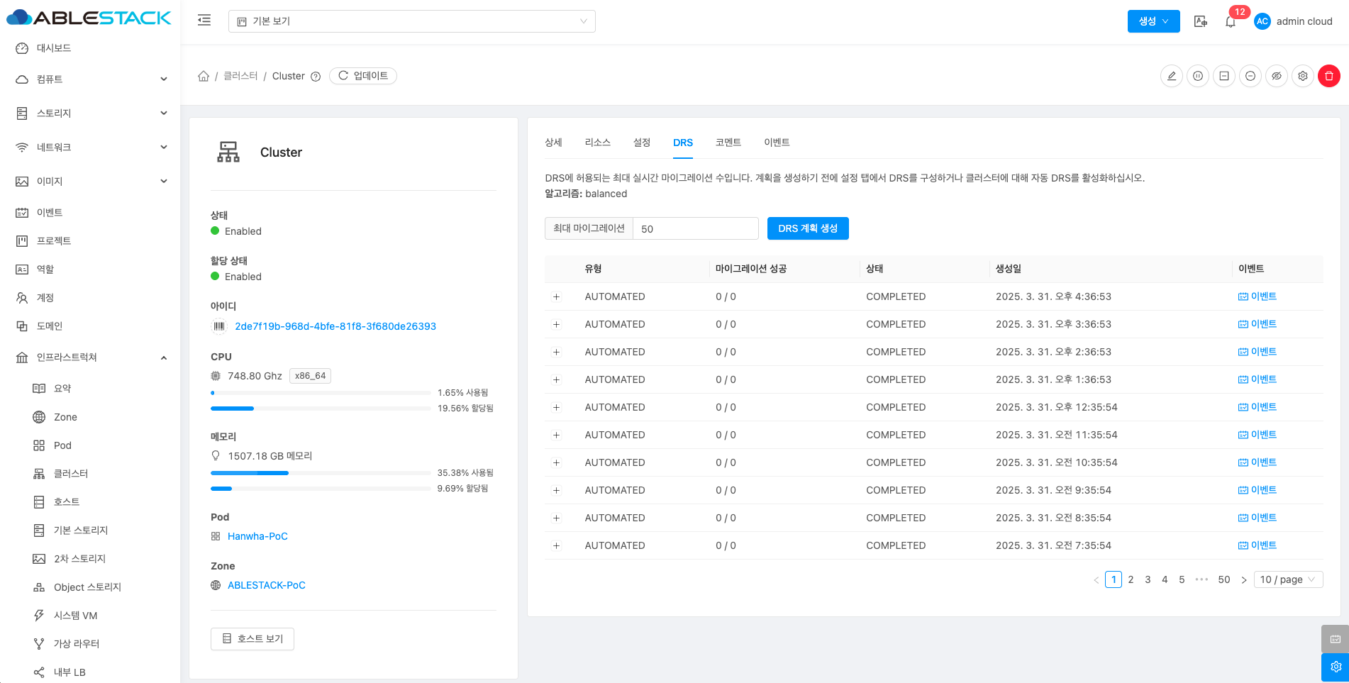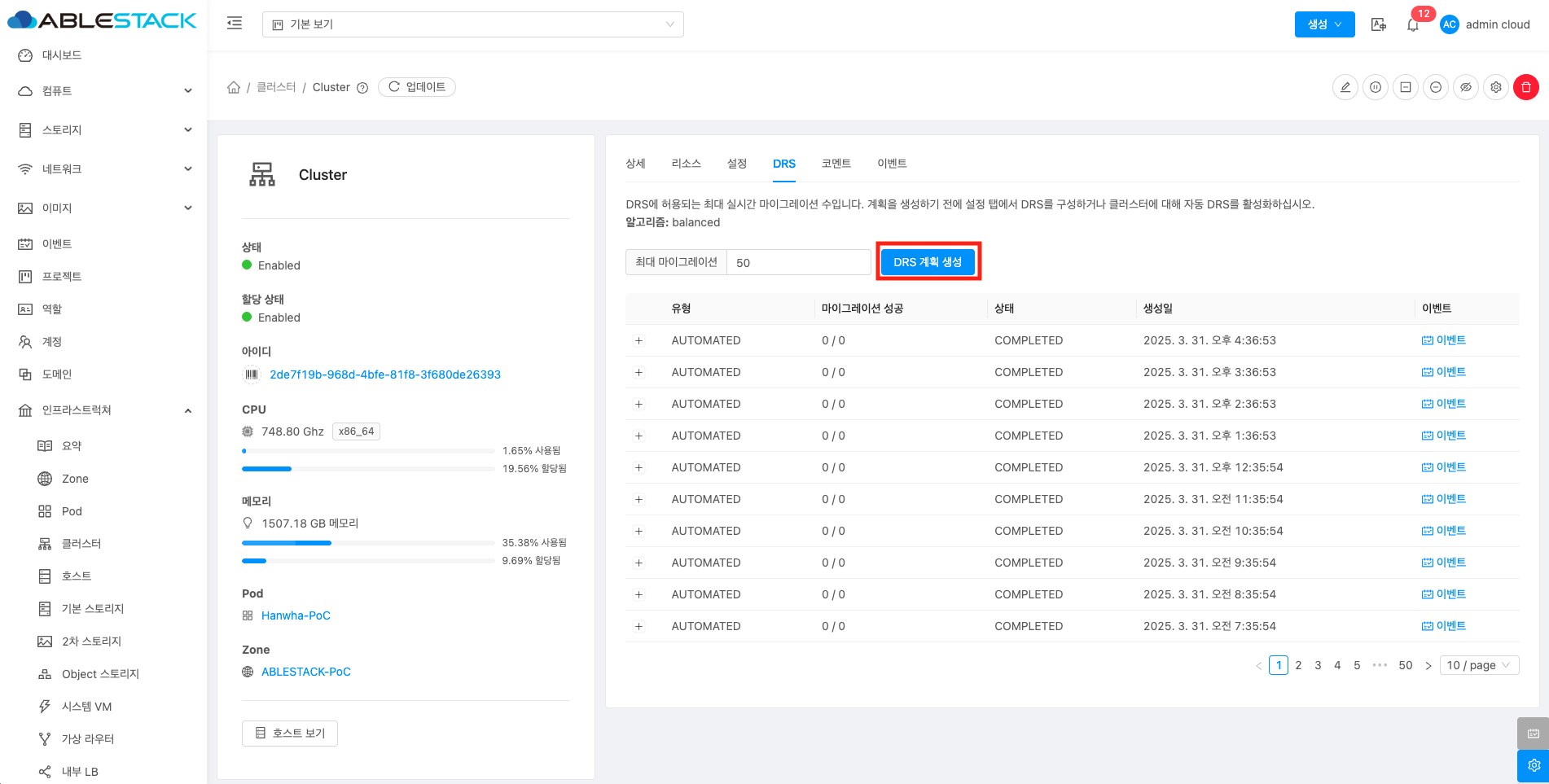 DRS 계획을 생성하여 배포계획을 보여줍니다. 배포 계획이 없는 DRS는 설정 기준치에 적절하게 배포되어 있는 상태입니다.