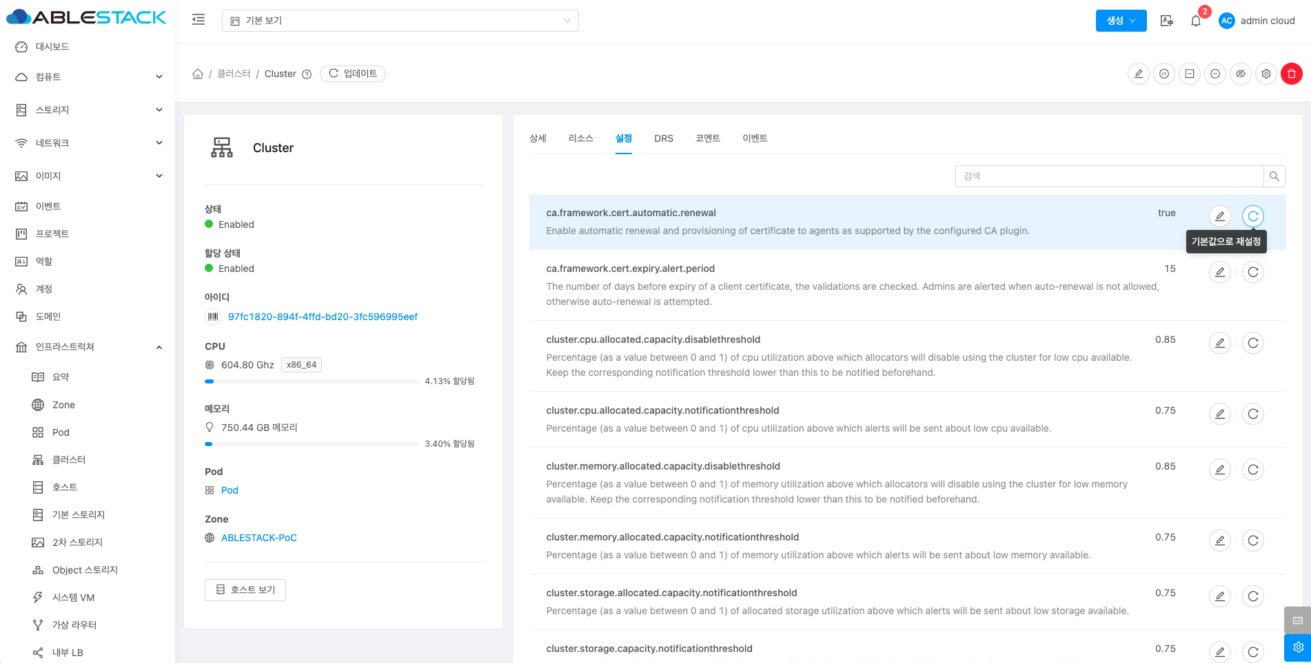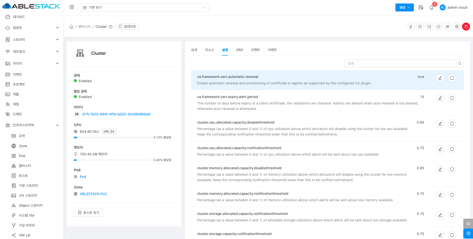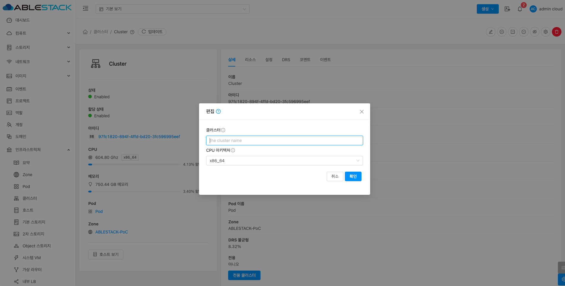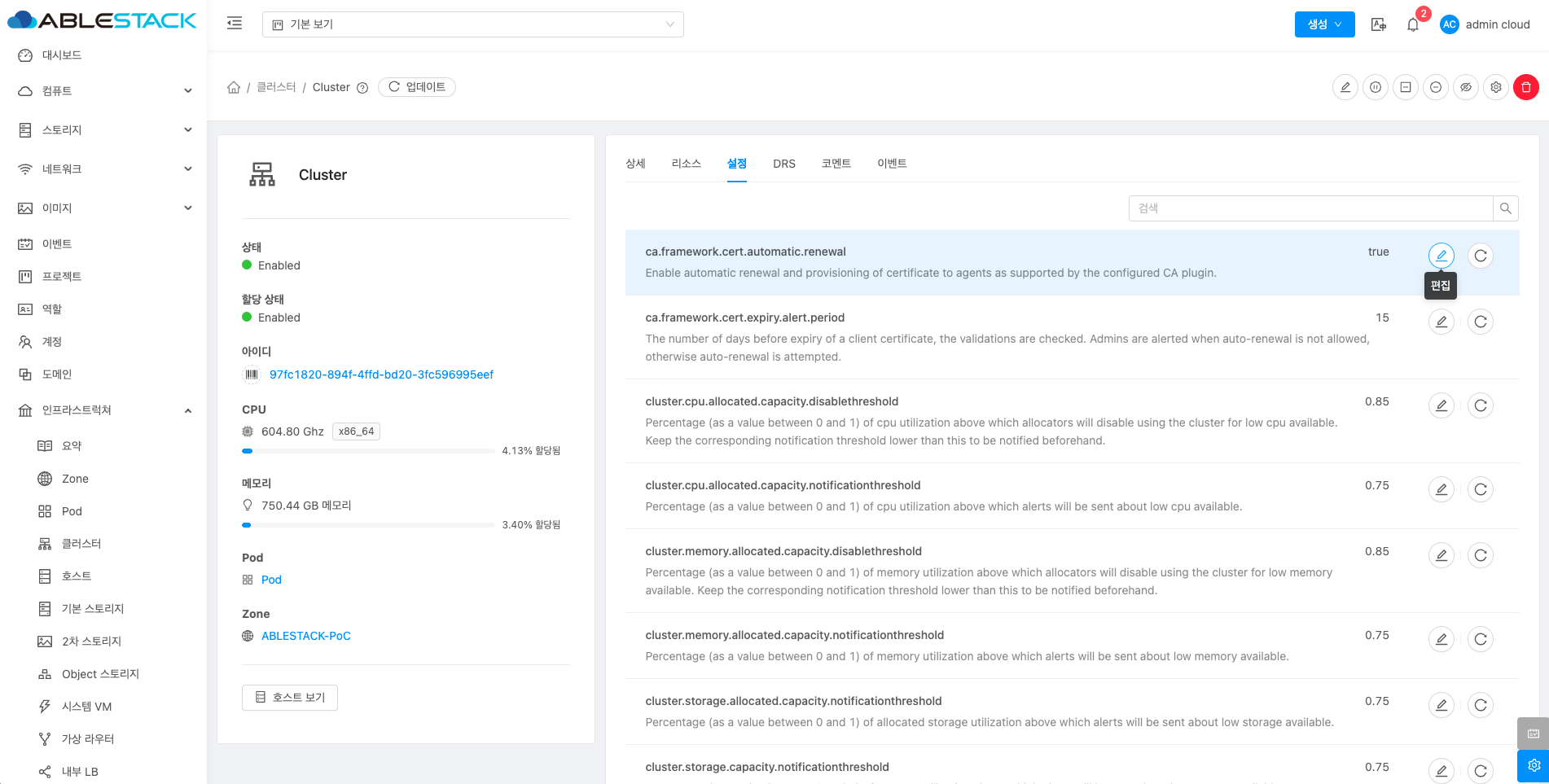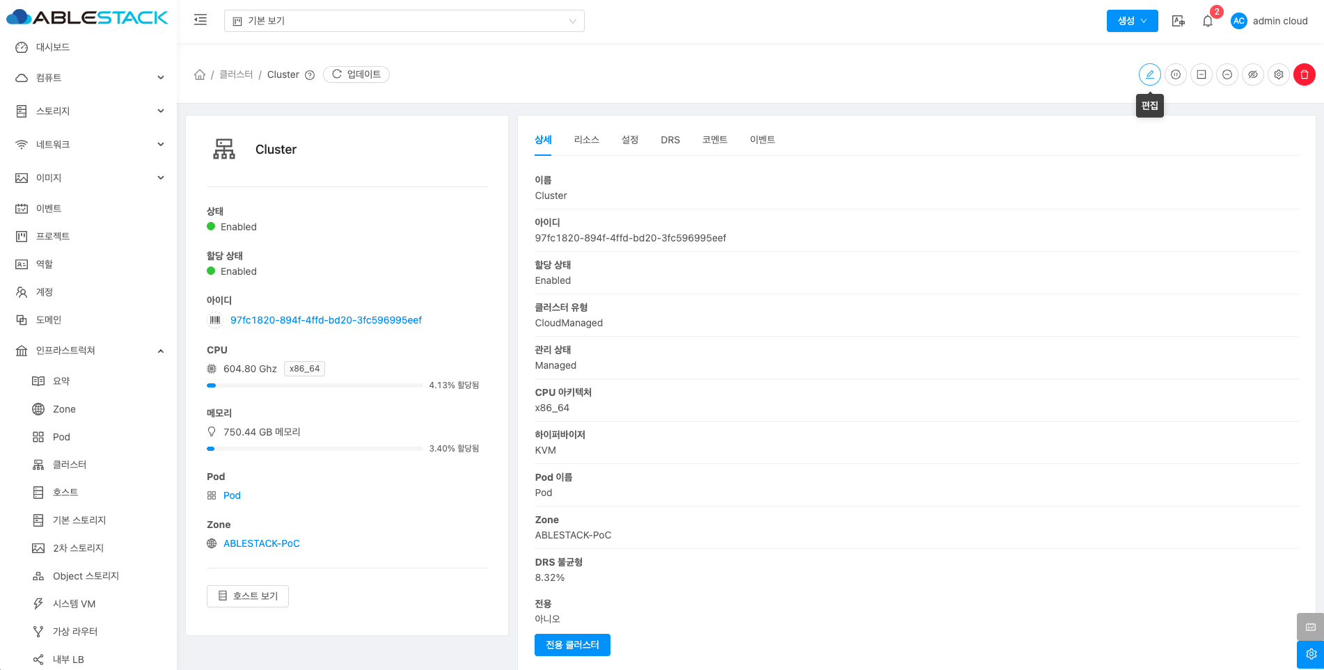- Cluster 편집 버튼을 클릭하여 Cluster 편집 화면을 호출합니다.