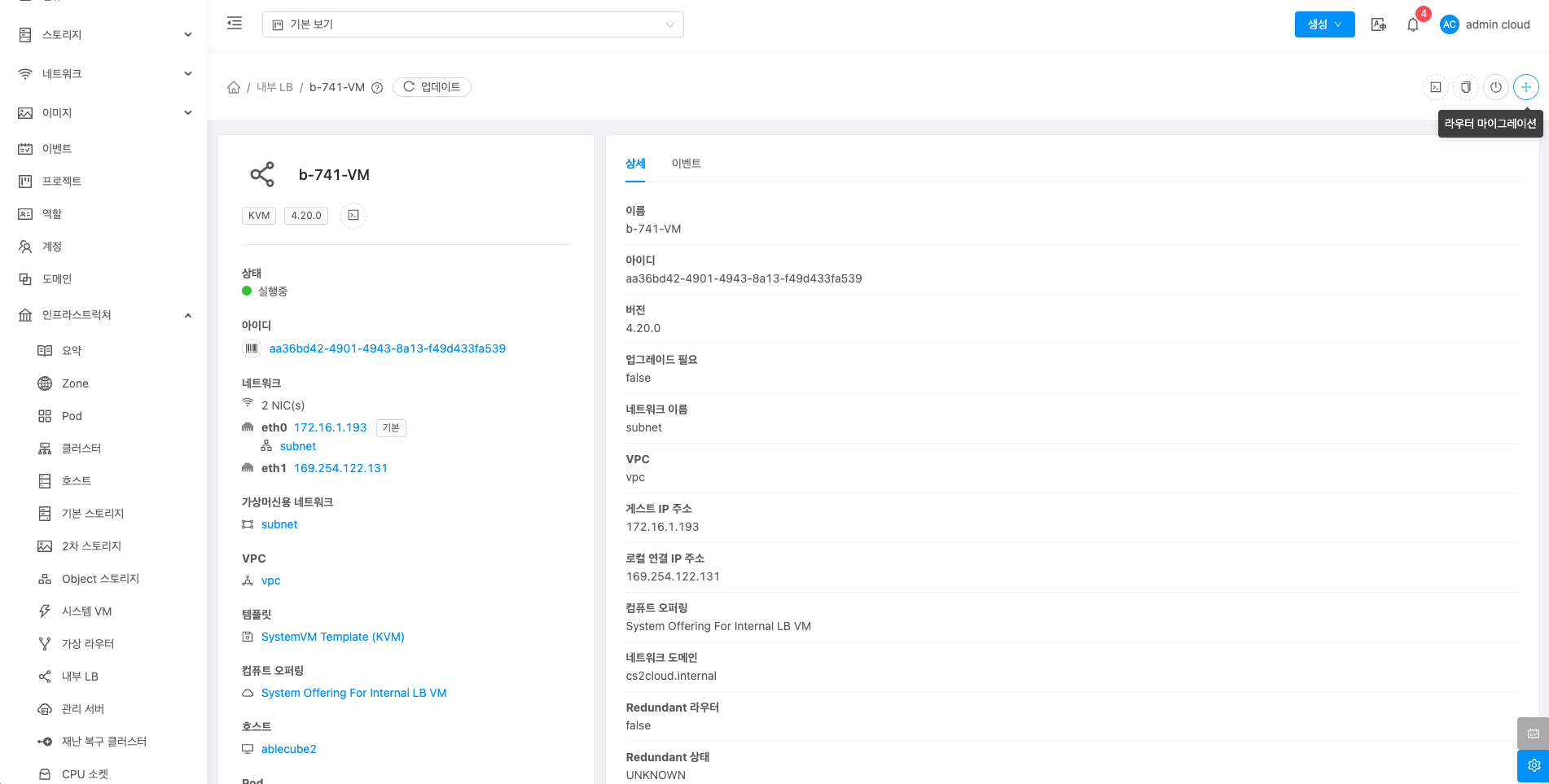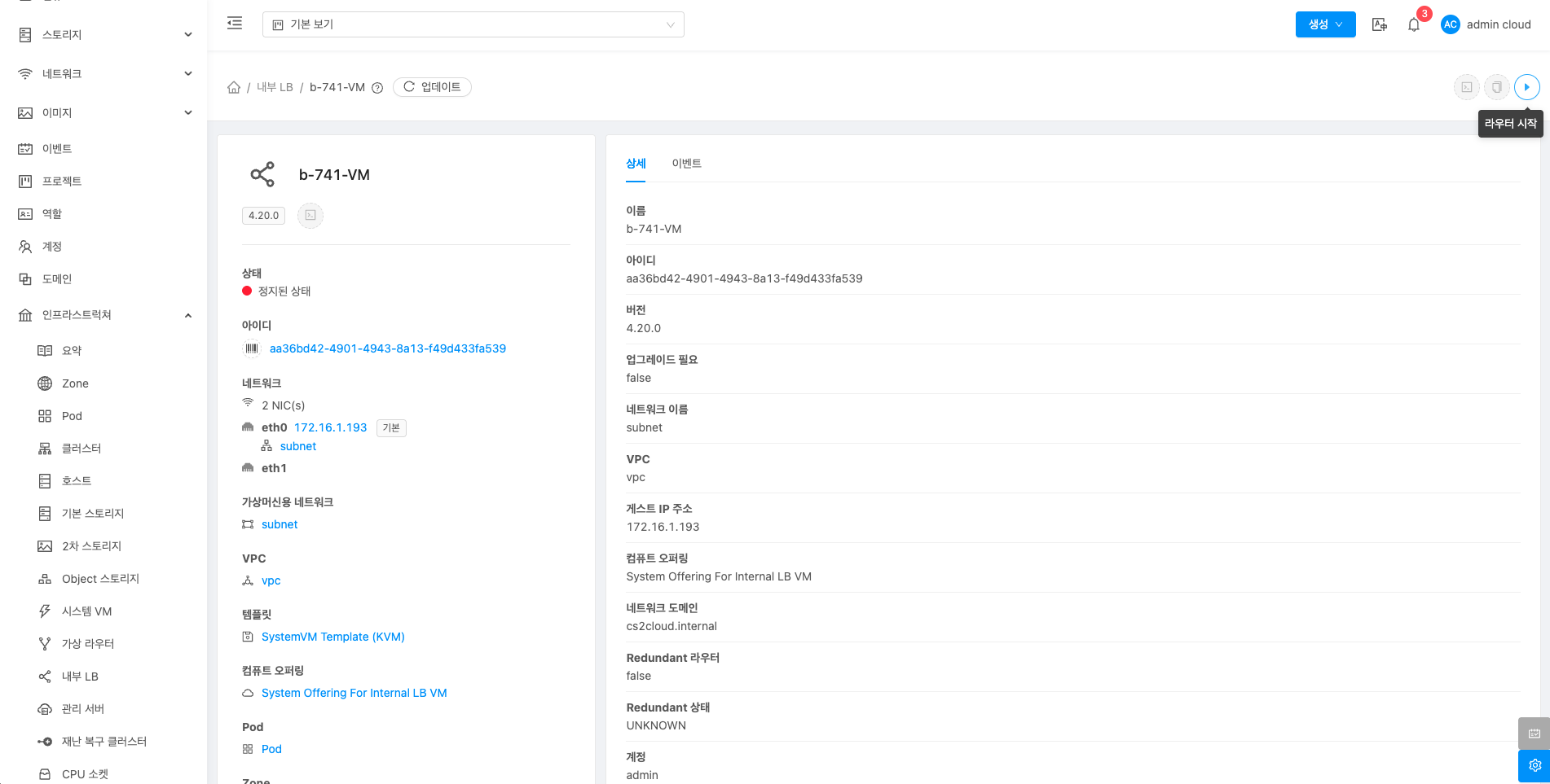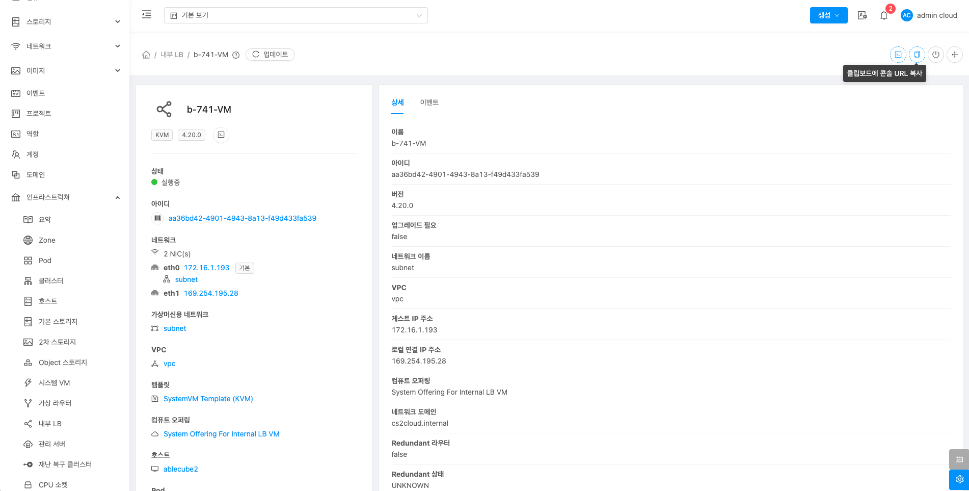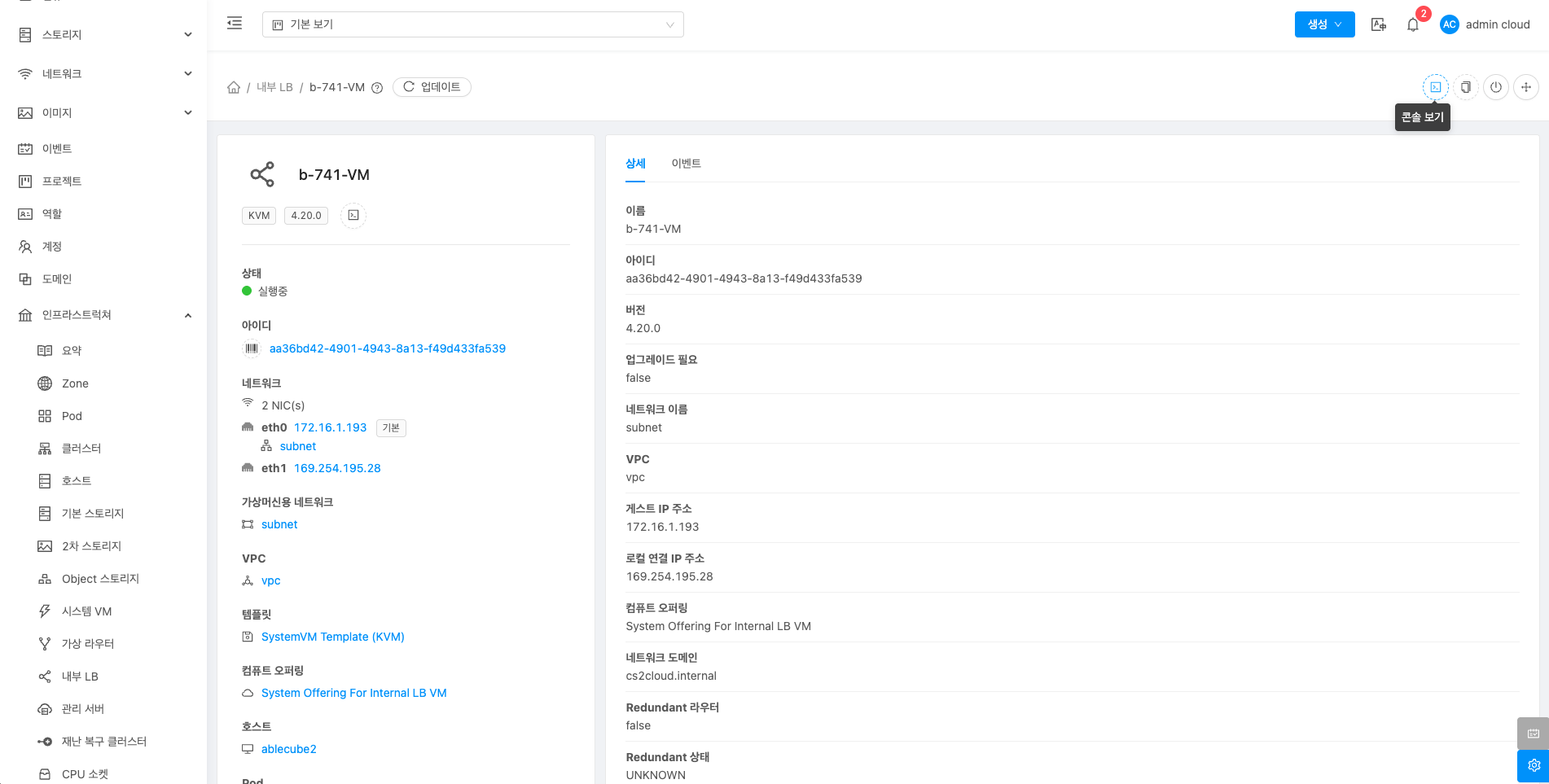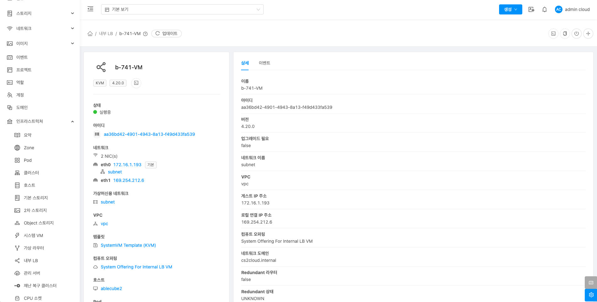내부 LB에 대한 상세정보를 조회하는 화면입니다. 해당 내부 LB의 이름, 아이디, 버전, 업그레이드 필요, 네트워크 이름, VPC, 게스트 IP 주소, 로컬 연결 IP 주소, 컴퓨트 오퍼링, 네트워크 도메인, Redundant 라우터, Redundant 상태, 호스트, 계정, Zone, 생성일, 제어 영역 상태 등의 정보를 확인할 수 있습니다.