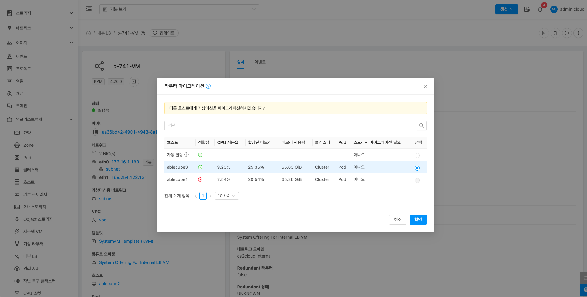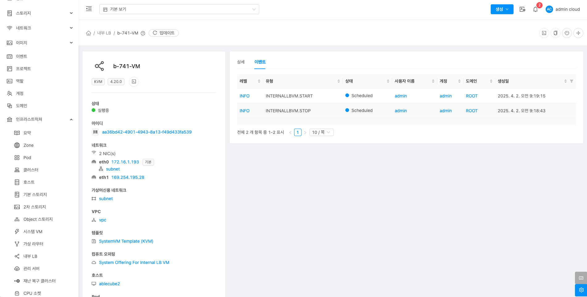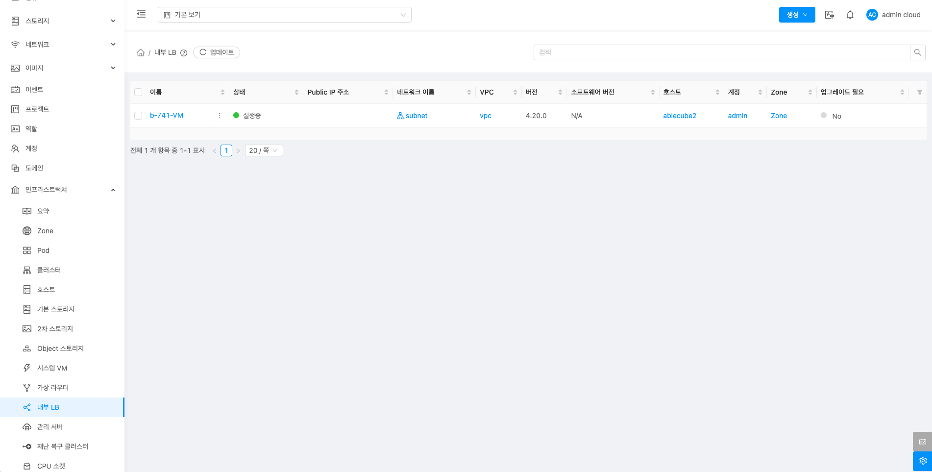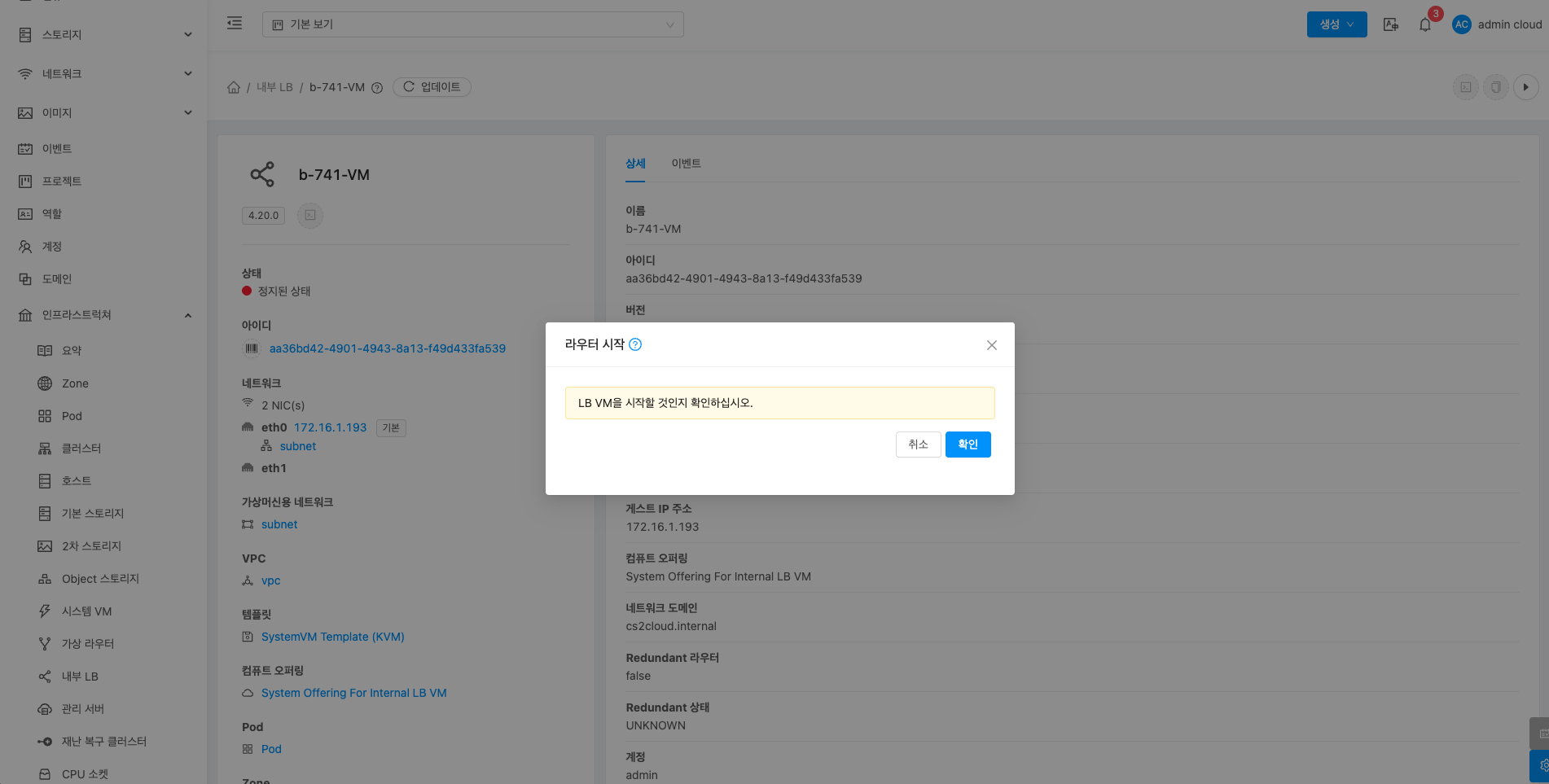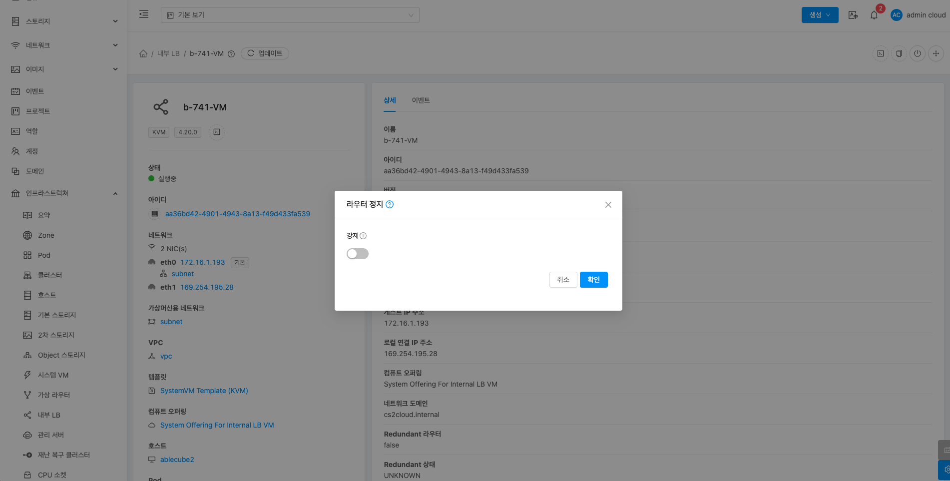 내부 LB에 대한 상세정보를 조회하는 화면입니다. 해당 내부 LB의 이름, 아이디, 버전, 업그레이드 필요, 네트워크 이름, VPC, 게스트 IP 주소, 로컬 연결 IP 주소, 컴퓨트 오퍼링, 네트워크 도메인, Redundant 라우터, Redundant 상태, 호스트, 계정, Zone, 생성일, 제어 영역 상태 등의 정보를 확인할 수 있습니다.