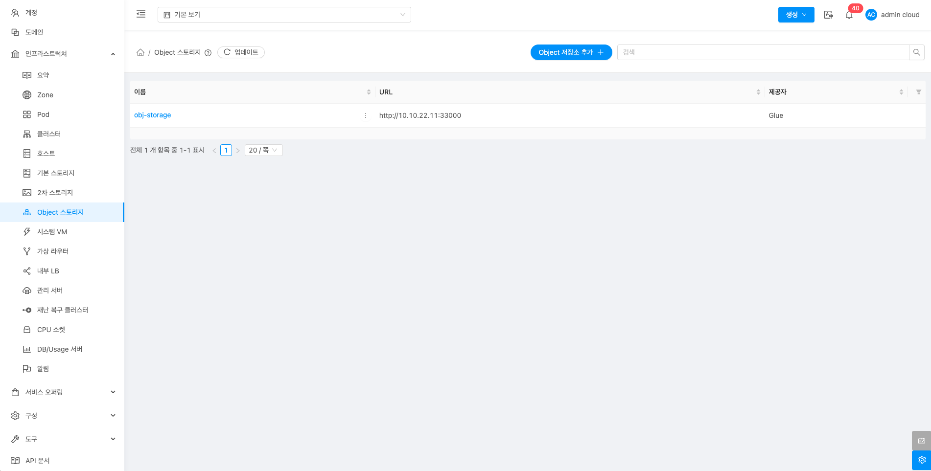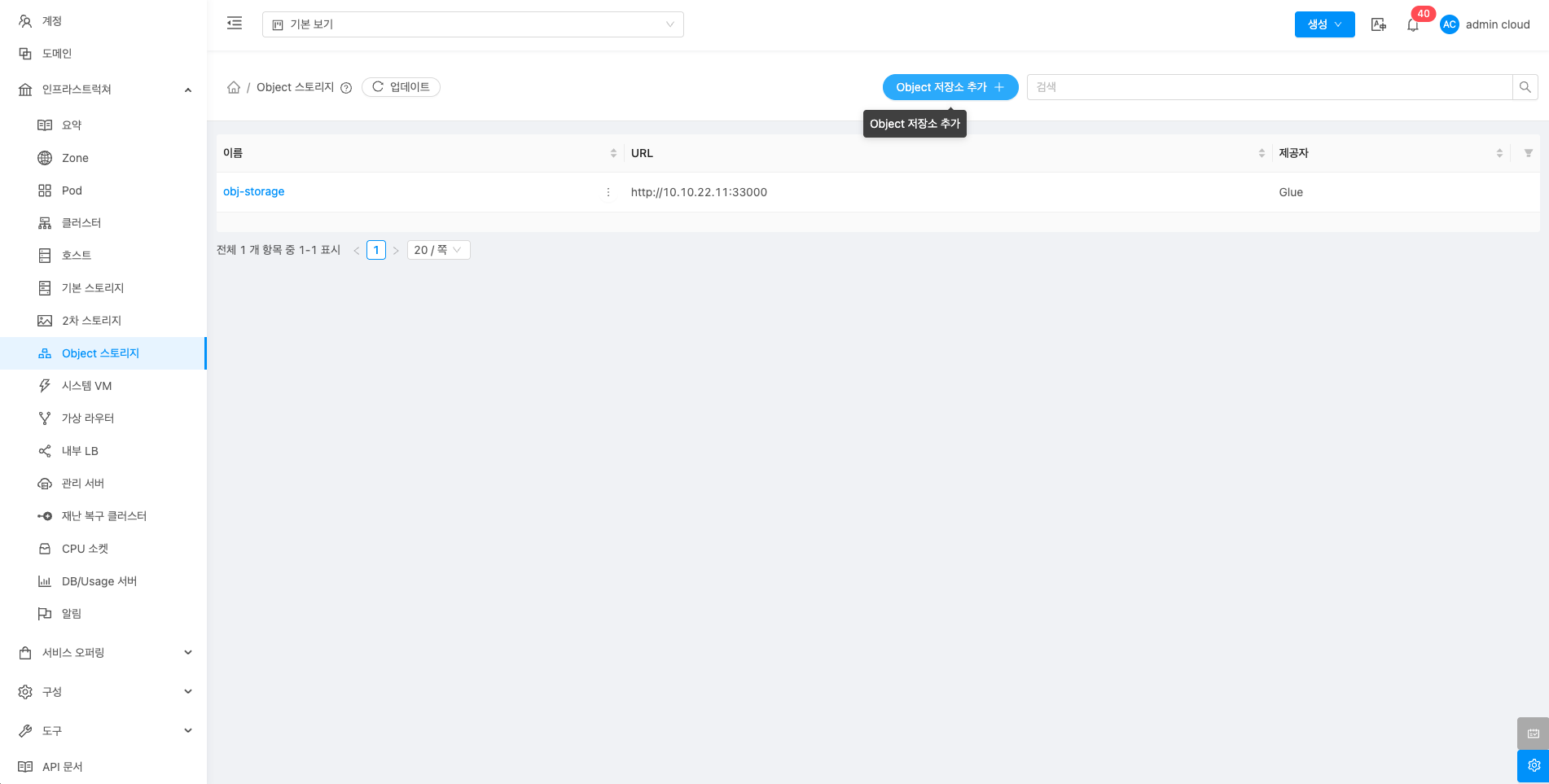 생성된 Object 스토리지 목록을 확인하거나 Object 스토리지 추가 버튼을 클릭하여 Object 스토리지를 추가할 수 있습니다.