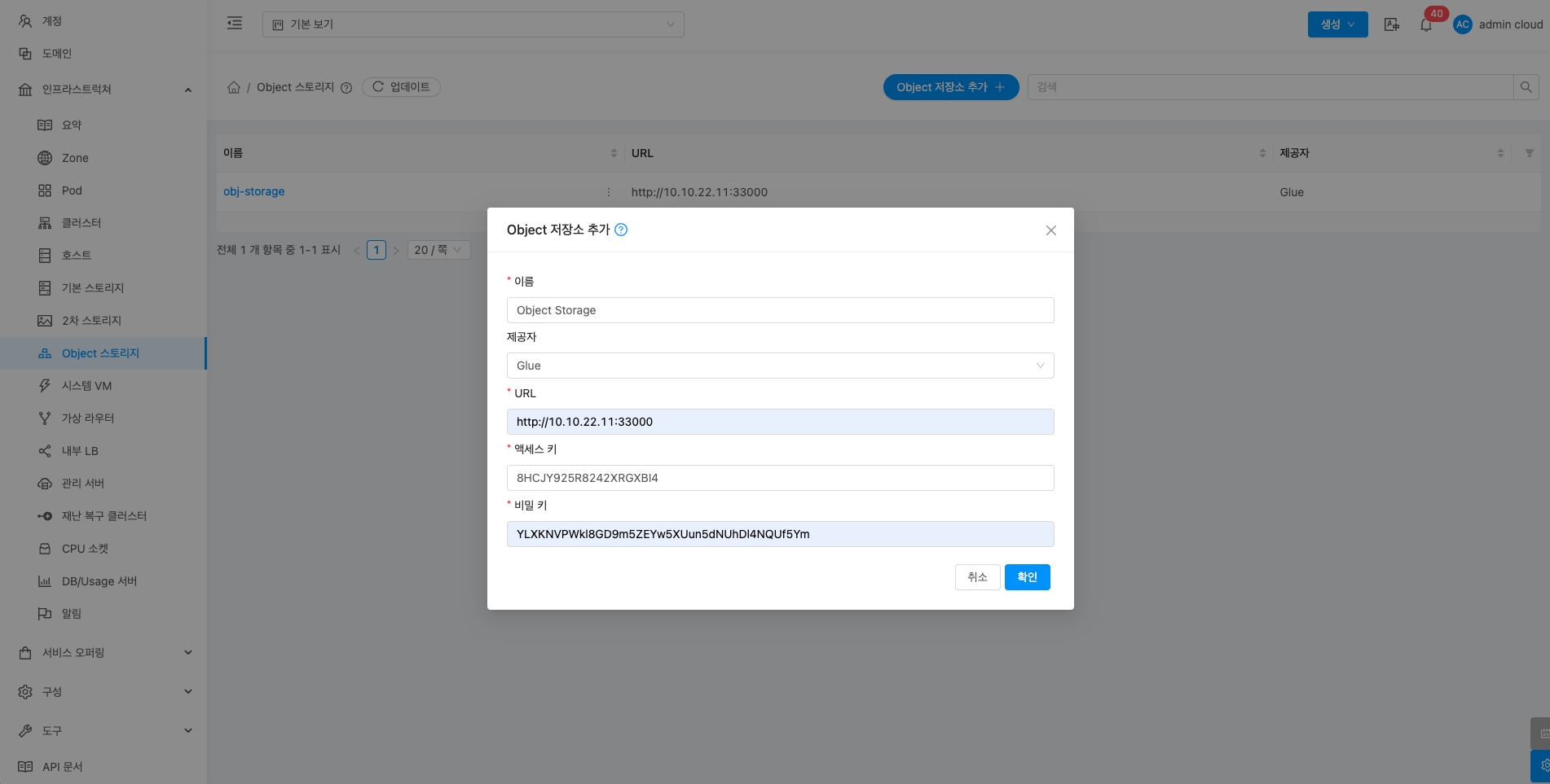 - 확인 버튼을 클릭하여 Object 스토리지를 추가합니다.
