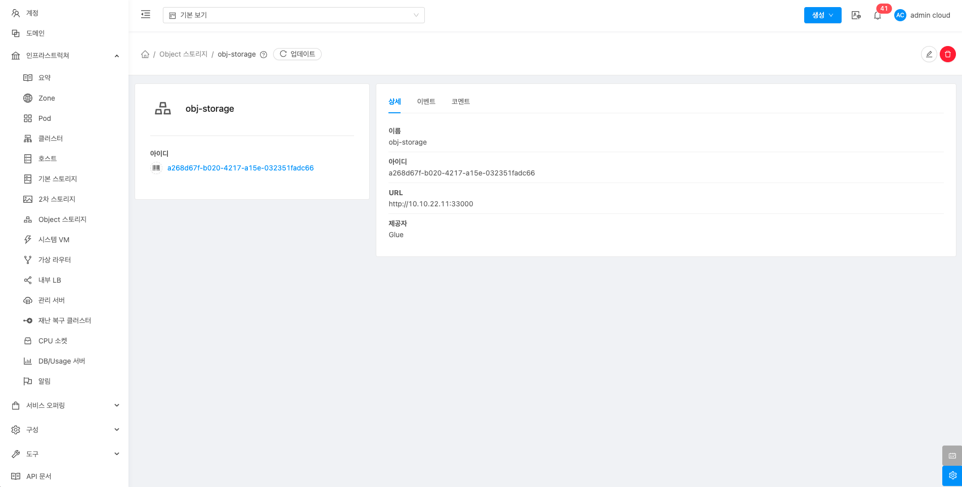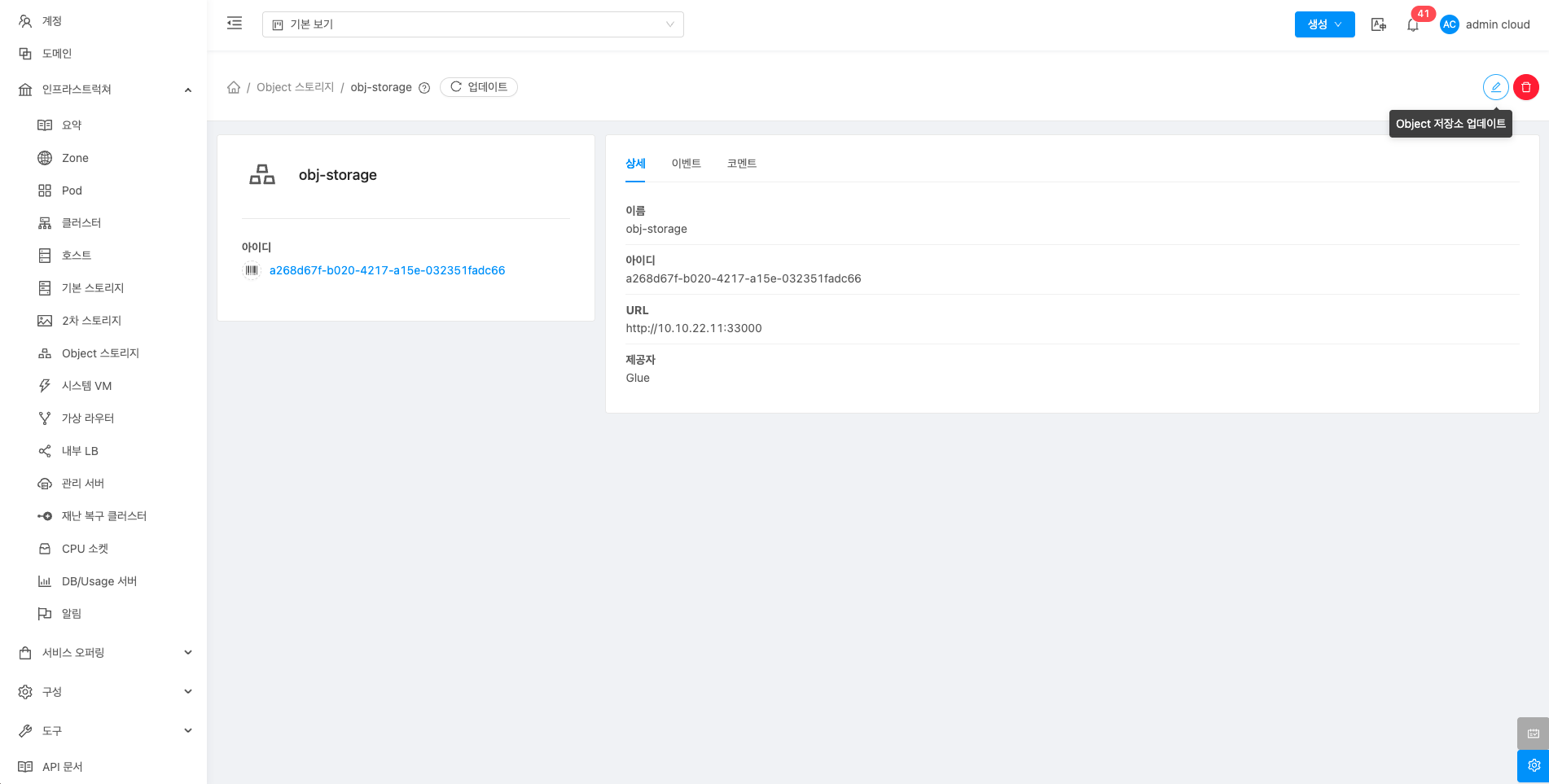 해당 Object 스토리지 정보를 편집합니다.