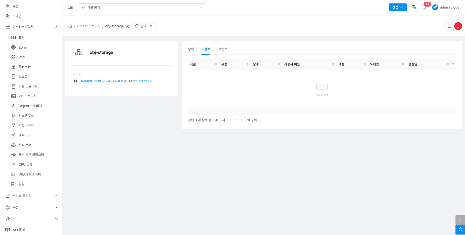 - Object 스토리지 목록을 확인하는 화면입니다.