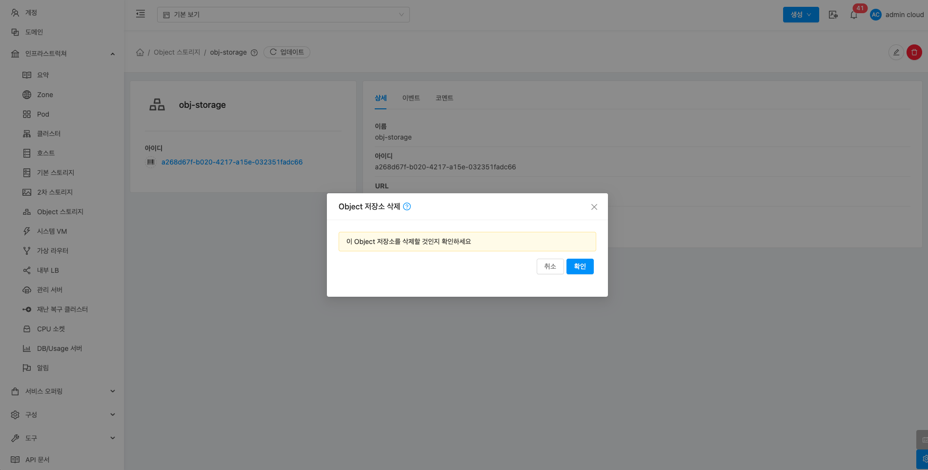 - 확인 버튼을 클릭하여 Object 스토리지를 삭제합니다.