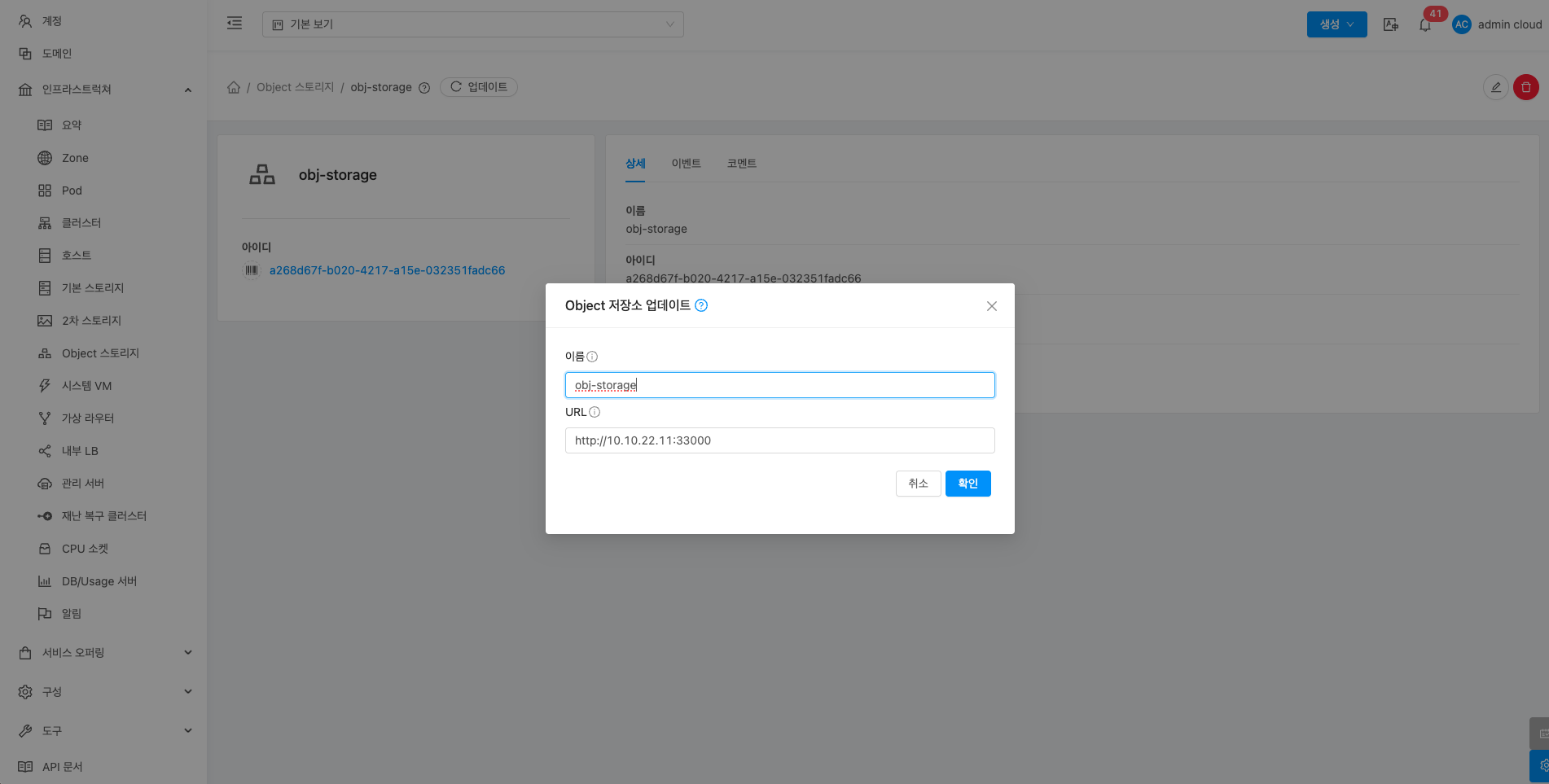 - 확인 버튼을 클릭하여 Object 스토리지를 업데이트합니다.
