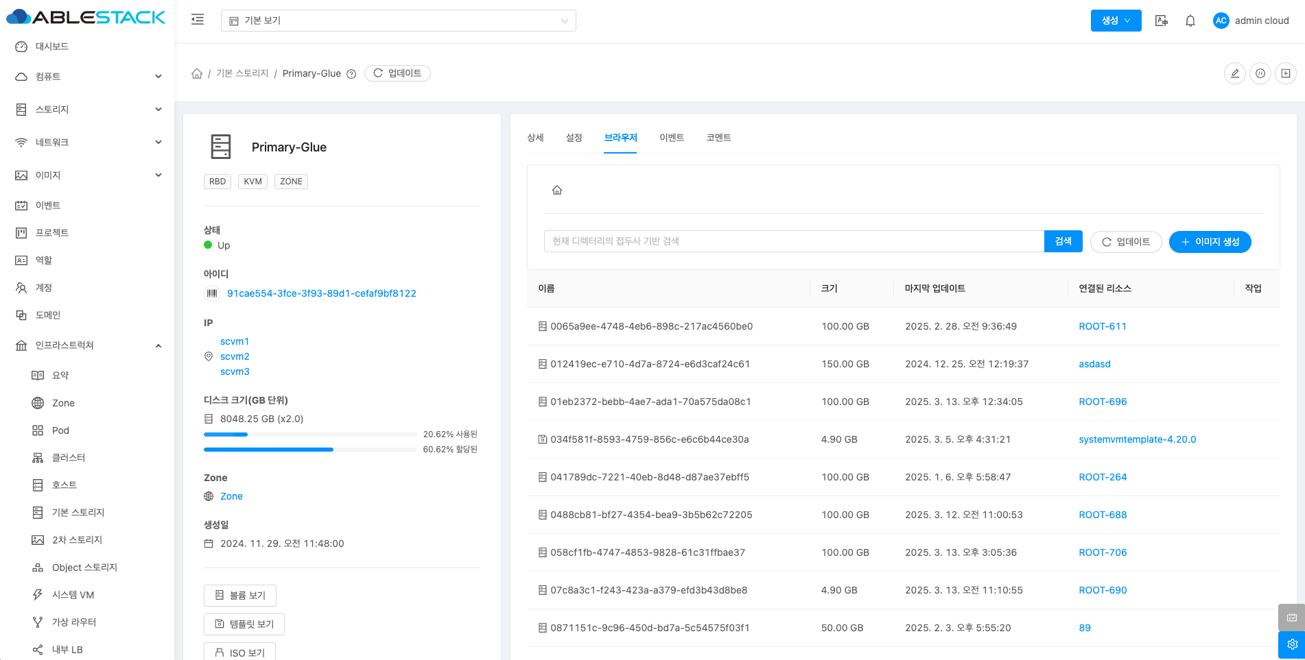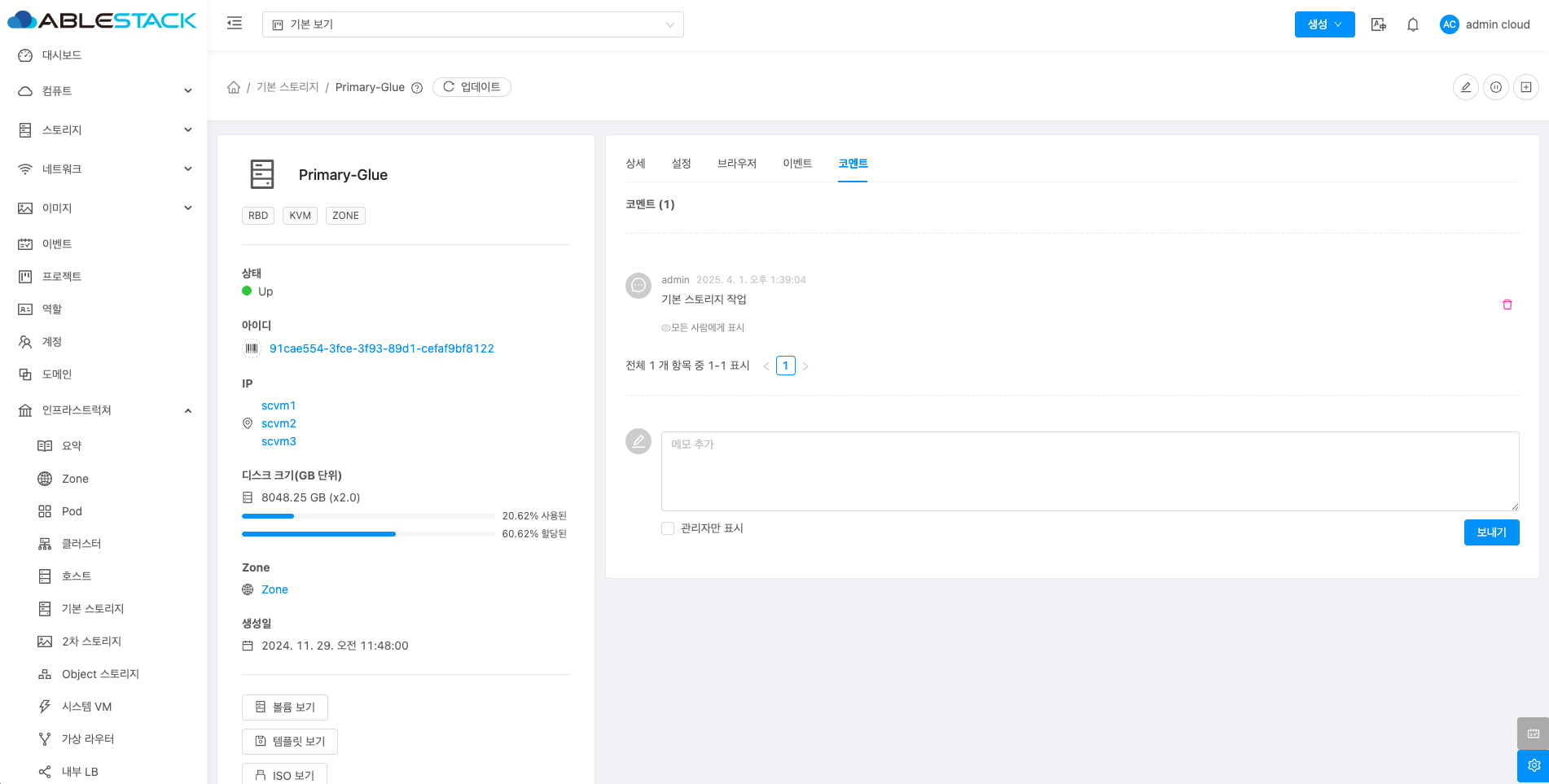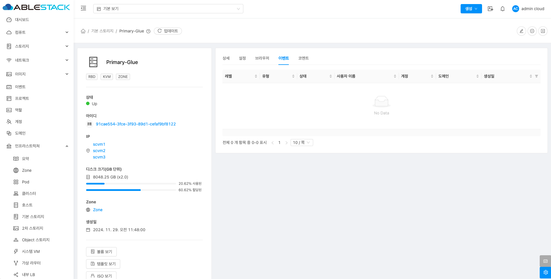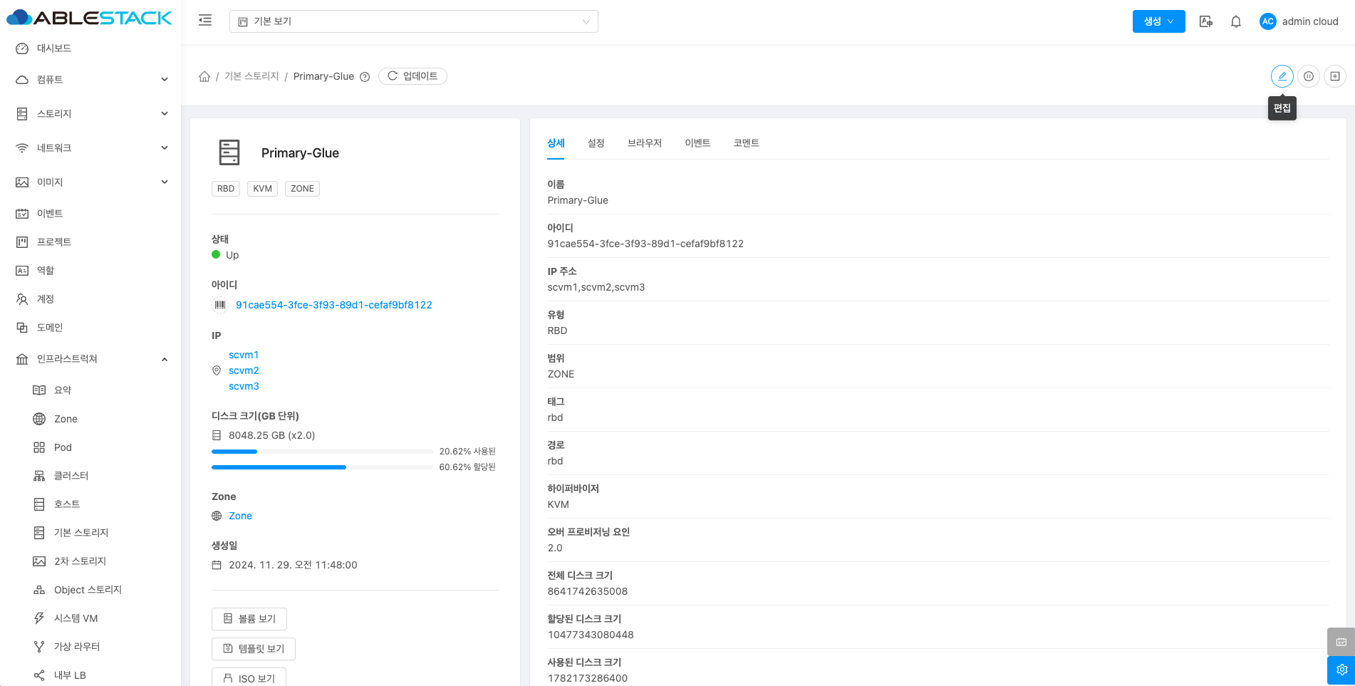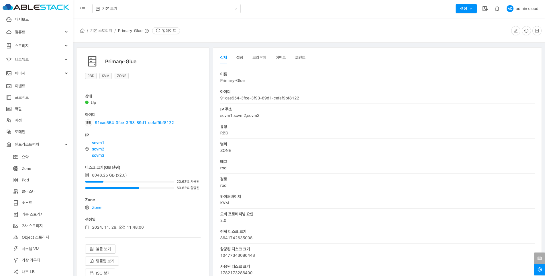 기본 스토리지에 대한 상세정보를 조회하는 화면입니다. 해당 기본 스토리지의 이름, 아이디, IP 주소, 유형, 범위, 태그, 경로, 하이퍼바이저, 오버 프로비저닝 요인, 전체 디스크 크기, 할당된 디스크 크기, 사용된 디스크 크기, Zone, 생성일 등의 정보를 확인할 수 있습니다.