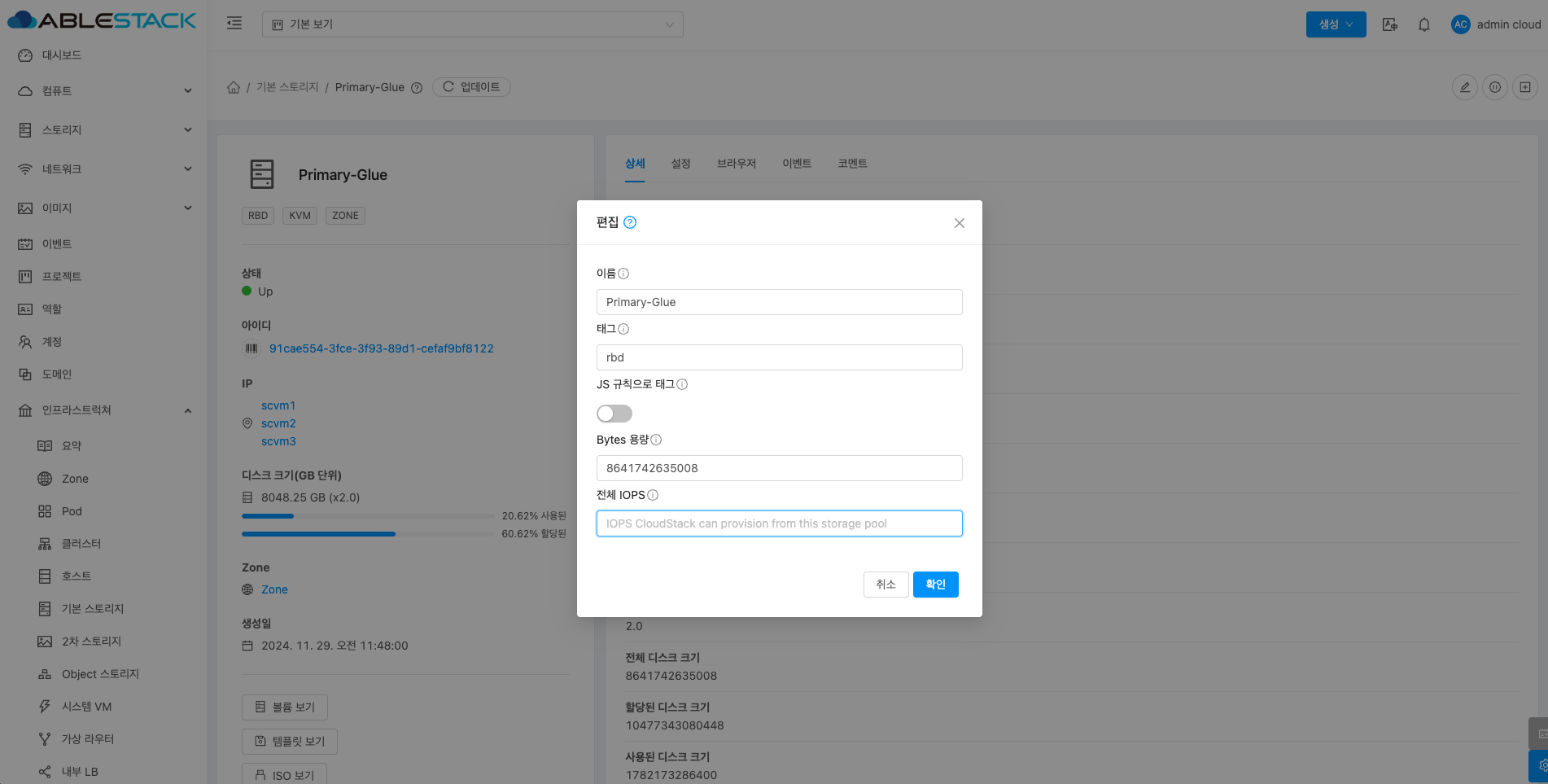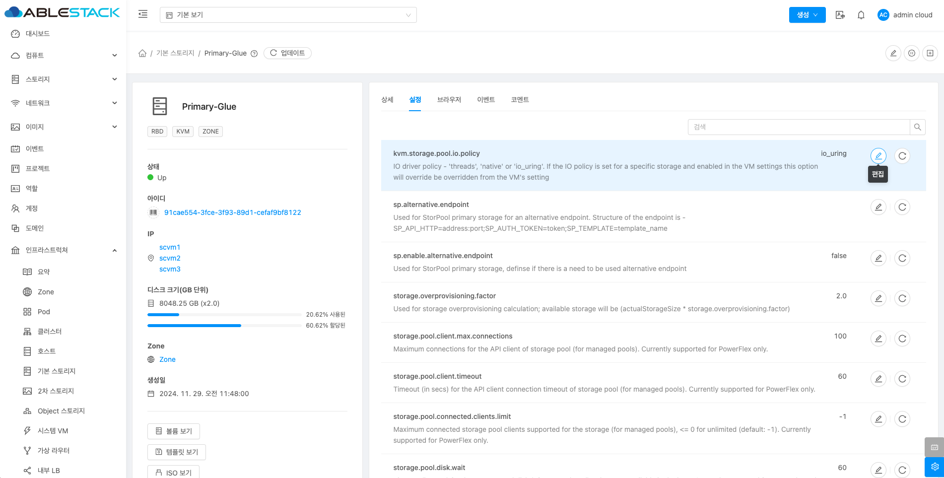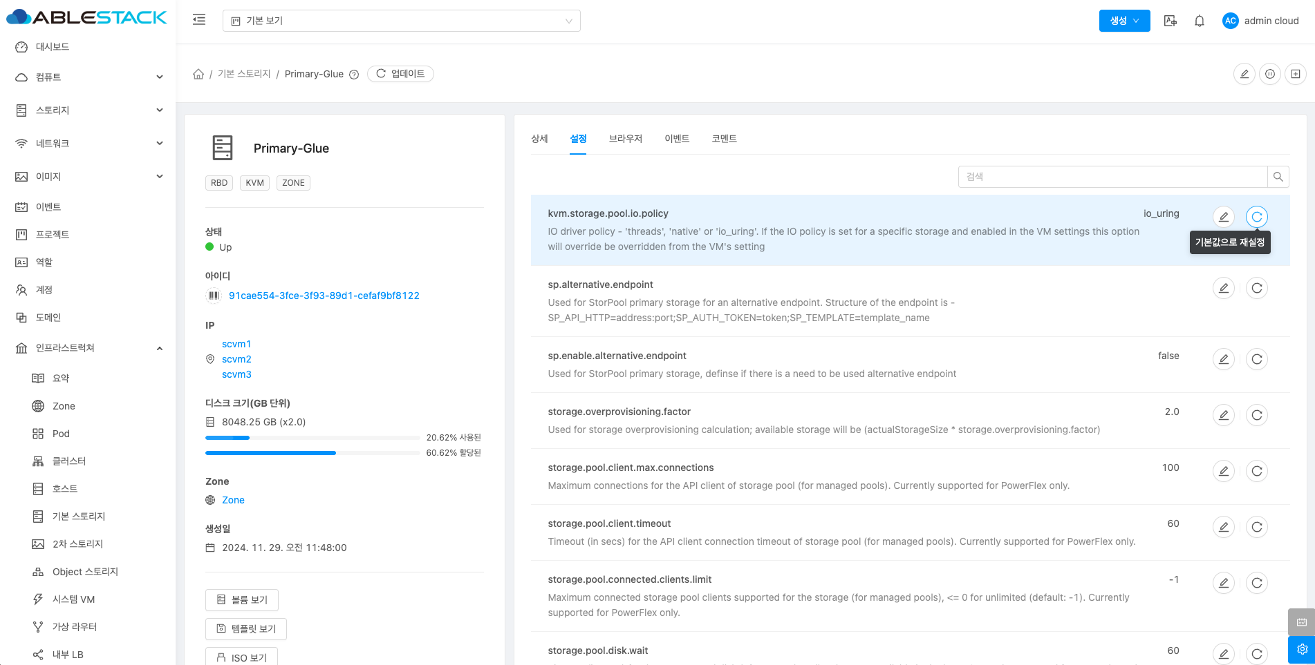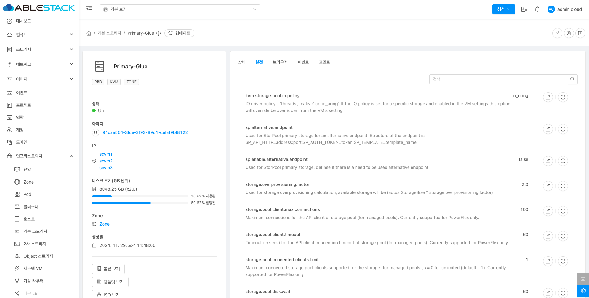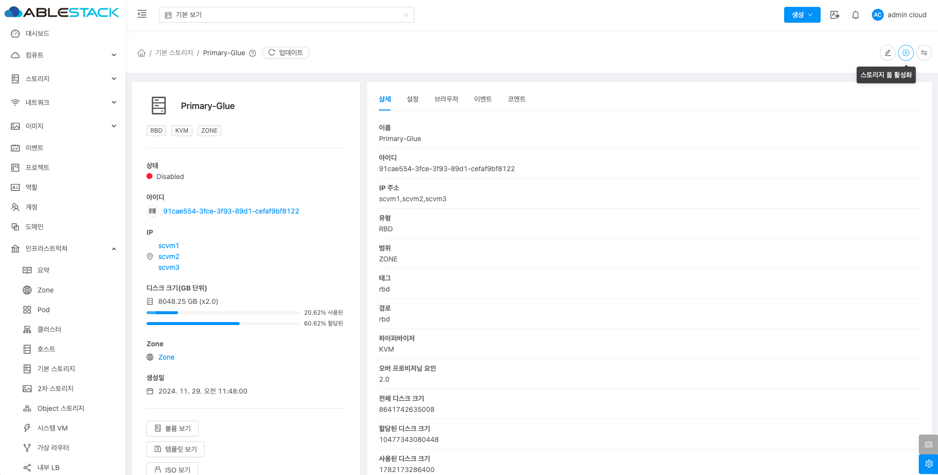 기본 스토리지에 대한 상세정보를 조회하는 화면입니다. 해당 기본 스토리지의 이름, 아이디, IP 주소, 유형, 범위, 태그, 경로, 하이퍼바이저, 오버 프로비저닝 요인, 전체 디스크 크기, 할당된 디스크 크기, 사용된 디스크 크기, Zone, 생성일 등의 정보를 확인할 수 있습니다.