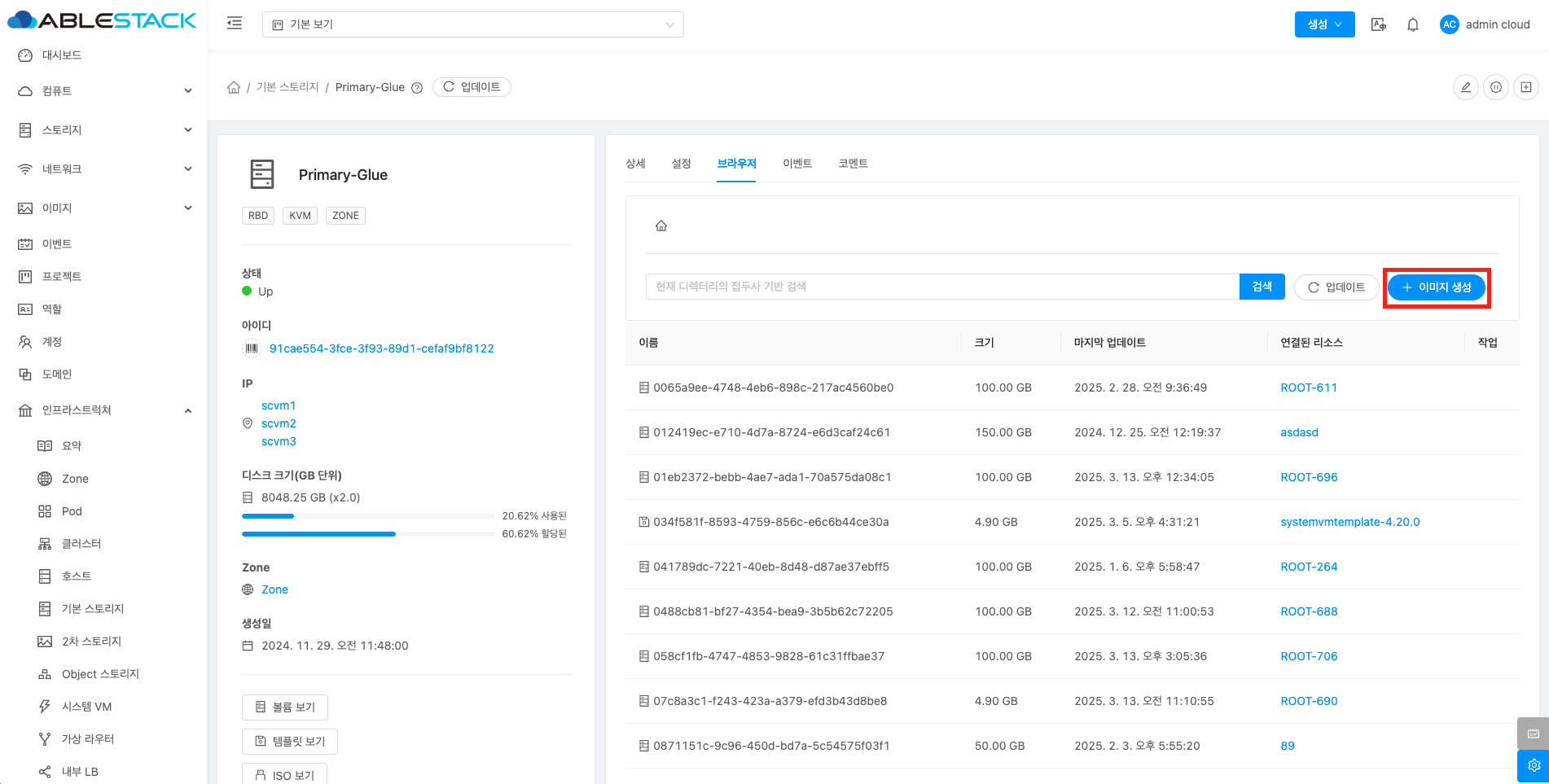 이미지 생성은 Glue Block 스토리지인 경우에만 활성화 됩니다.