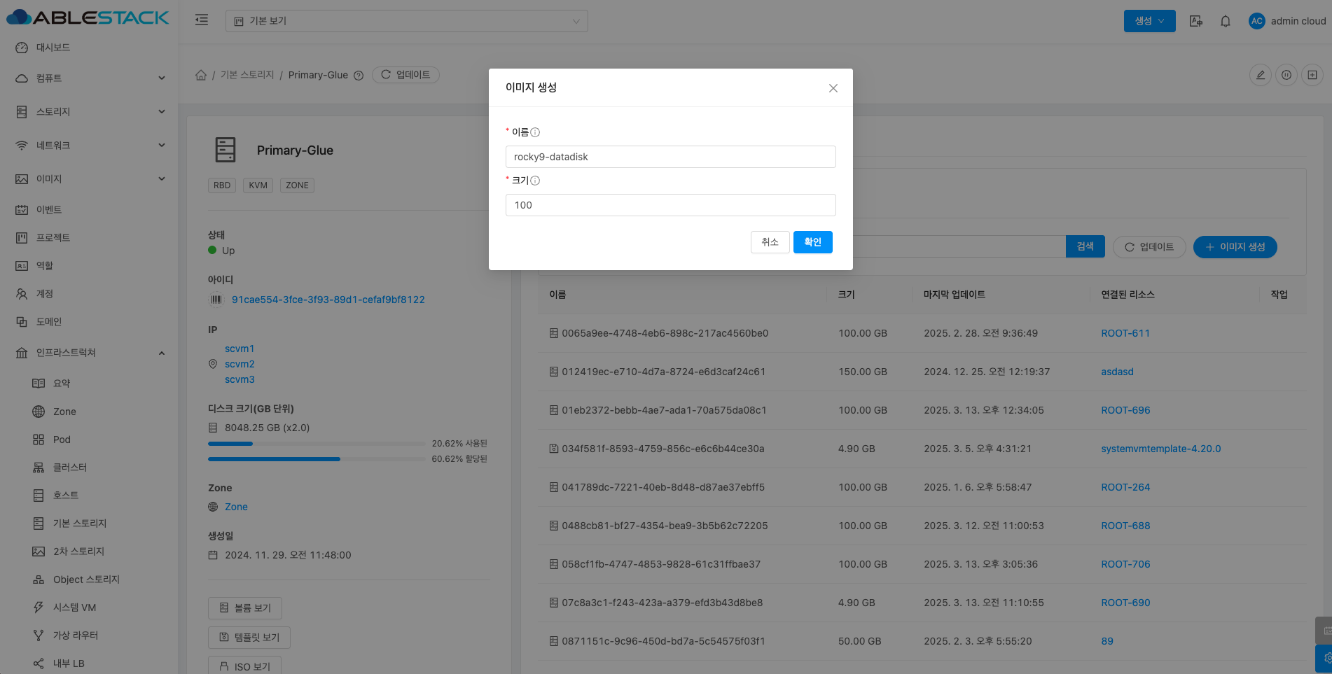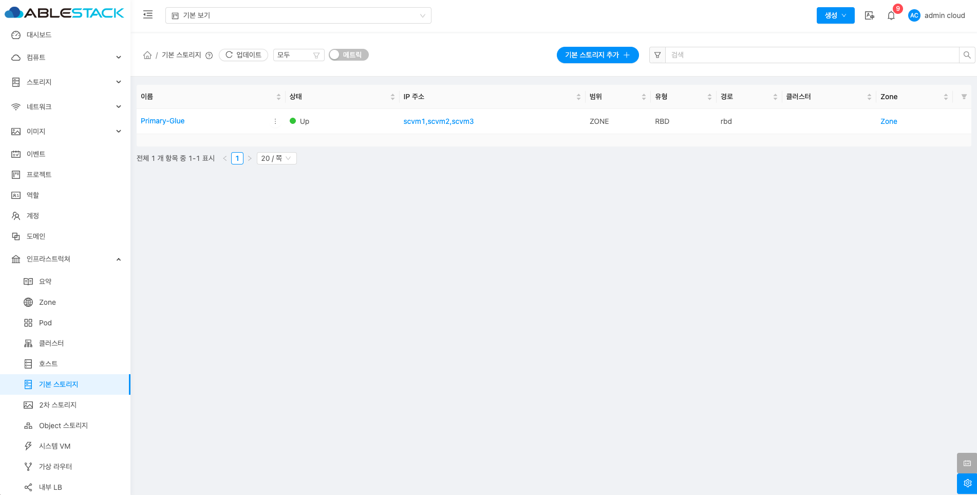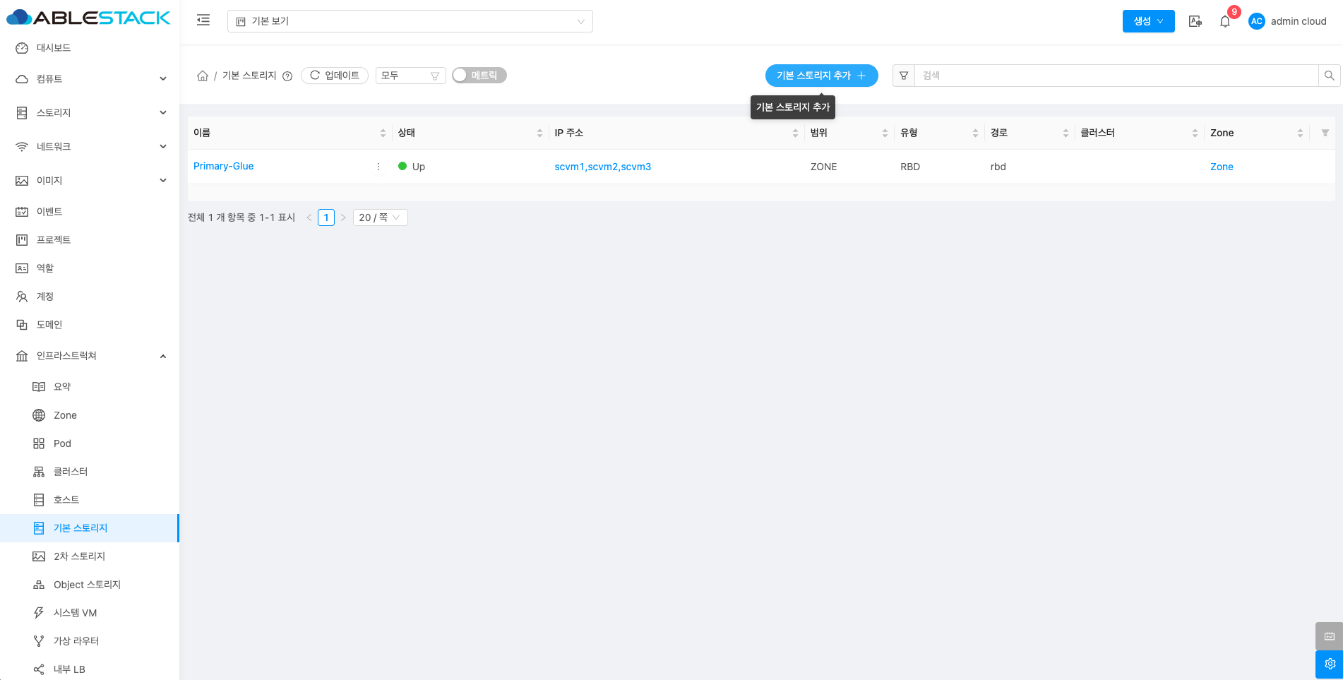 기본 스토리지 추가 버튼을 클릭하여 기본 스토리지 추가 팝업을 호출합니다.