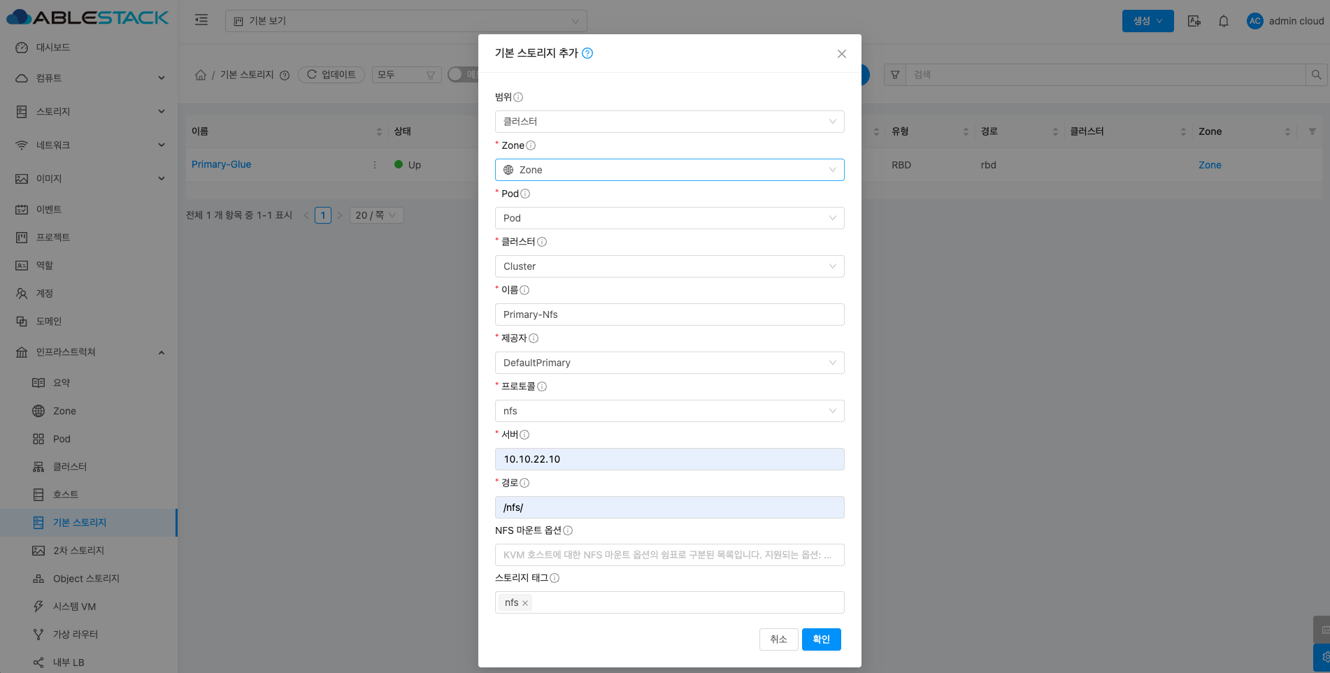 아래 기본 스토리지 추가 화면 이미지는 nfs 추가 방식이며, 스토리지 유형에 따라 입력값은 달라질 수 있습니다.