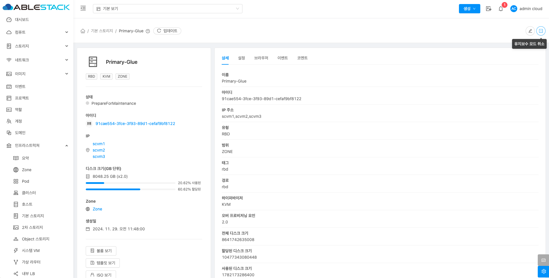 해당 기본 스토리지의 유지보수 모드를 비활성화합니다.