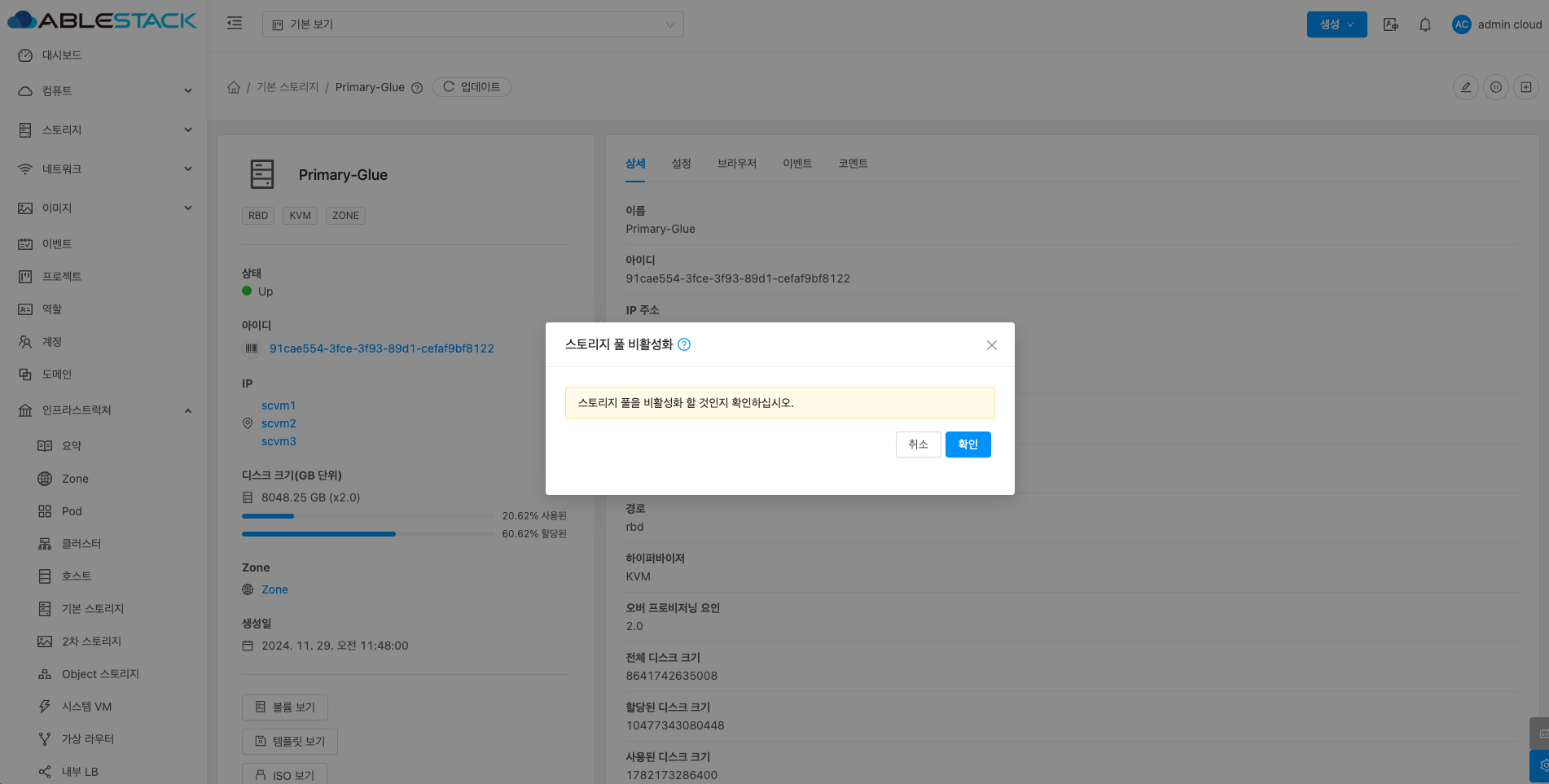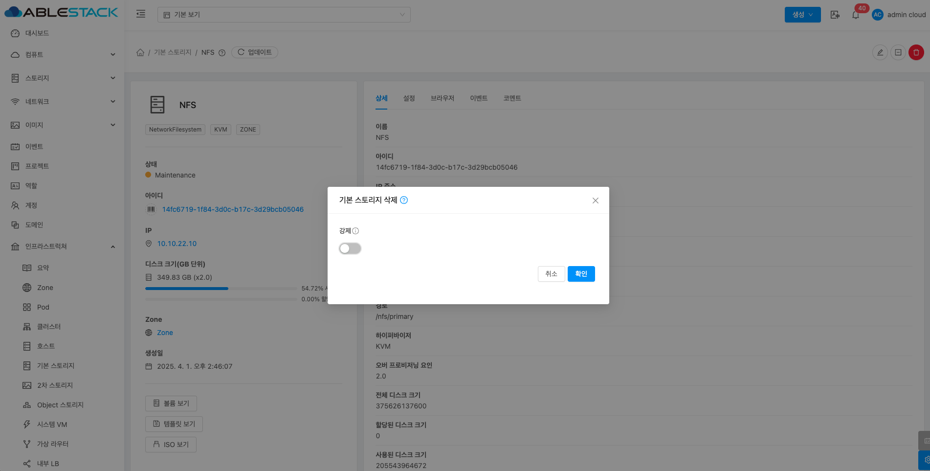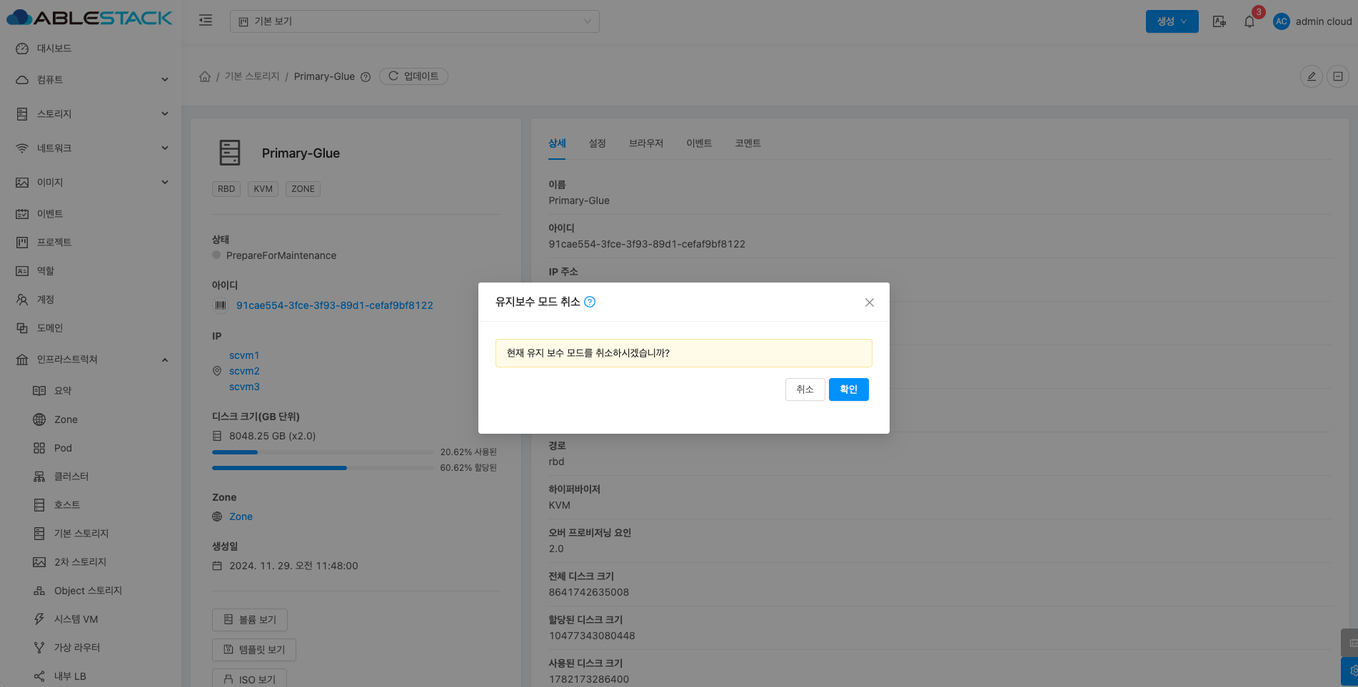 기본스토리지 유지보수 모드를 실행할 경우 해당 스토리지를 사용하는 가상머신을 모두 정지시킵니다. 확인후 작업이 필요합니다.