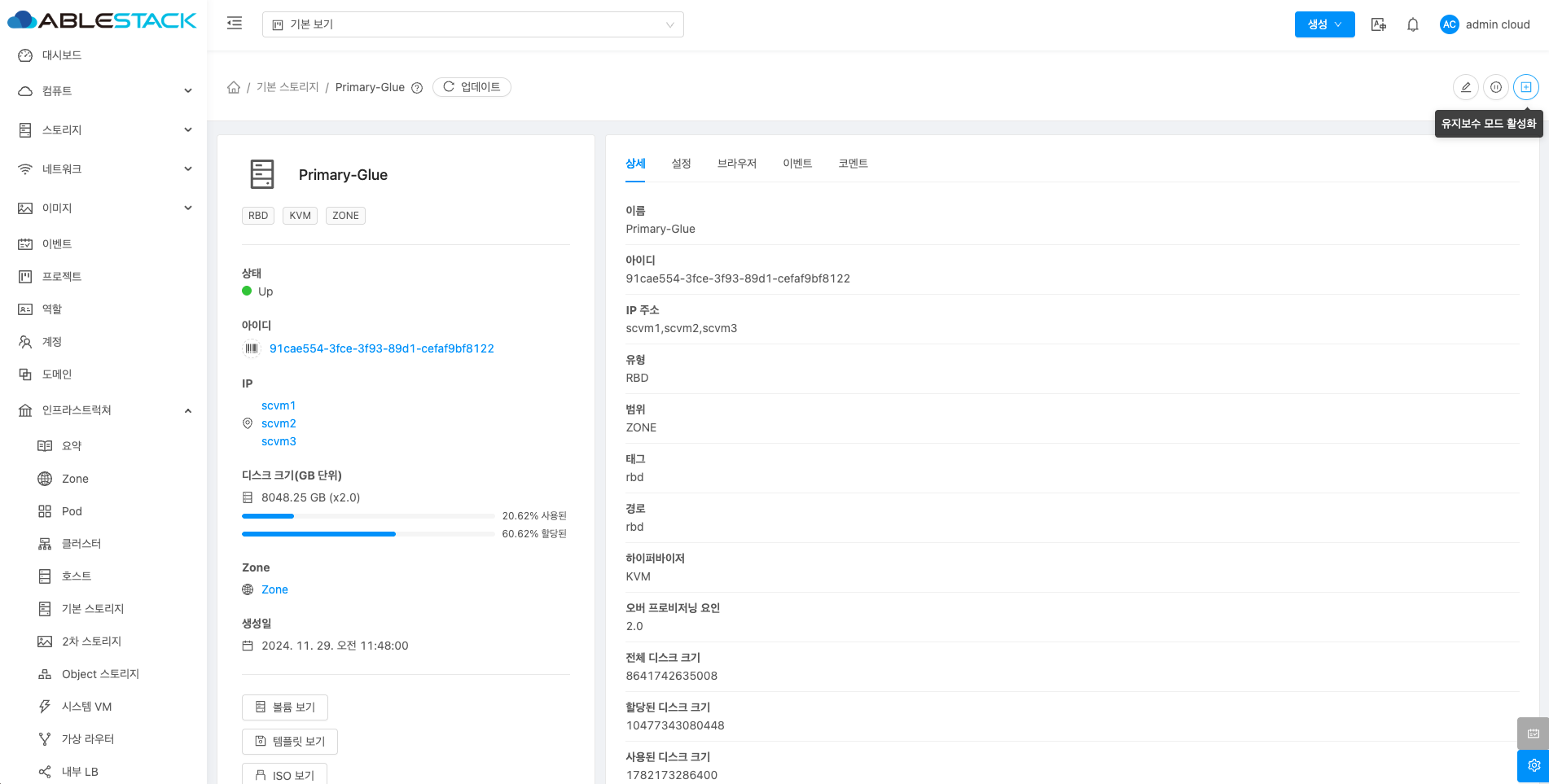 해당 기본 스토리지의 유지보수 모드를 활성화합니다.