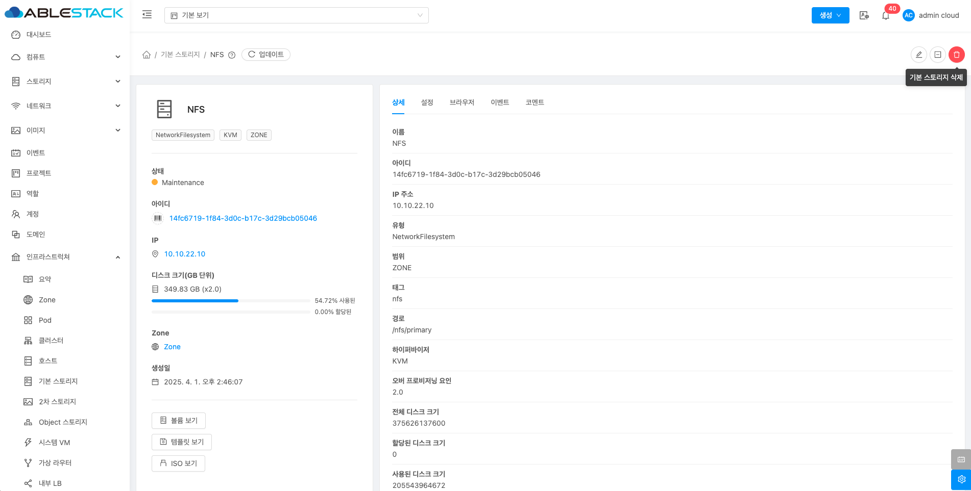 기본 스토리지 유지보수 모드를 설정해야 삭제 버튼이 활성화됩니다.