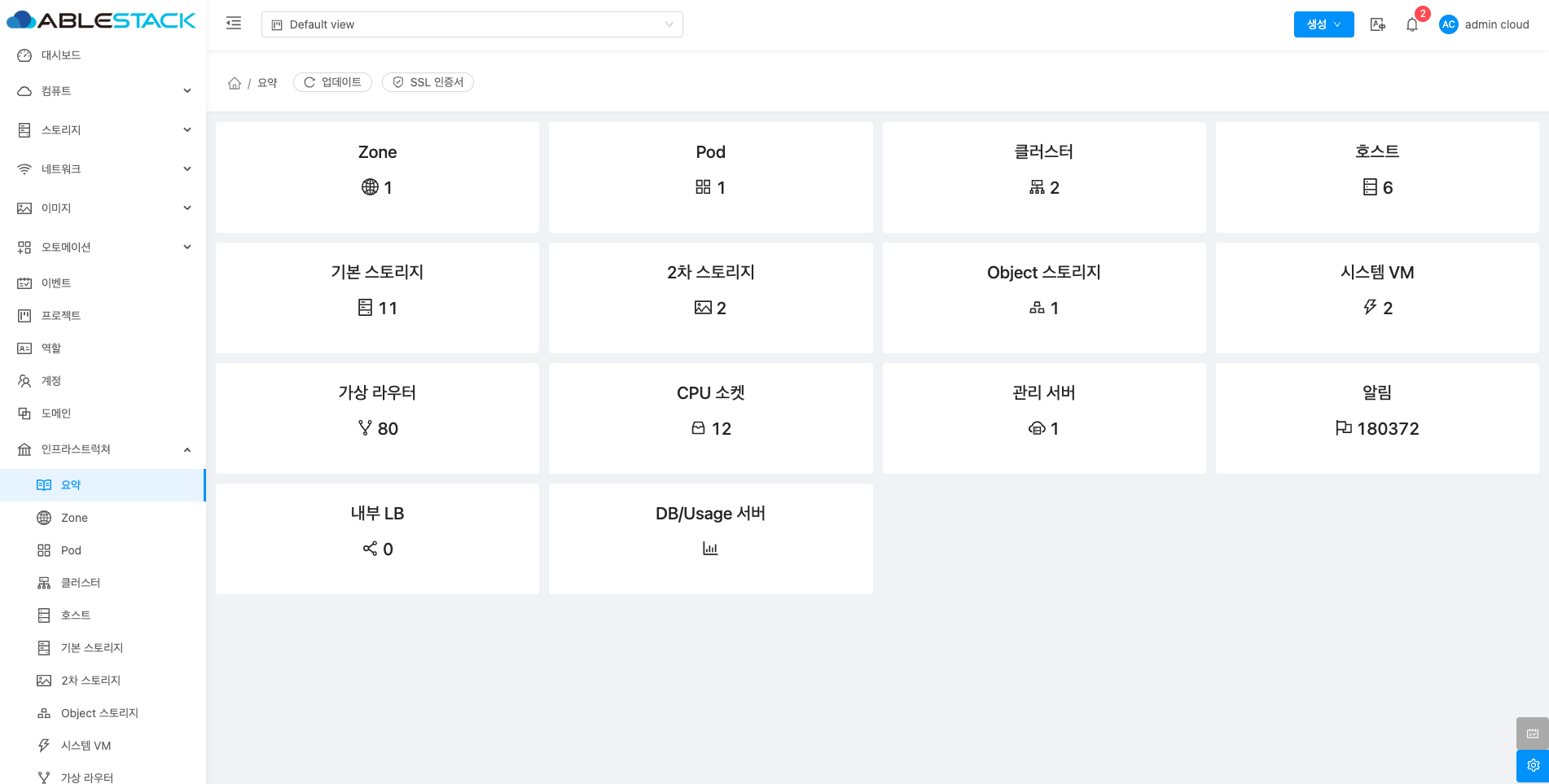 ABLESTACK의 인프라스트럭처 전반적인 상태 및 현황을 한눈에 보여주는 대시보드입니다. 이 기능은 사용자가 클라우드 환경의 주요 리소스를 효율적으로 관리할 수 있도록 도와줍니다. 각 구성요소 ( Zones, Pods, Clusters, Hosts, Primary storage, Secondary storage, Object Storage, System VMs, Virtual routers, CPU sockets, Management servers, Alerts, Internal LB, DB/Usage server ) 의 수를 확인할 수 있습니다.