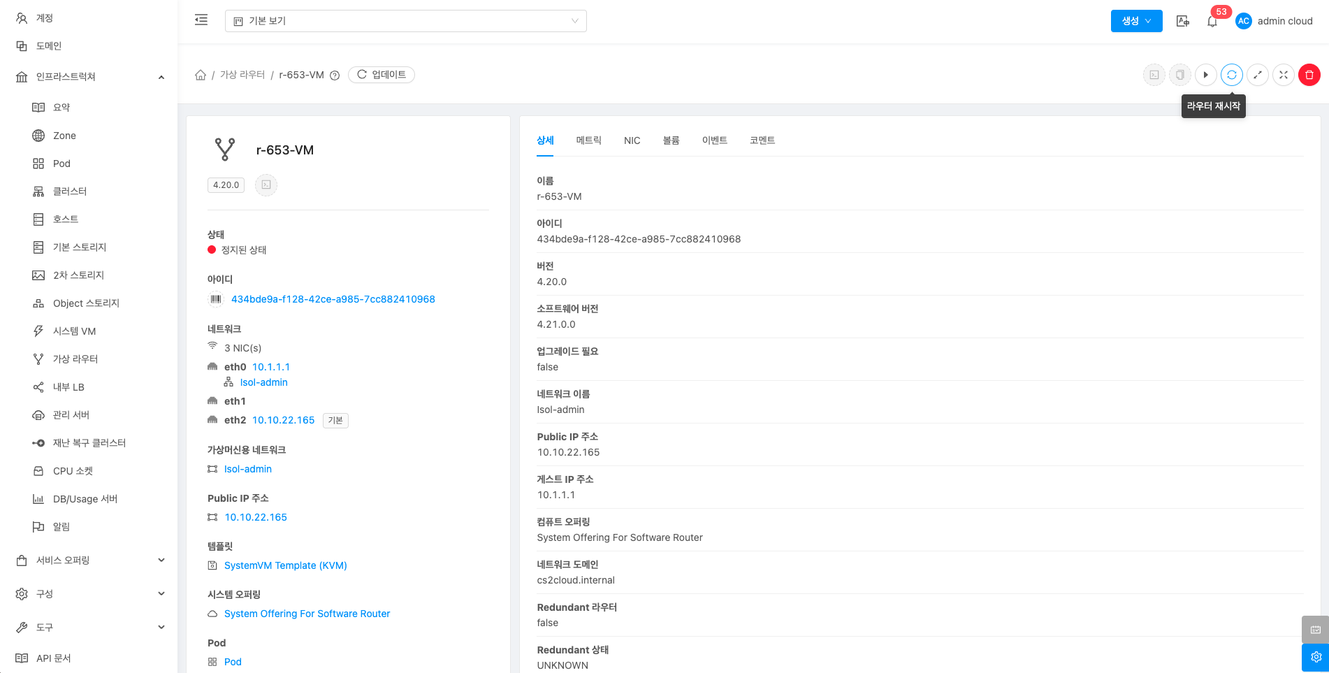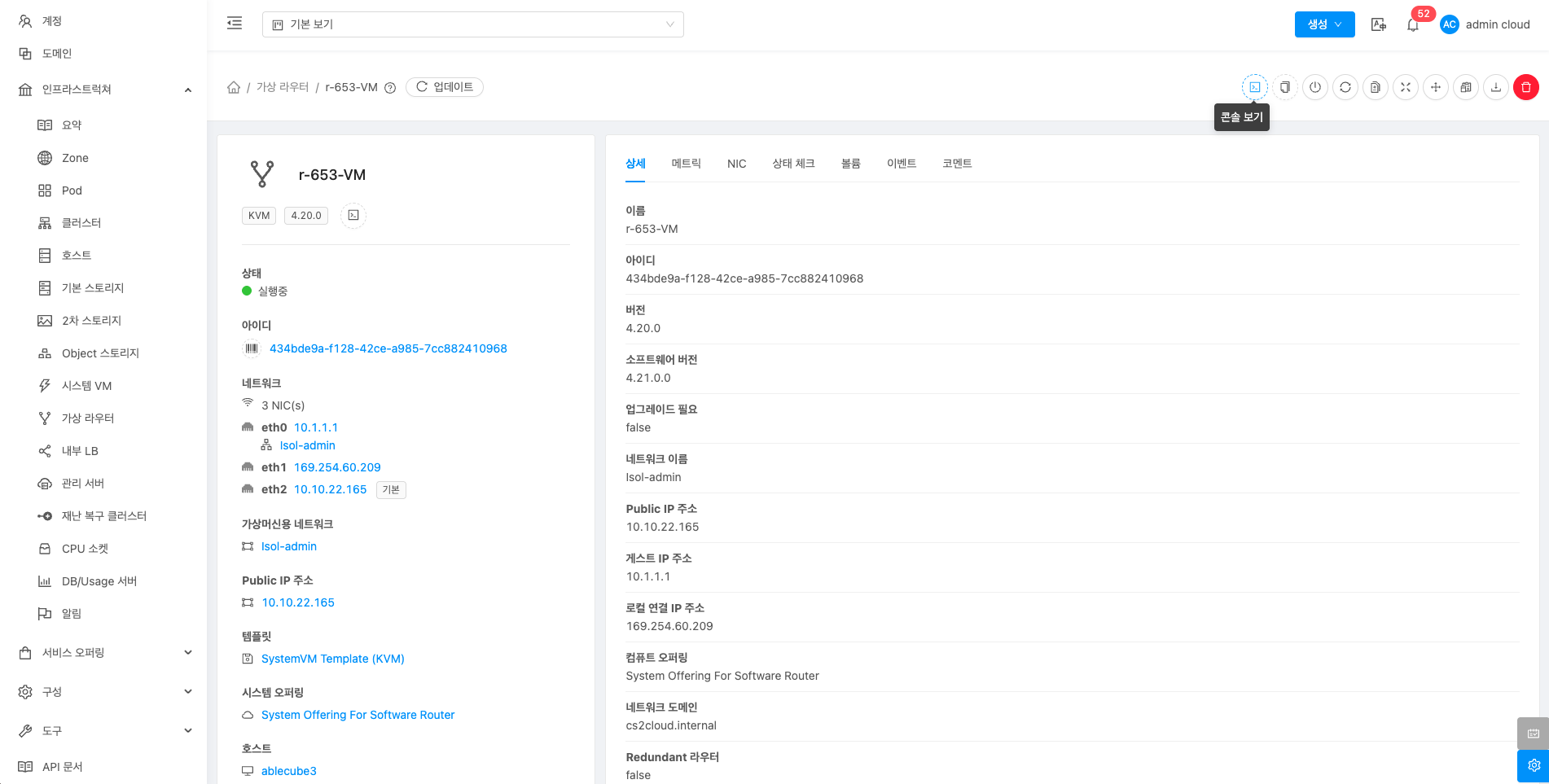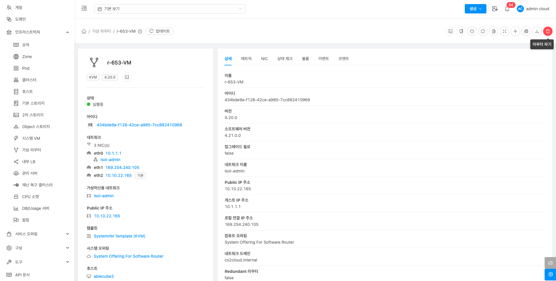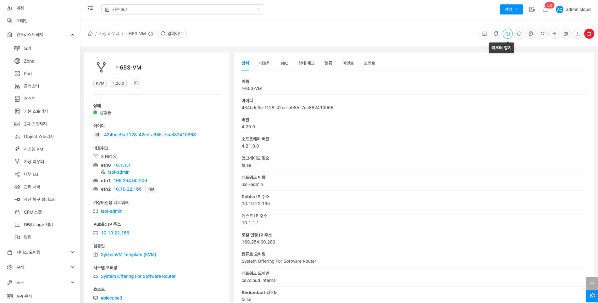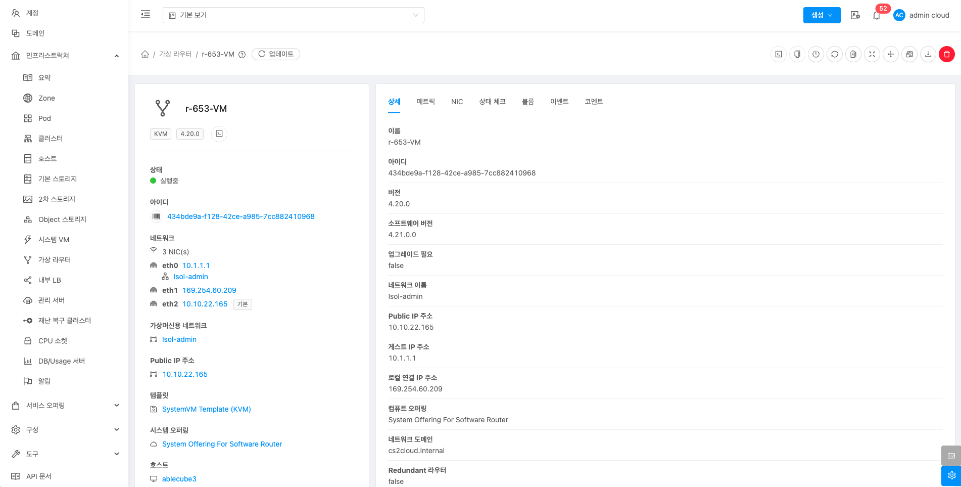 가상 라우터에 대한 상세정보를 조회하는 화면입니다. 해당 가상 라우터의 이름, 아이디, 버전, 소프트웨어 버전, 업그레이드 필요, 네트워크 이름, Public IP 주소, 게스트 IP 주소, 로컬 연결 IP 주소, 컴퓨트 오퍼링, 네트워크 도메인, Redundant 라우터, Redundant 상태, 호스트, 계정, Zone, 생성일, 제어 영역 상태 등의 정보를 확인할 수 있습니다.